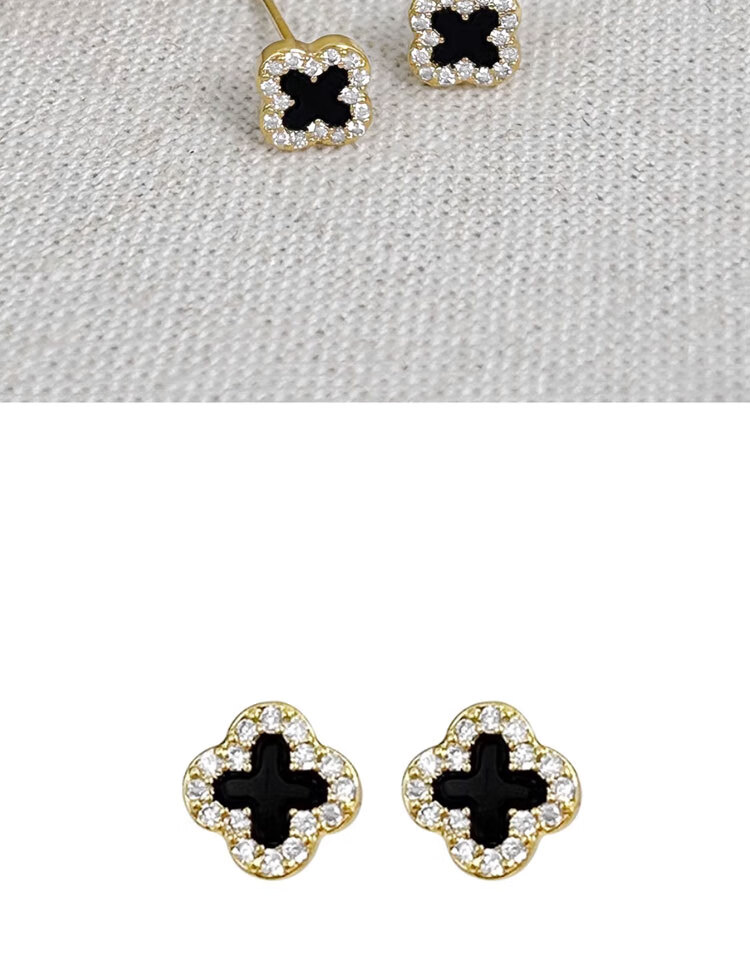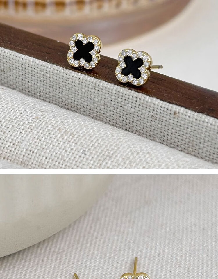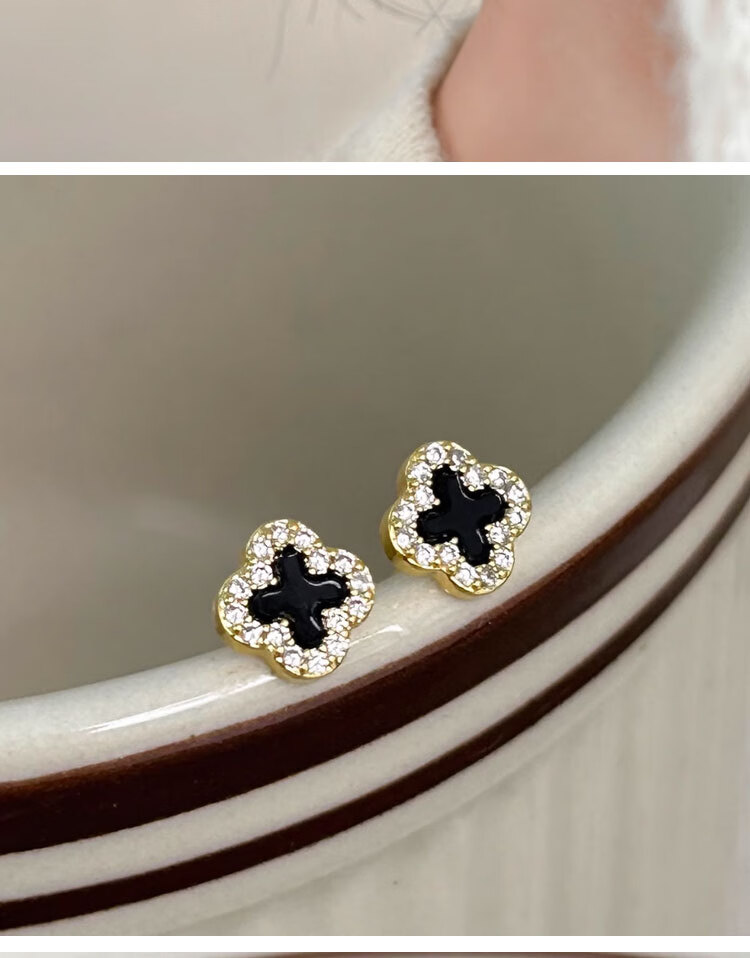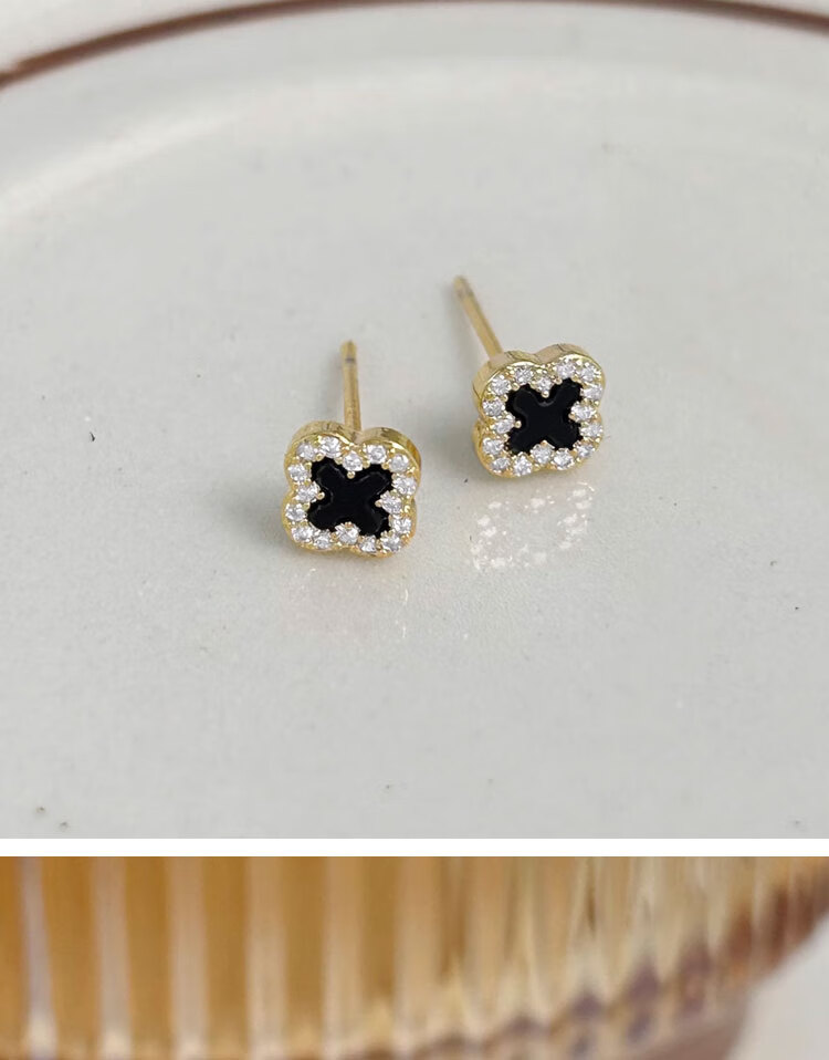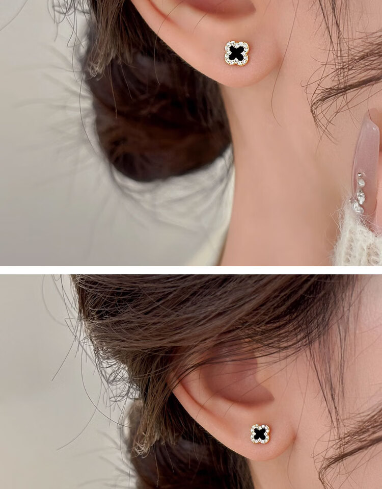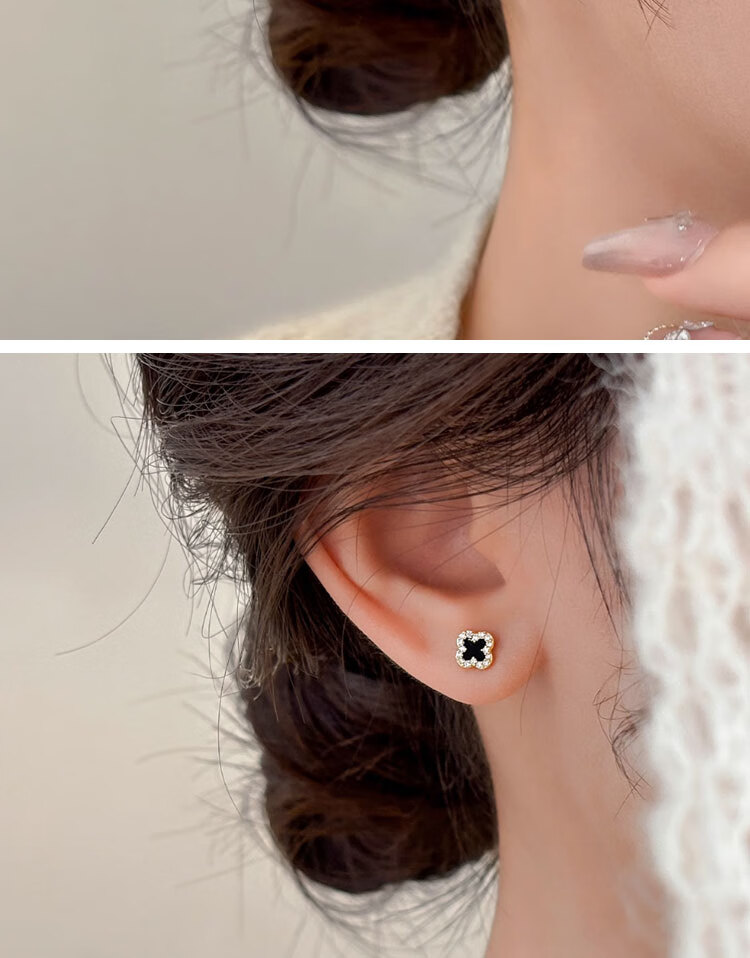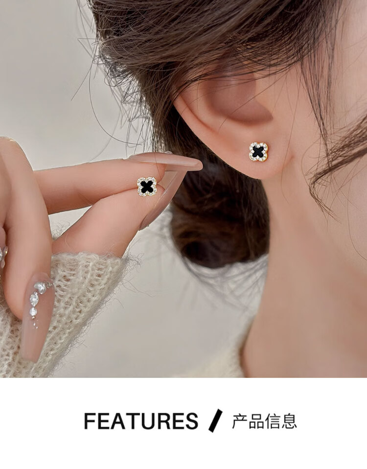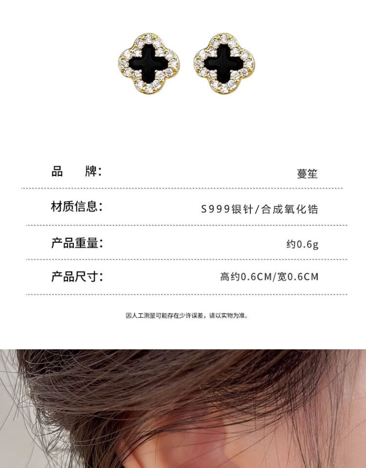 Mansheng S999 sterling silver needle black four-leaf clover earrings for women, high-end earrings, small and pierced ears, exquisite and non-allergenic earrings, S999 sterling silver needle, black four-leaf clover earrings, single
