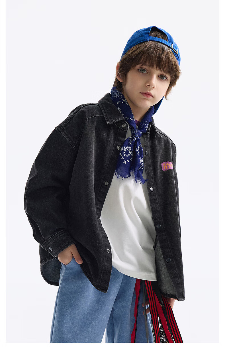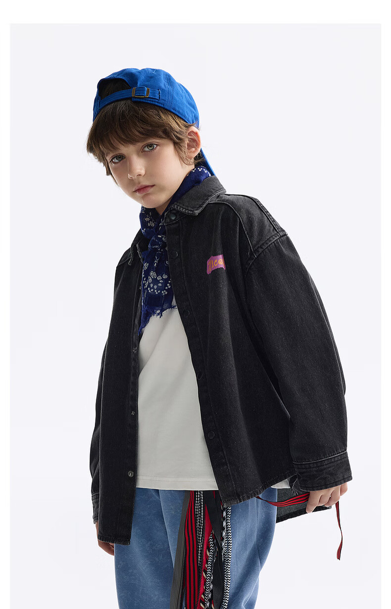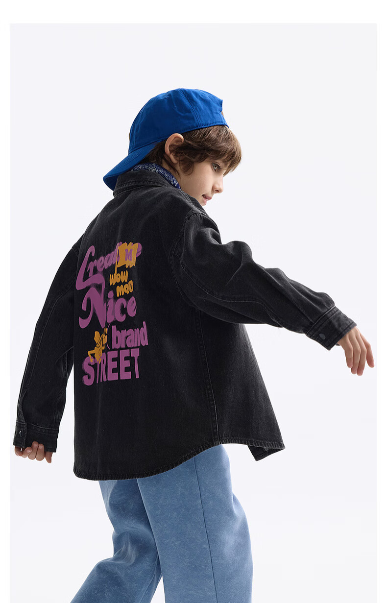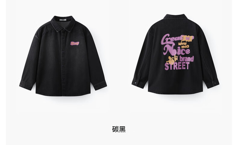 MQD MQD children's clothing children's shirt spring new lapel long-sleeved washed denim shirt fashion printed top carbon black 140