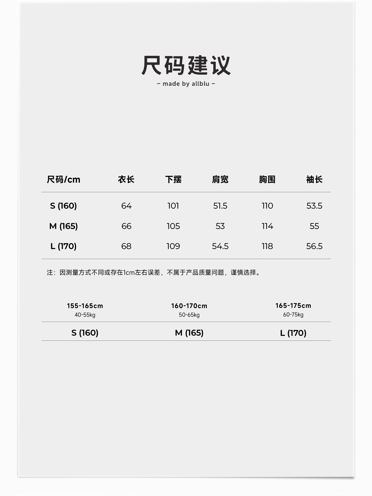 China (cm) 160-165/84-86 165-170 / 88-90 167-172 / 92-96 168-173 / 98-102 170-176 / 106-110