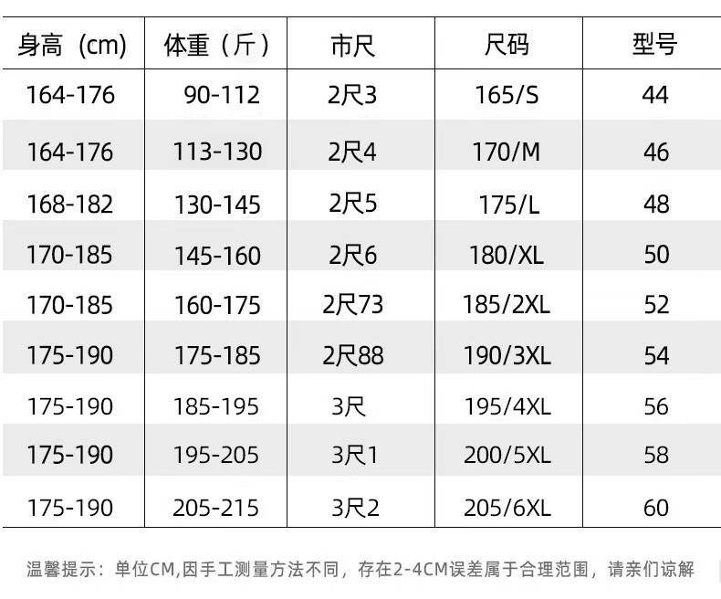 China (cm) 165 / 88-90 170 / 96-98 175 / 108-110 180 / 118-122 185 / 126-130