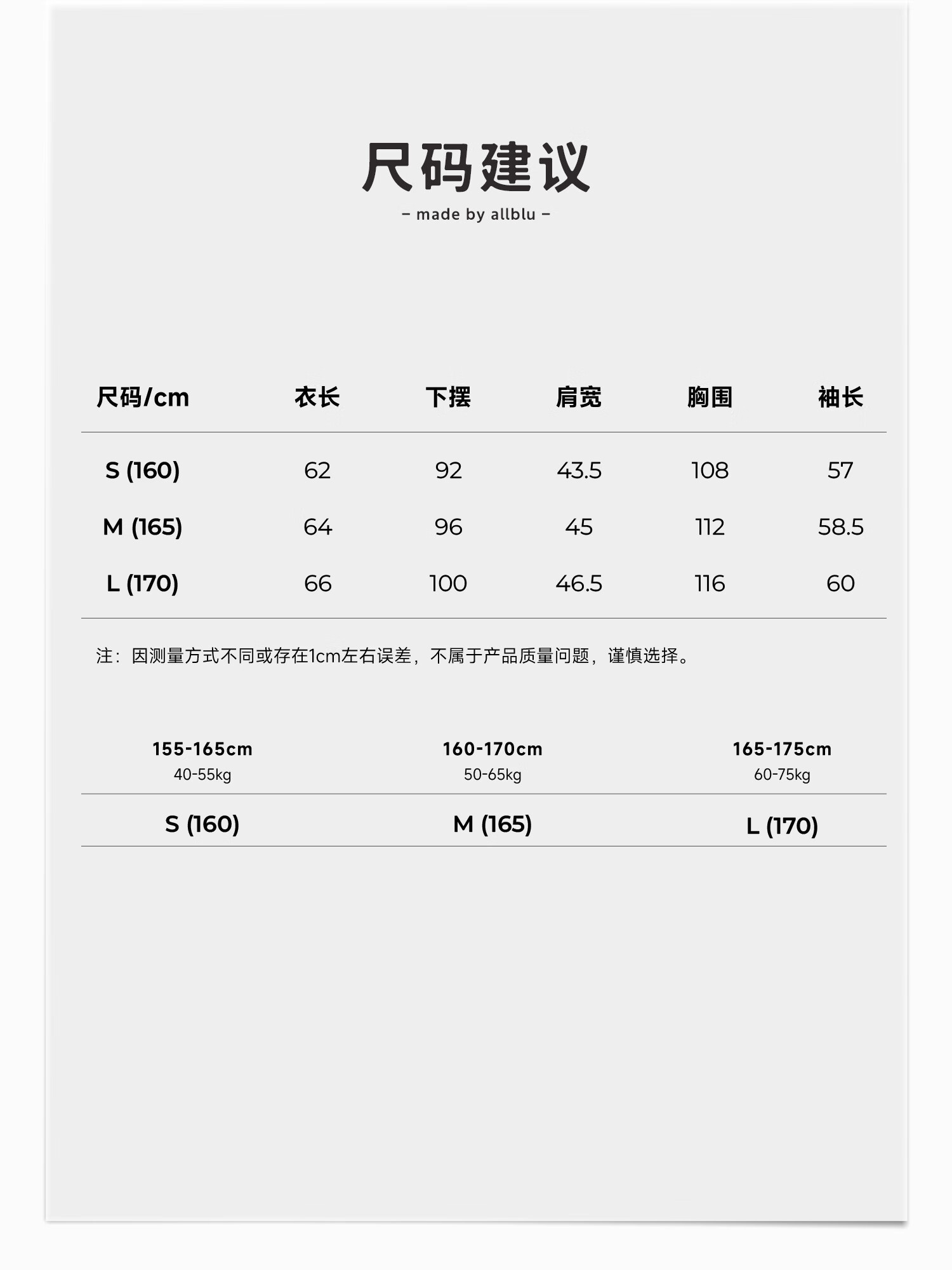 China (cm) 160-165/84-86 165-170 / 88-90 167-172 / 92-96 168-173 / 98-102 170-176 / 106-110
