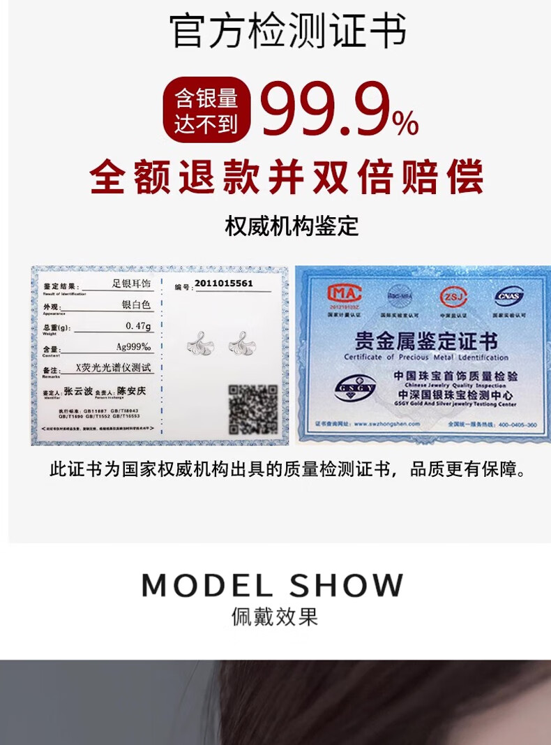 Xinshe 999 Pure Ginkgo Leaf Earrings Women's Earrings Small Pure Silver Spiral Twist Earrings High-end Simple Earrings 999 Pure Silver Flower Earrings Pair