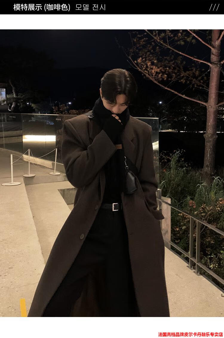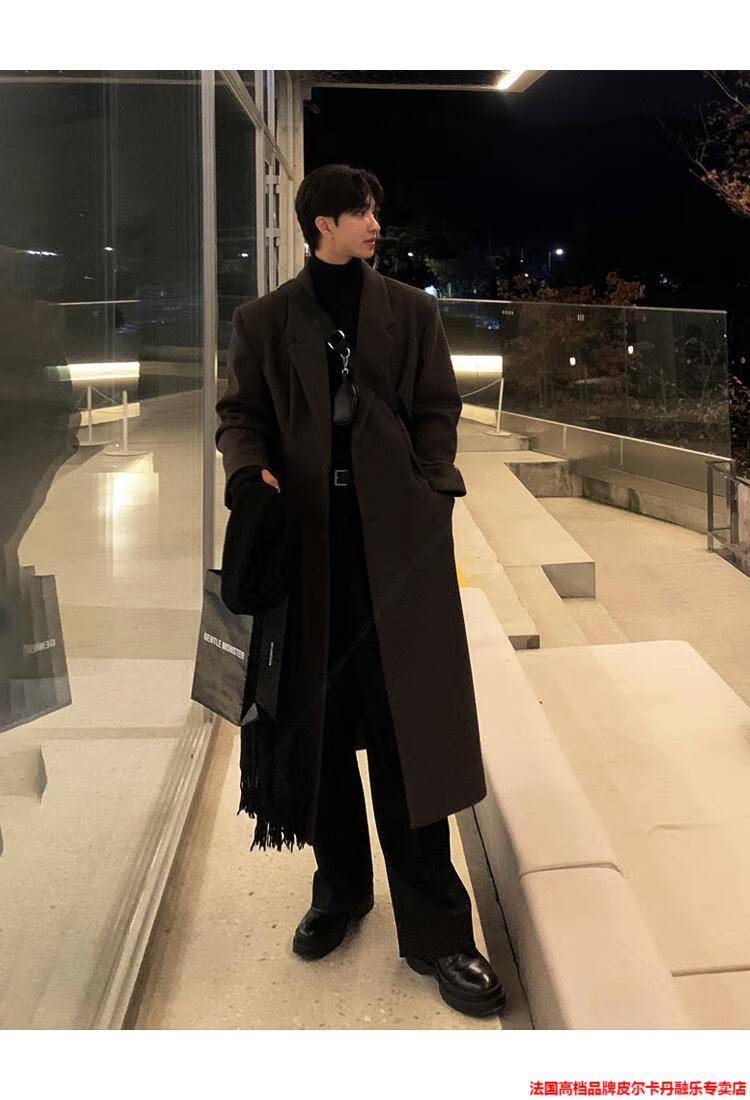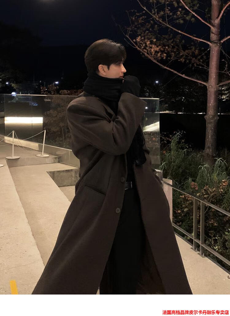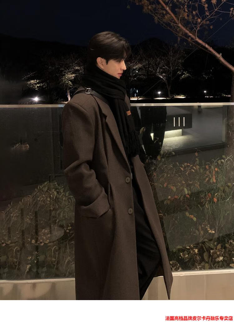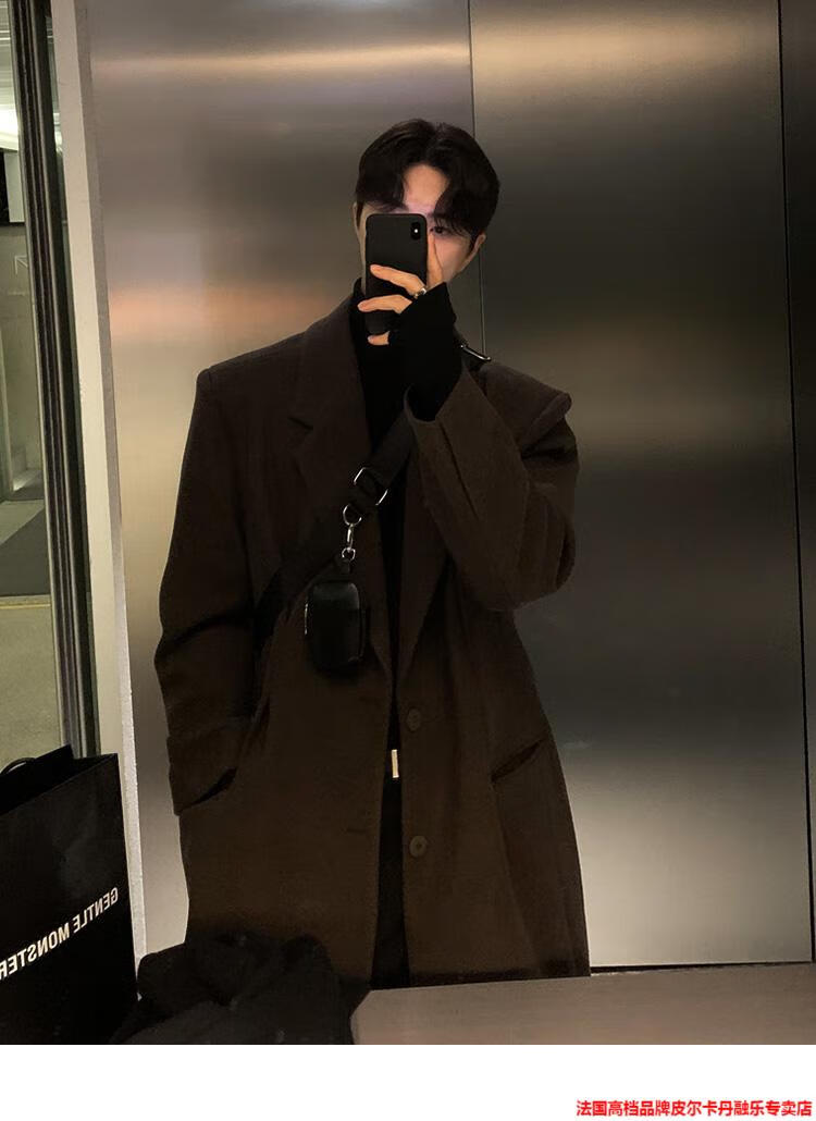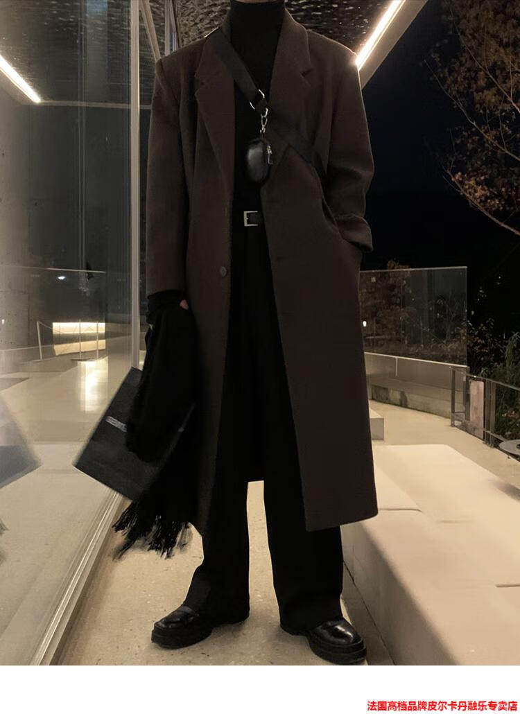 Pierre Cardin Spring and Autumn Korean Maillard Woolen Coat Men's Mid-Length Shoulder-Pad Windbreaker Over-the-Knee Loose Woolen Coat Brown (Single Lined) M