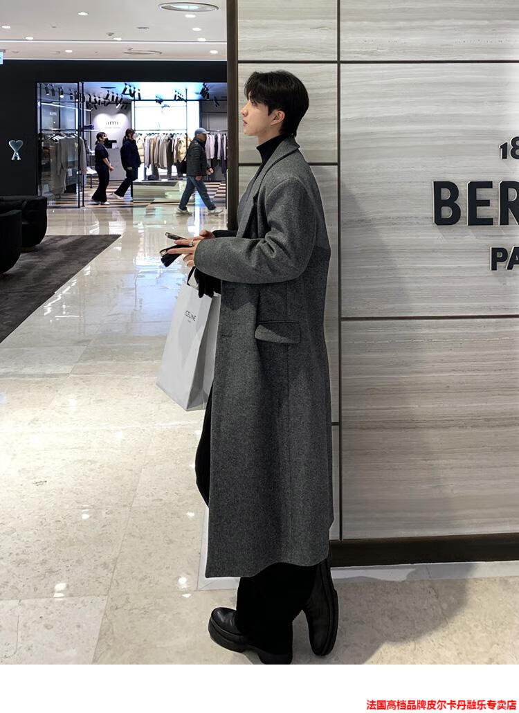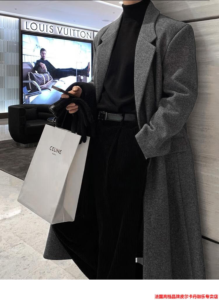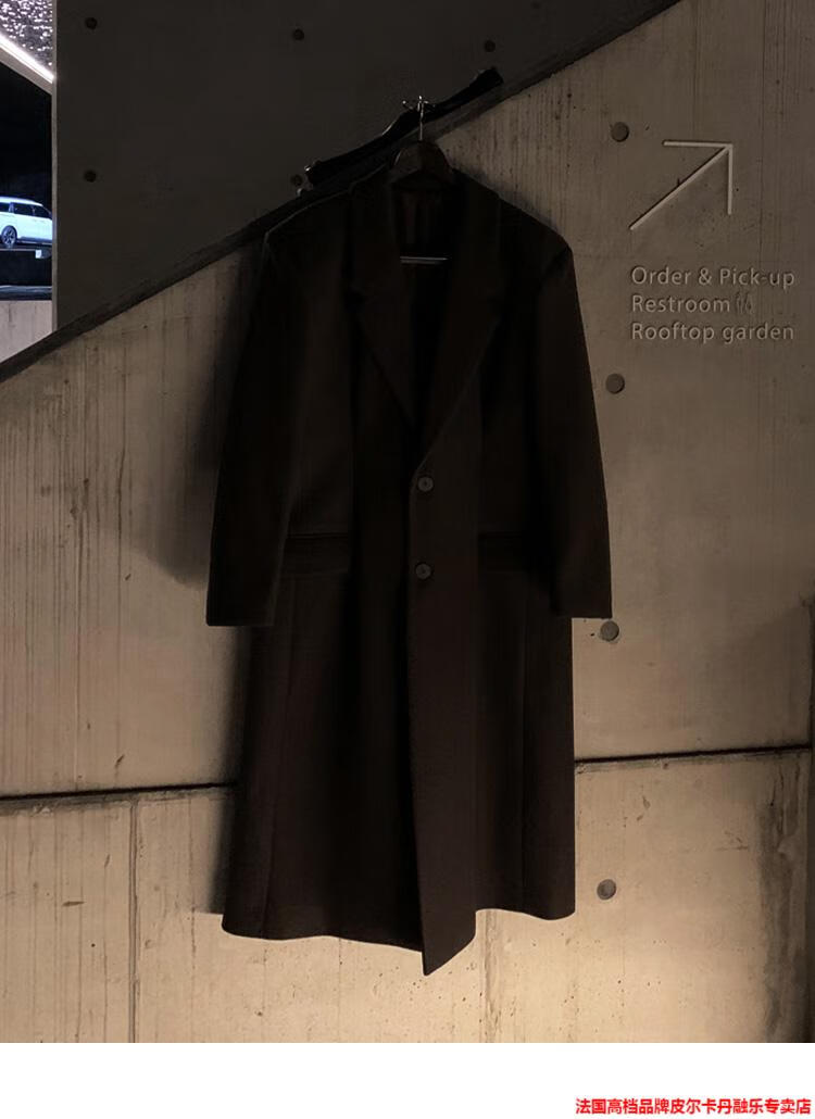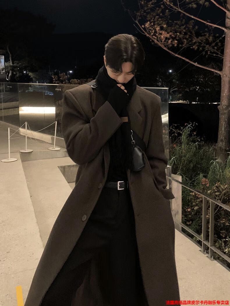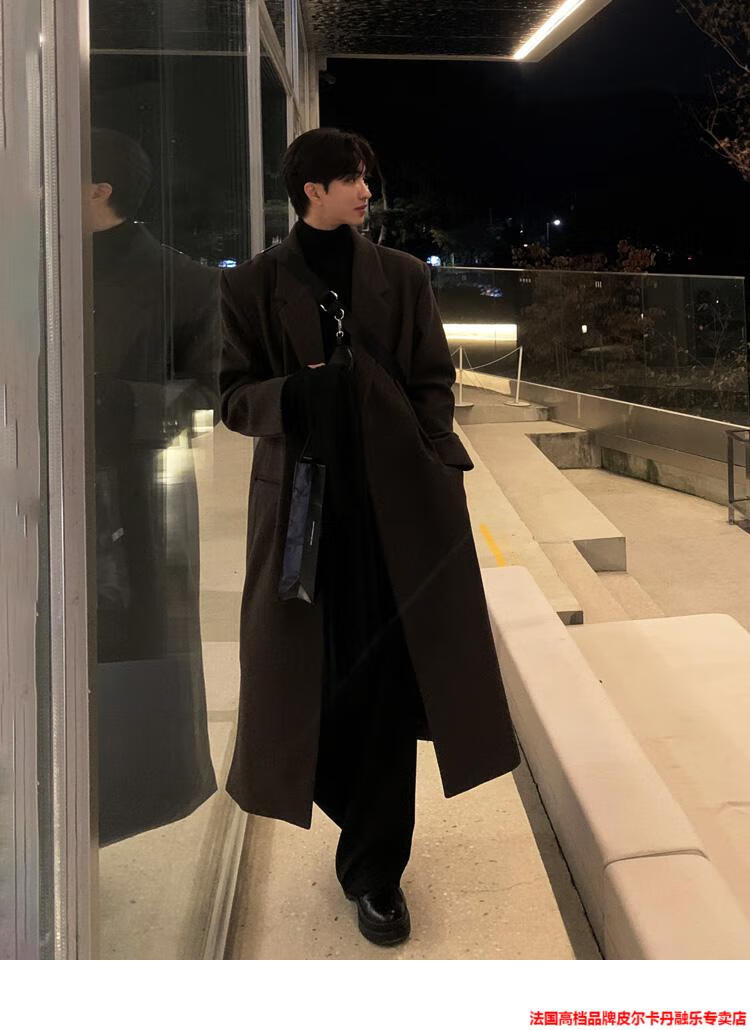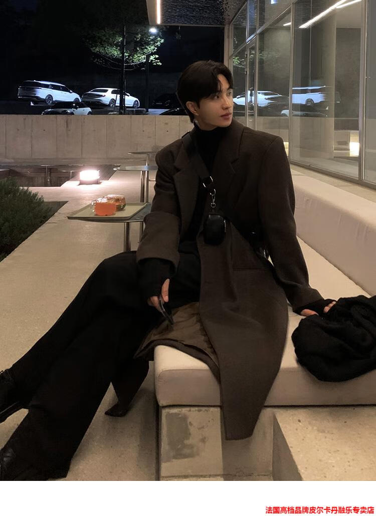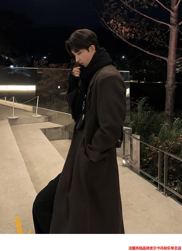 Pierre Cardin Spring and Autumn Korean Maillard Woolen Coat Men's Mid-Length Shoulder-Pad Windbreaker Over-the-Knee Loose Woolen Coat Brown (Single Lined) M