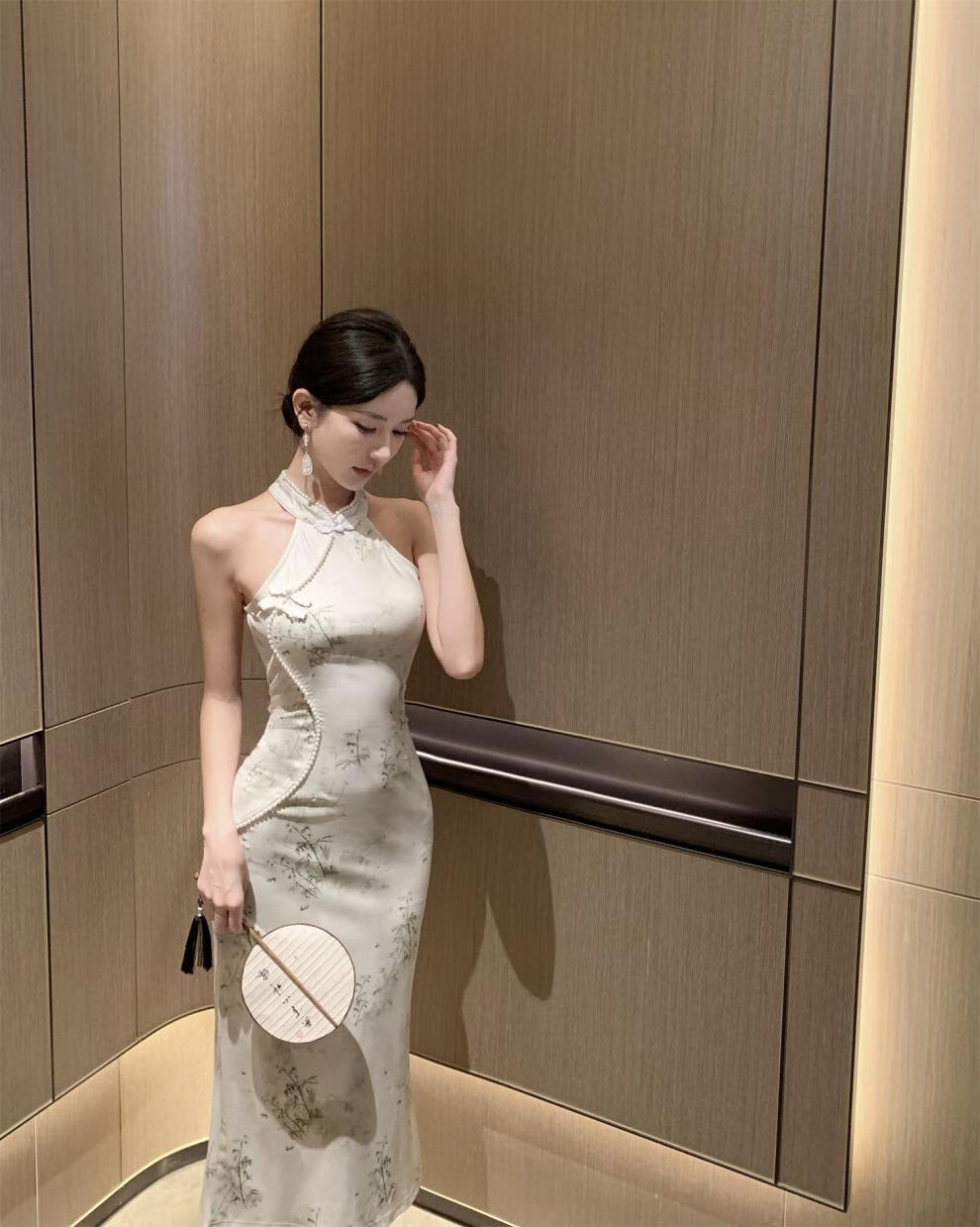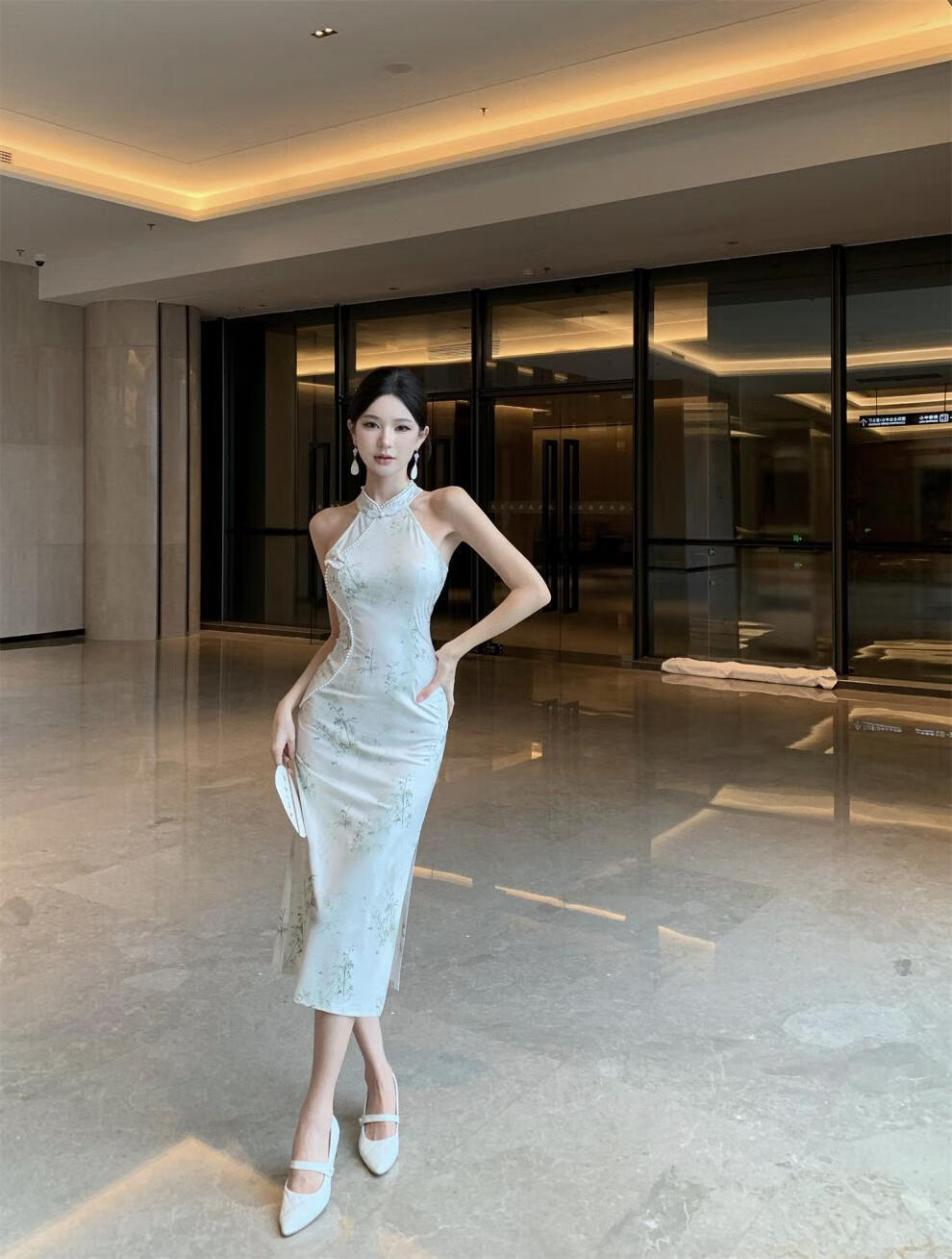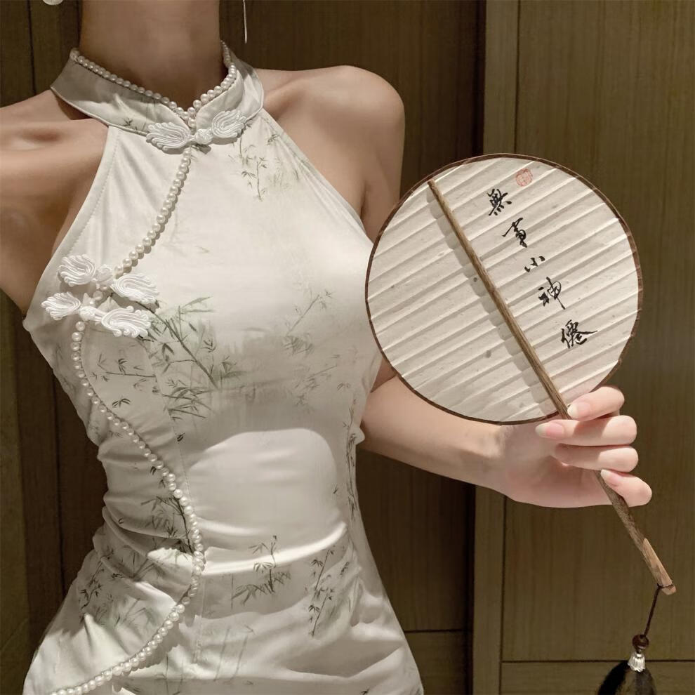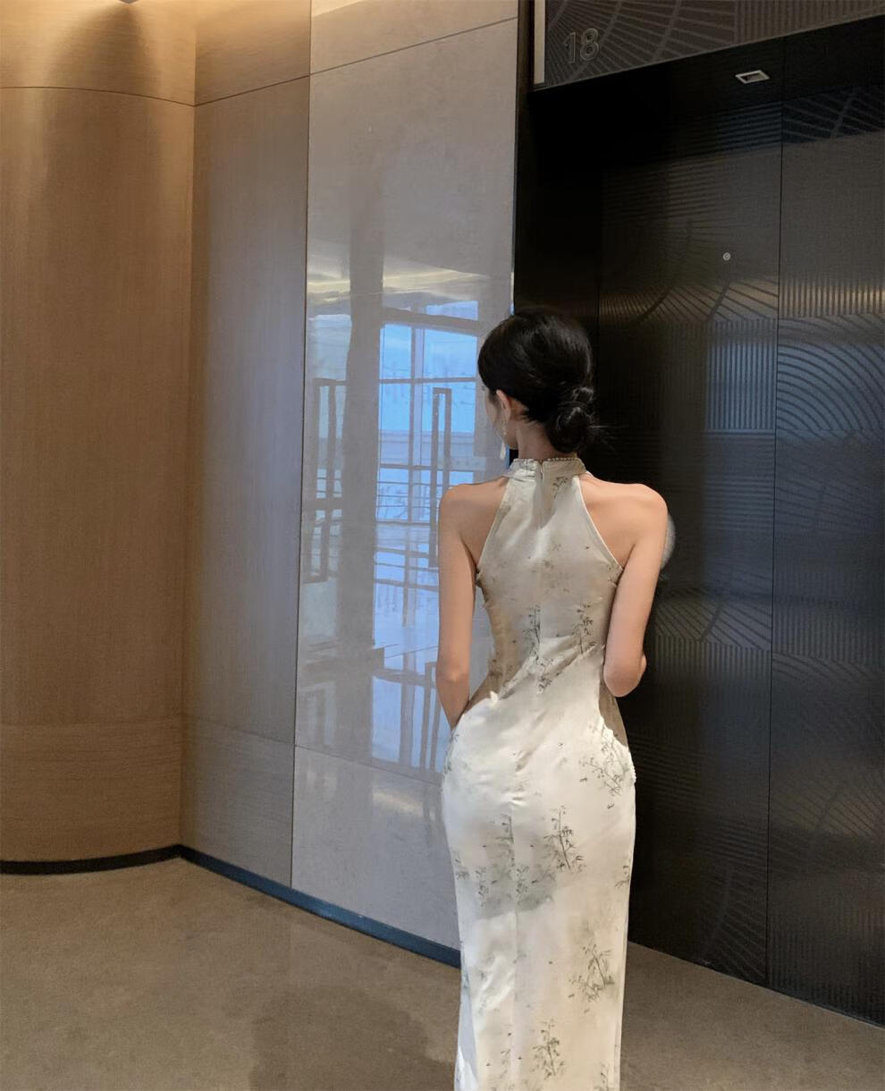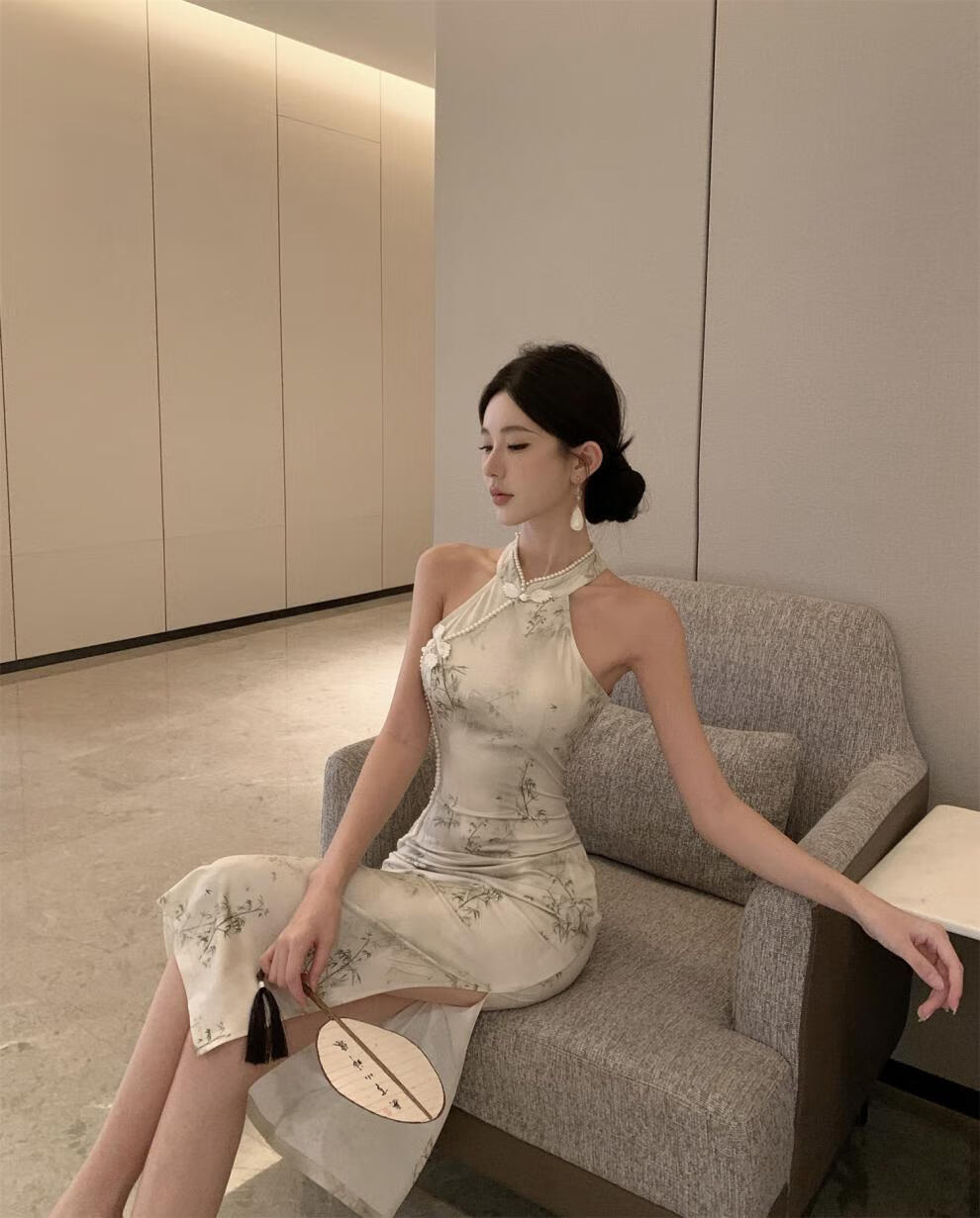 Spring Man (TANHUANGREN) new retro design improved cheongsam beaded halterneck slim hip dress for ladies Picture color M