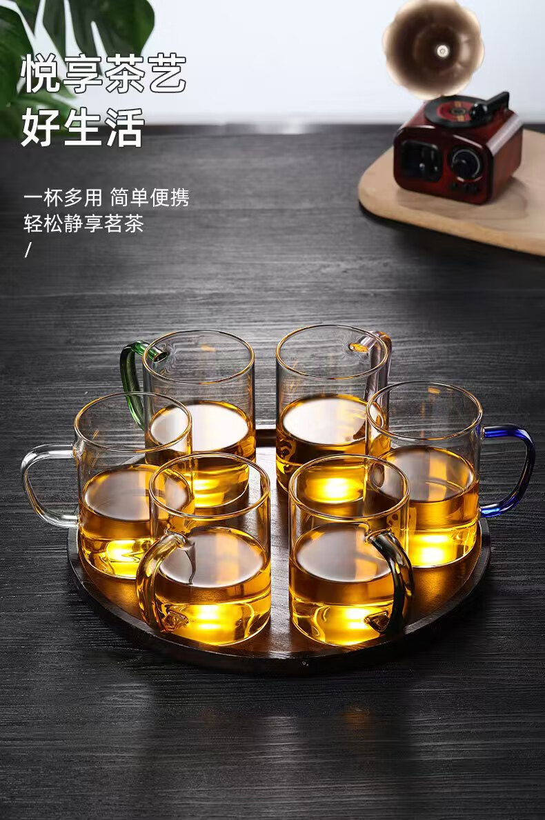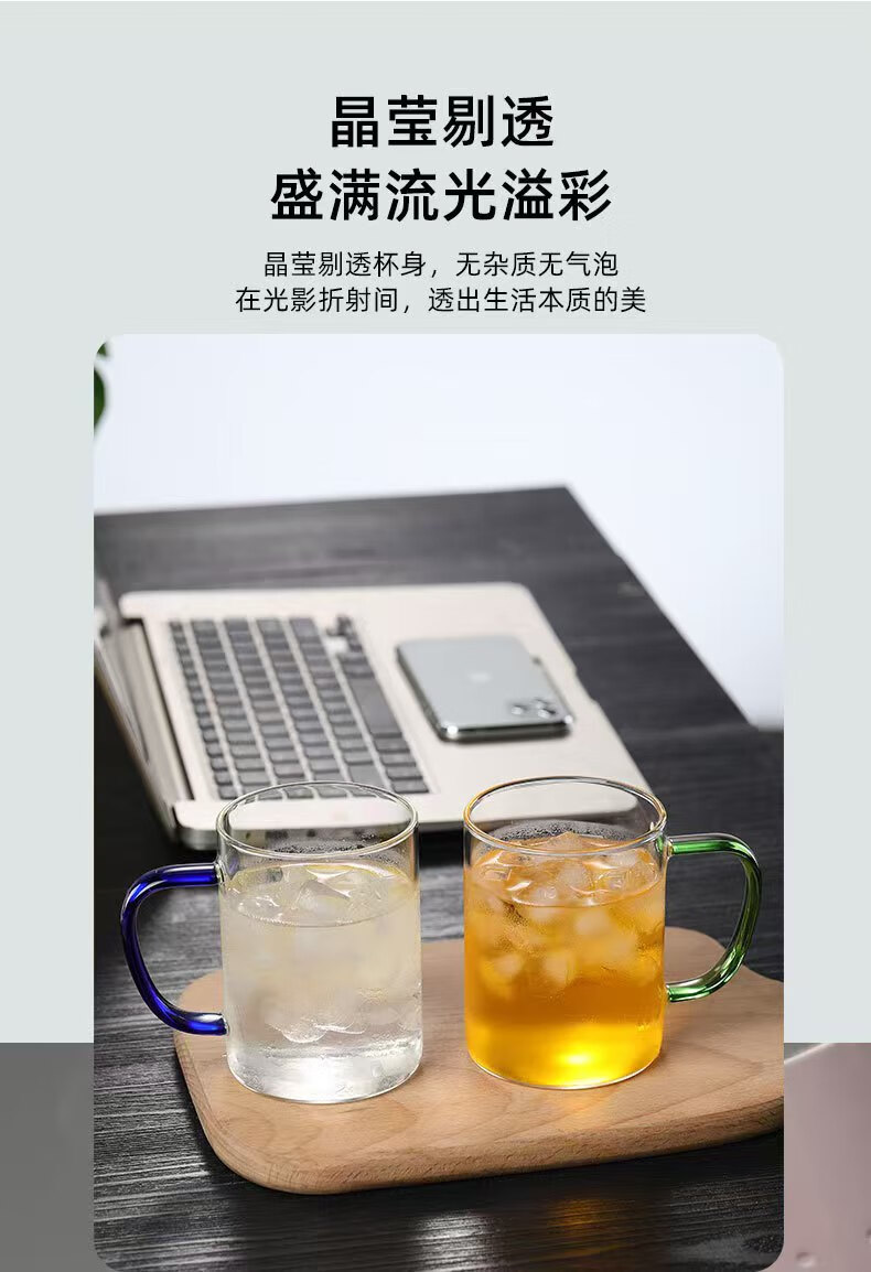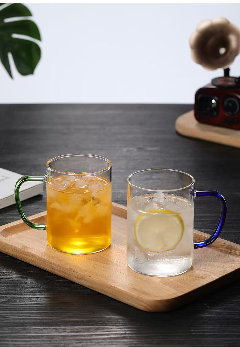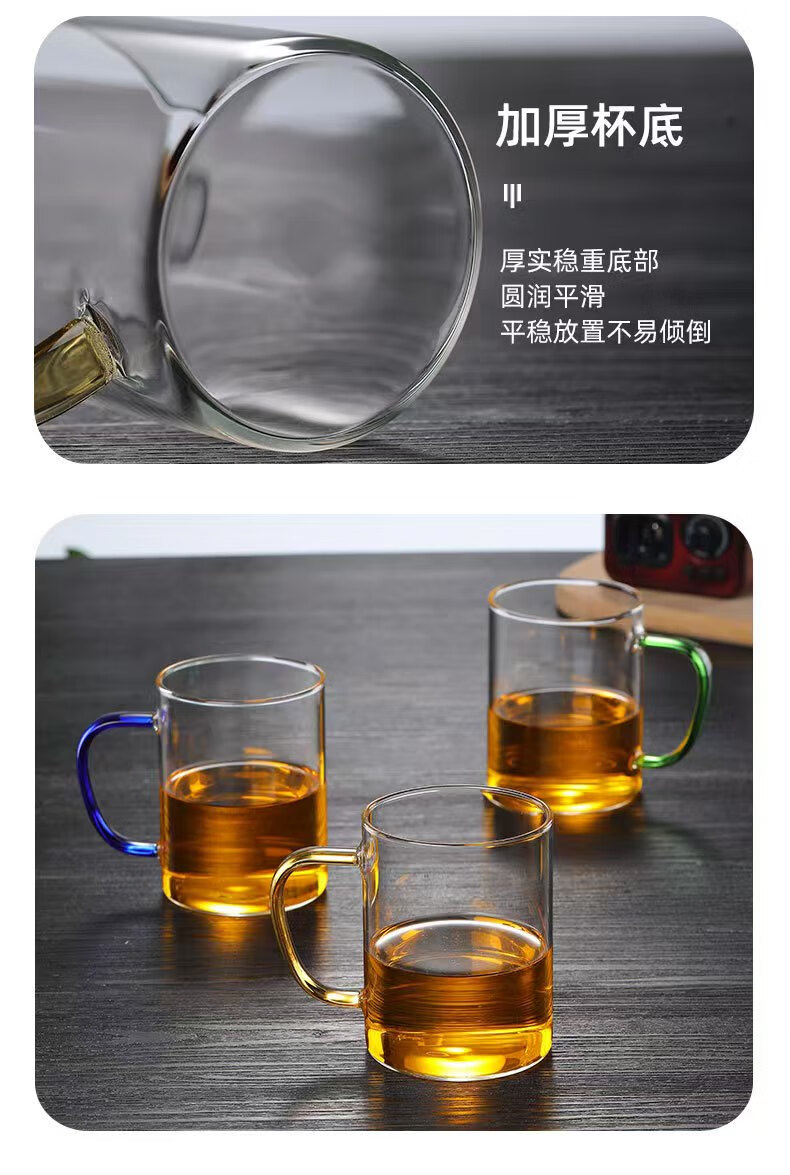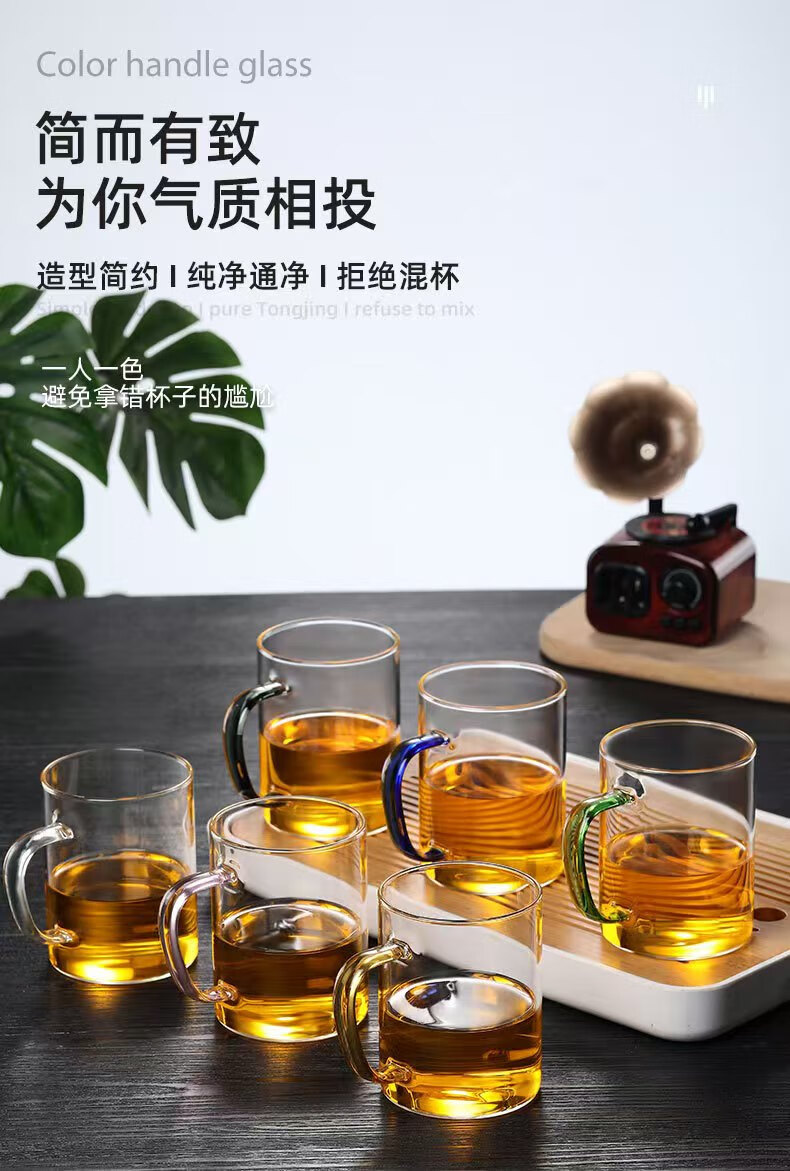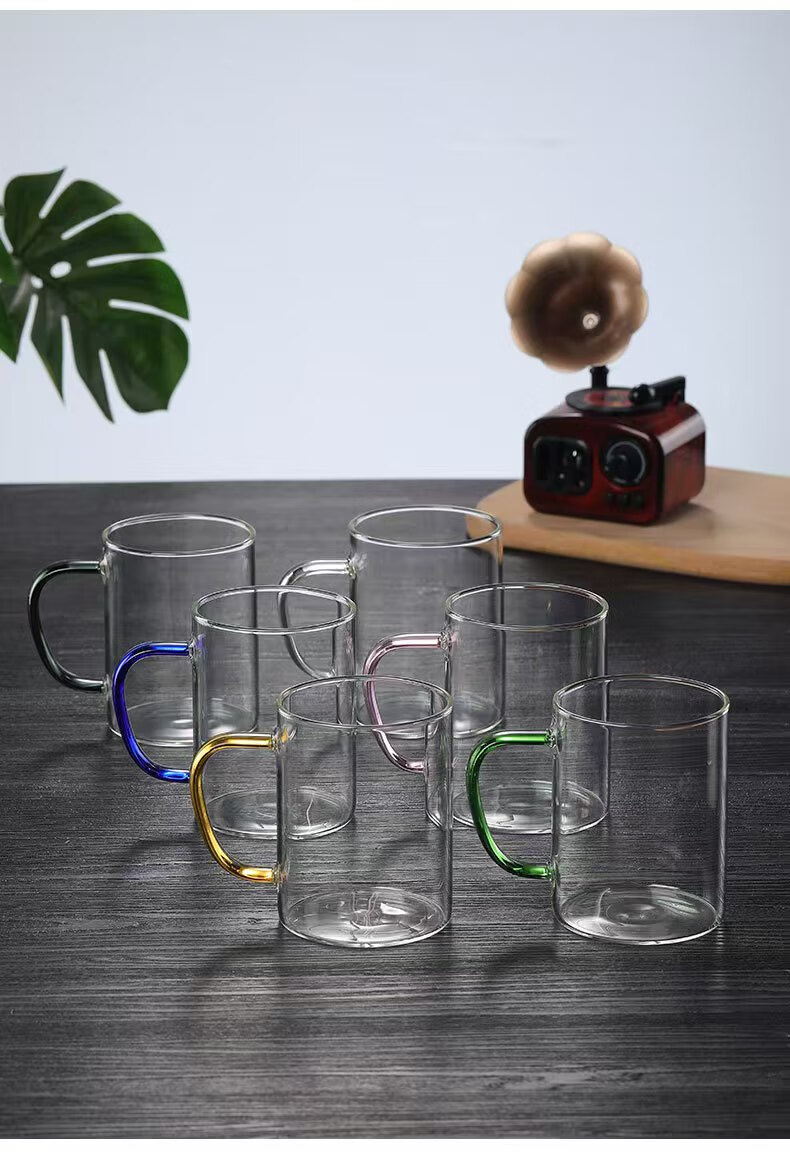 Six-color glass tea cup and water cup, heat-resistant and thickened set, household glass borosilicate glass cup with colorful handles, 6 pieces, pink, blue, green, yellow, black, transparent, 300ml