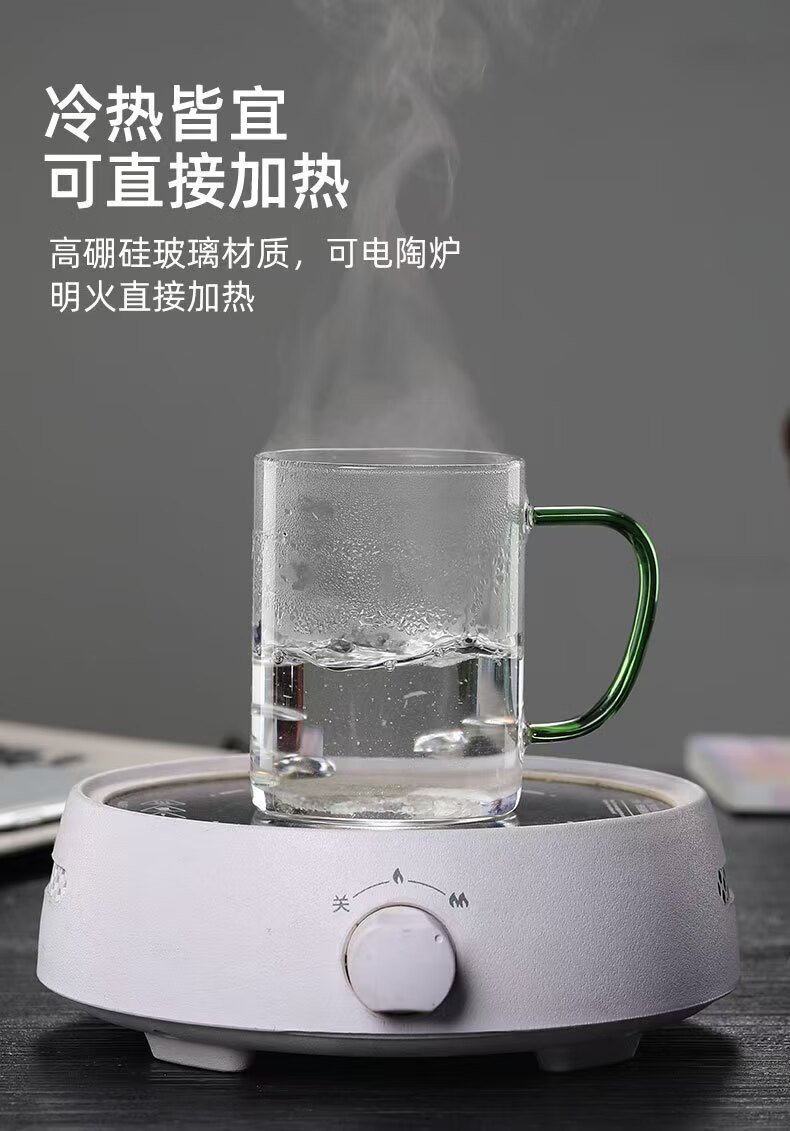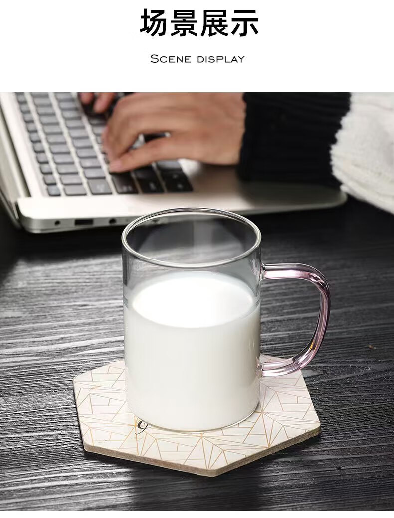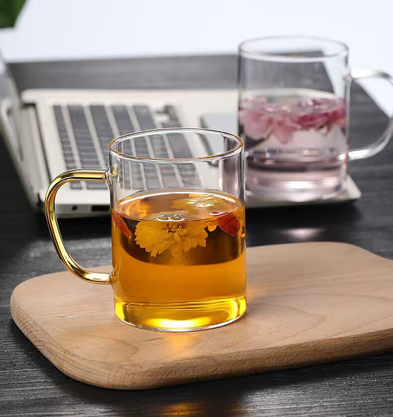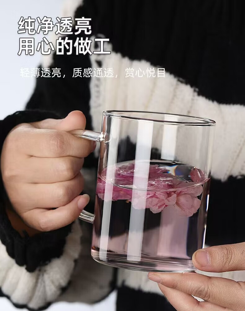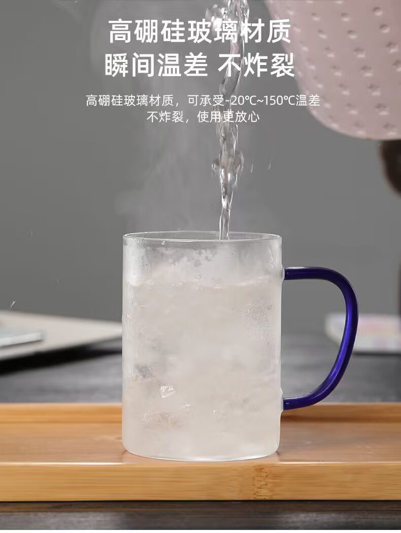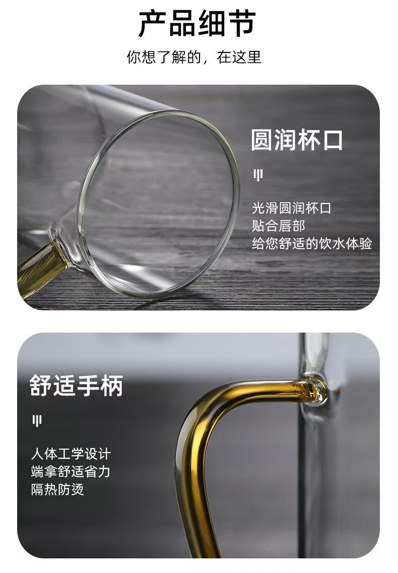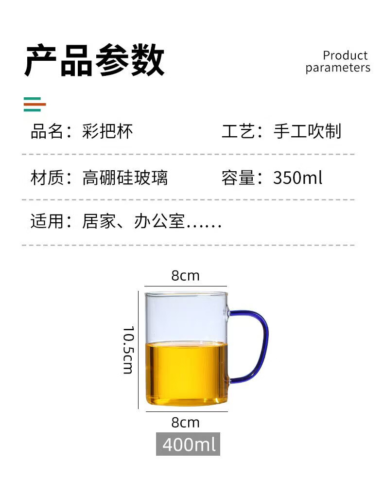 Six-color glass tea cup and water cup, heat-resistant and thickened set, household glass borosilicate glass cup with colorful handles, 6 pieces, pink, blue, green, yellow, black, transparent, 300ml