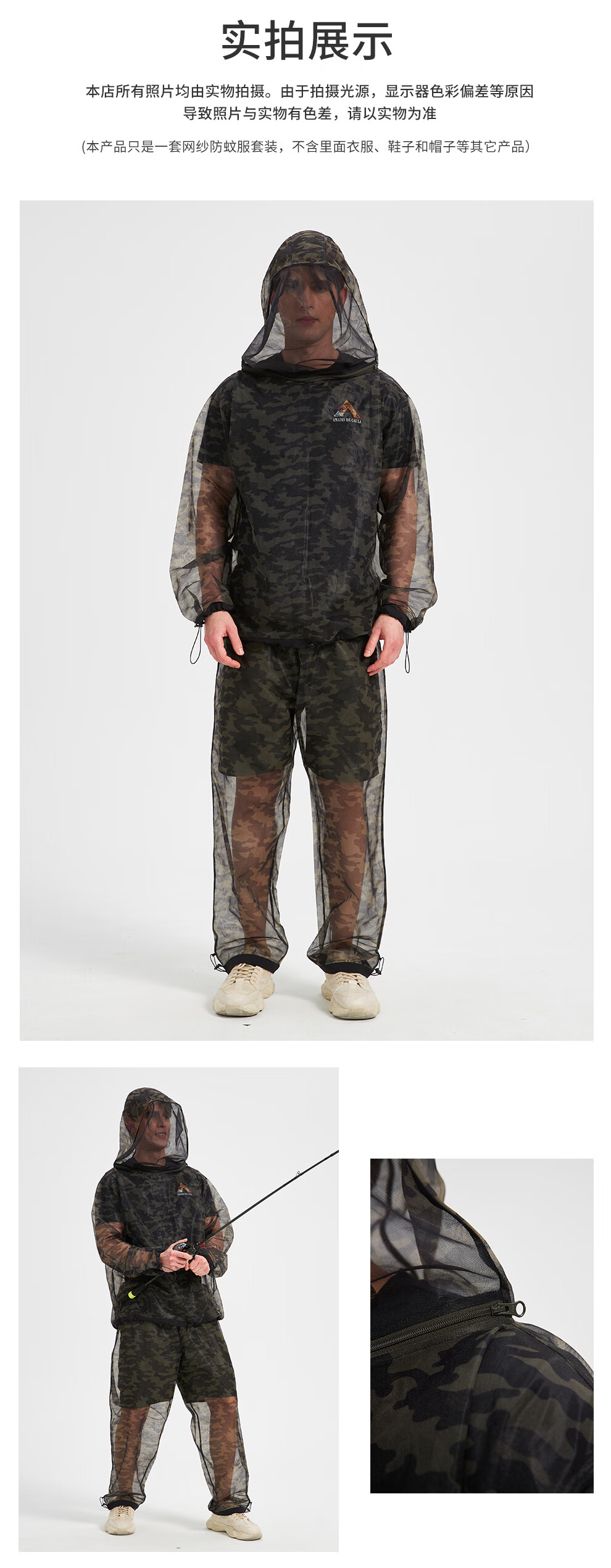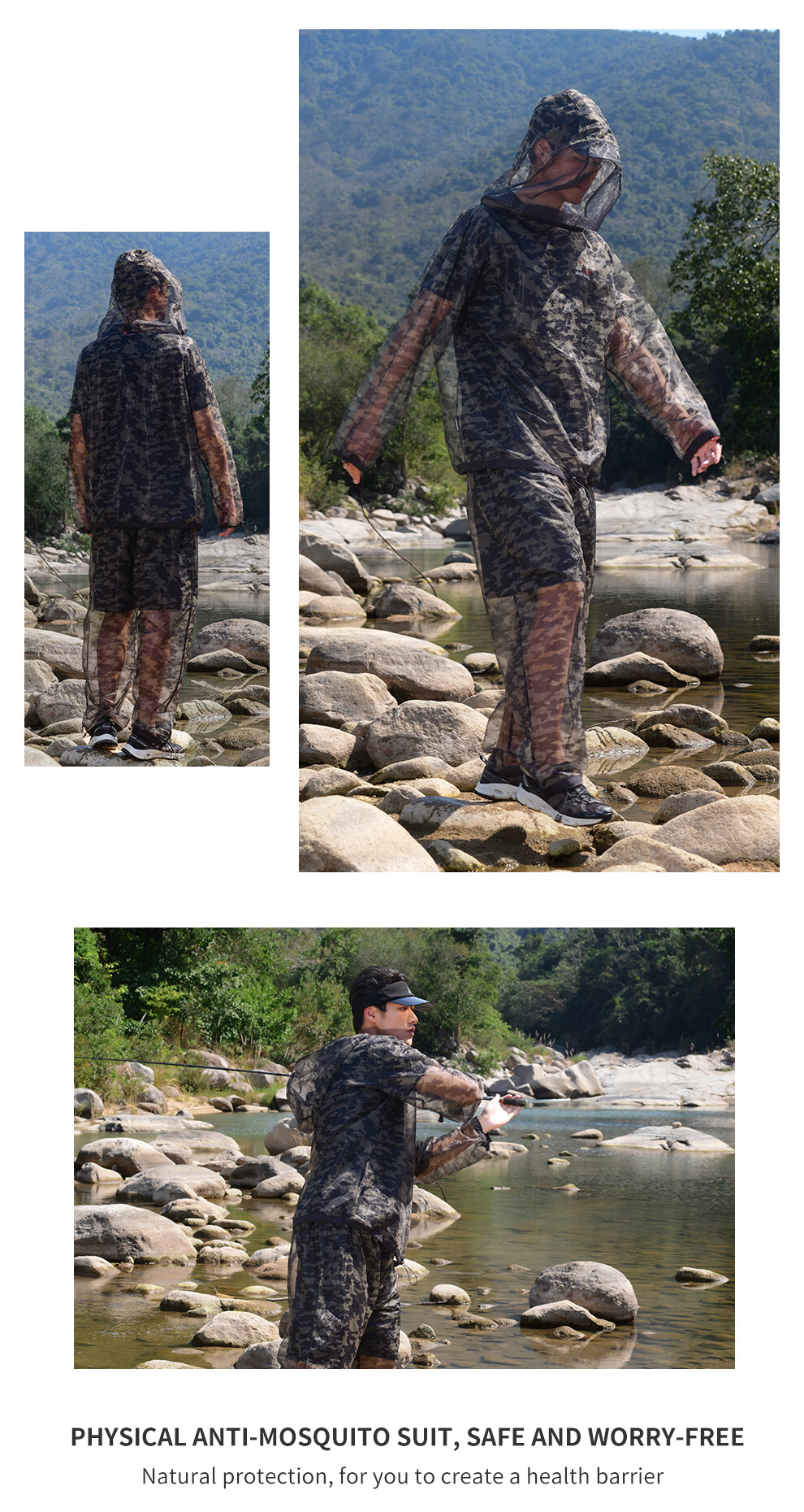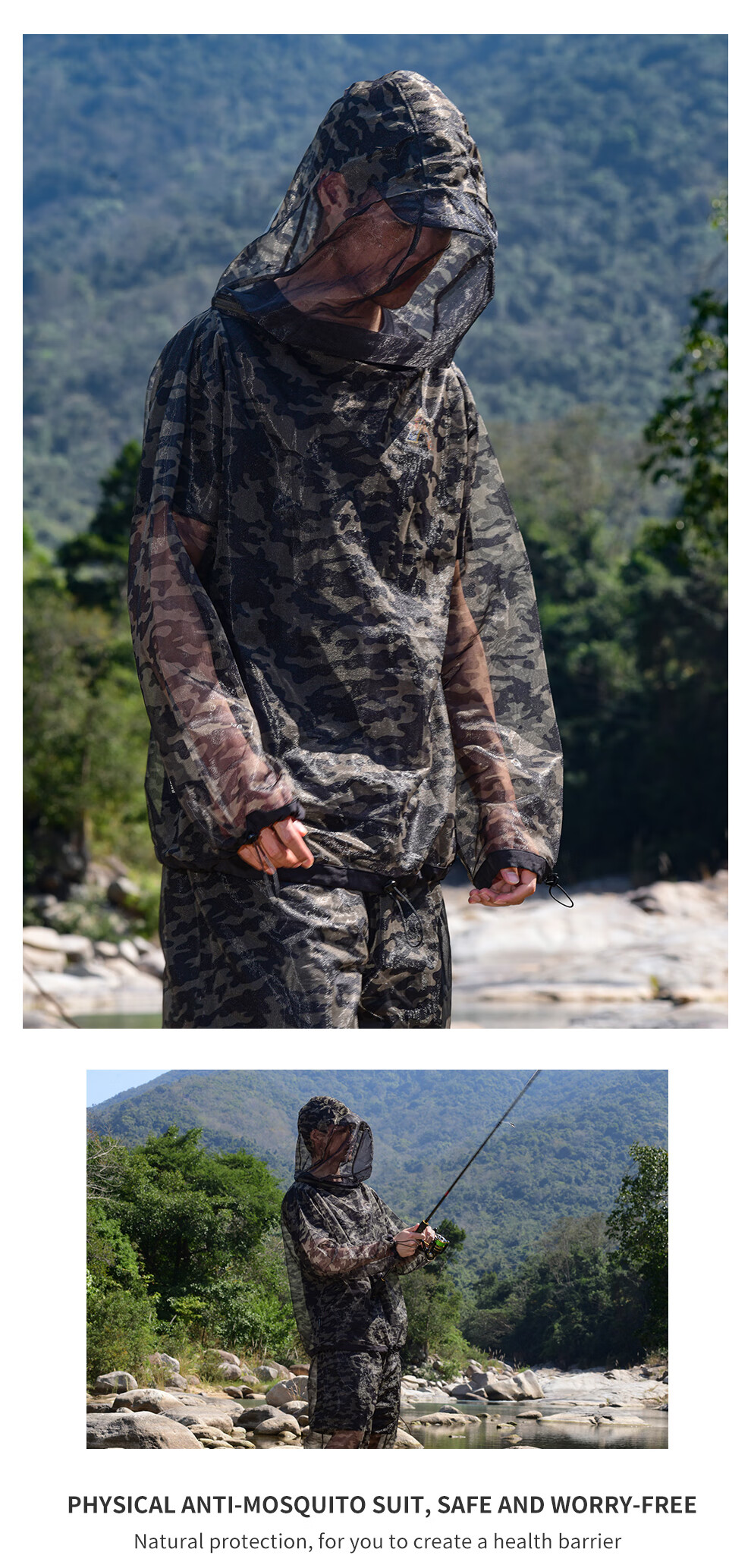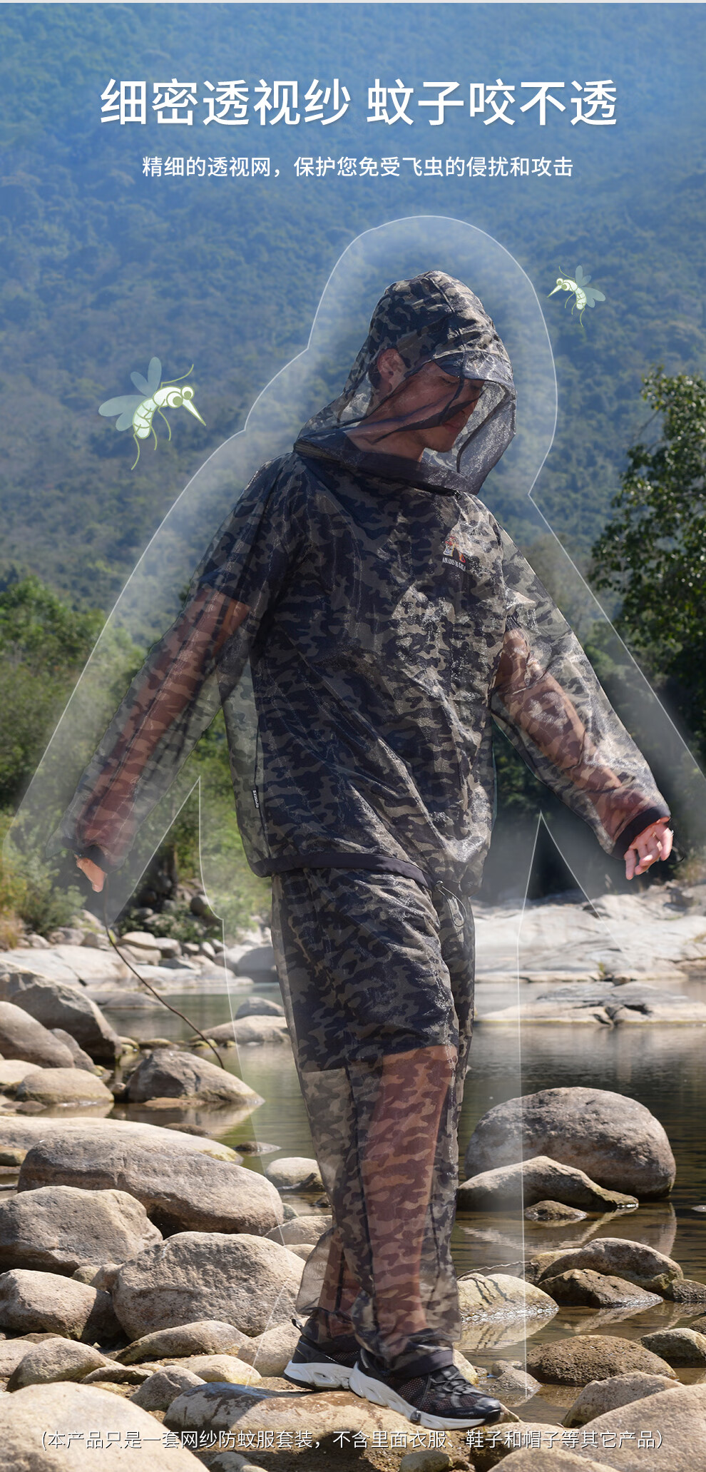 He Jian Gong mesh anti-mosquito suit for men's summer night fishing hollow quick-drying breathable pants hooded insect-proof suit green camouflage (physical anti-mosquito) M