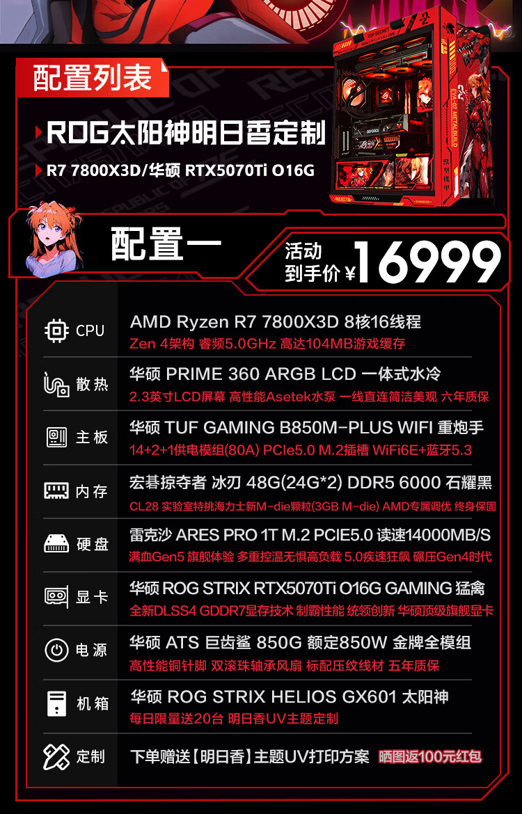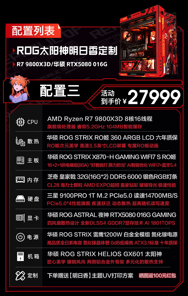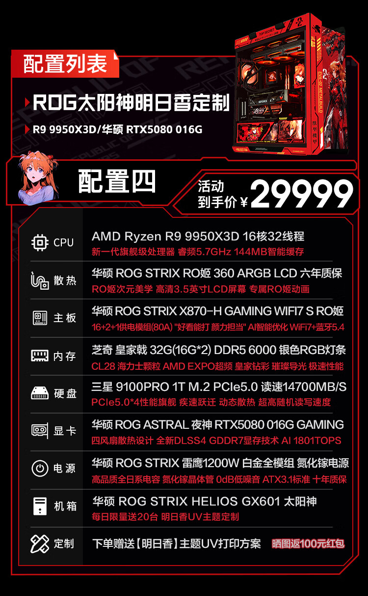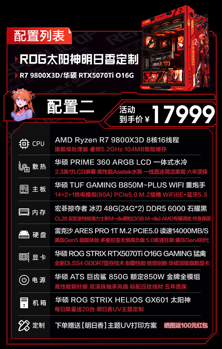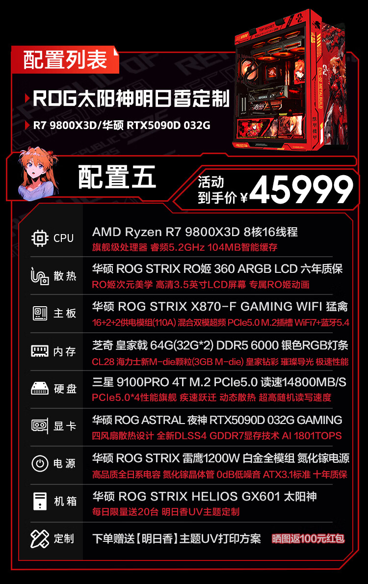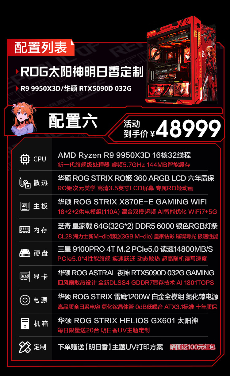 ASUS ROG family bucket 5090D/5080 Night God graphics card R9 9950X3D assembled computer AMD thousand frames e-sports Sun God host DIY custom Asuka mod desktop machine R7 9800X3D + ASUS RTX5070Ti with two