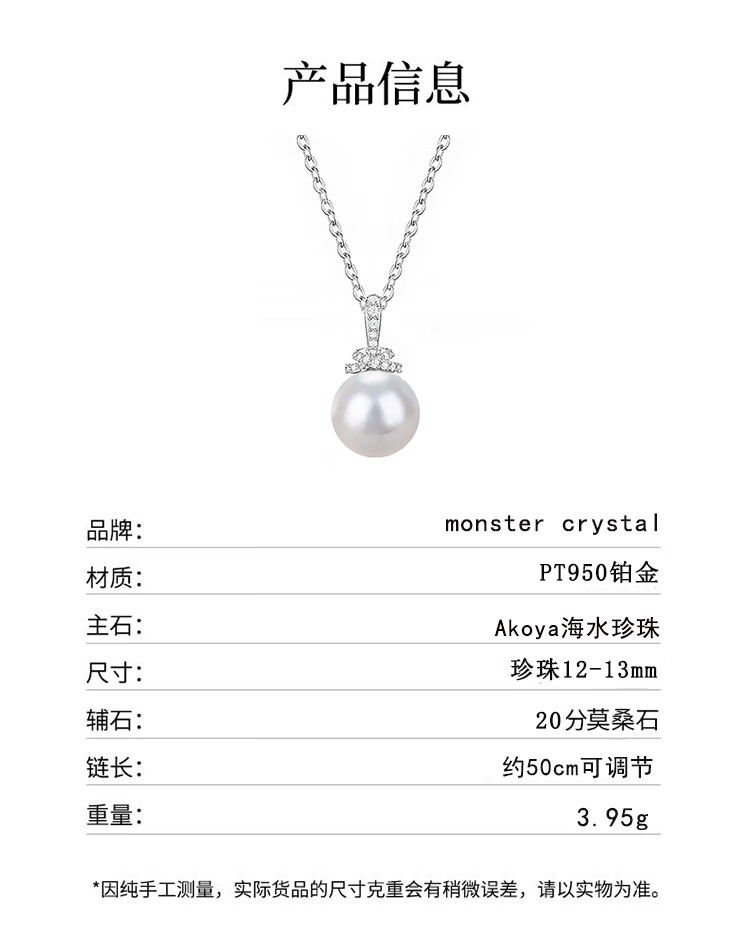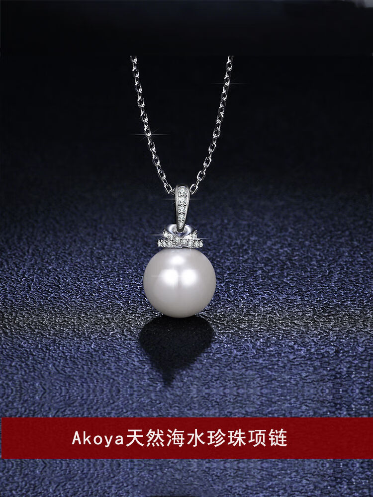 Chihuan Akoya Natural Seawater Pearl Necklace Pt950 Platinum Single Pendant Perfect Round Flawless 18K Gold Highlight Necklace Akoya Seawater Pearl 12-13mm Micro-encrusted with Diamonds