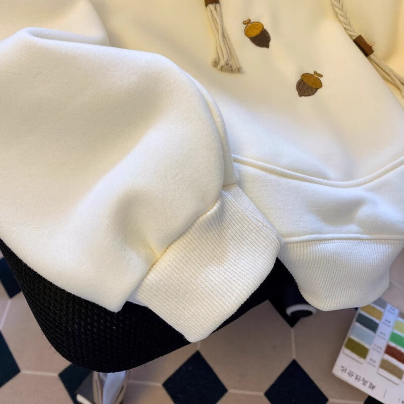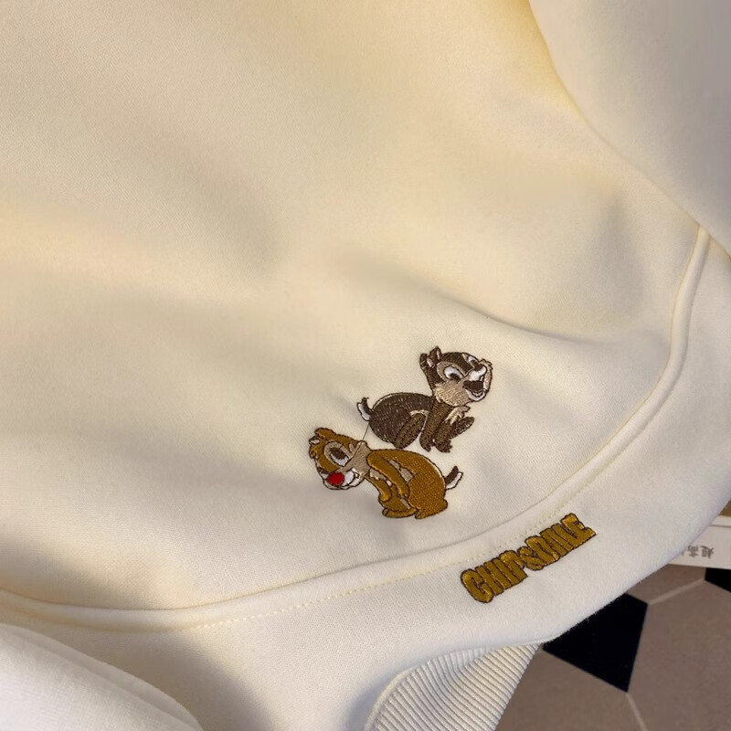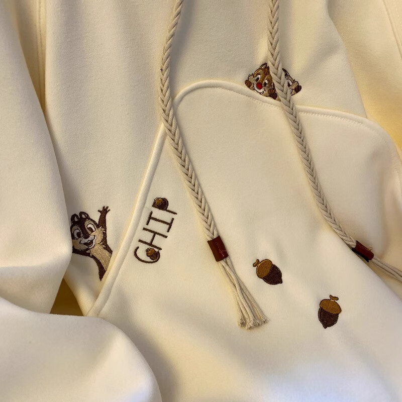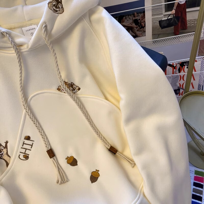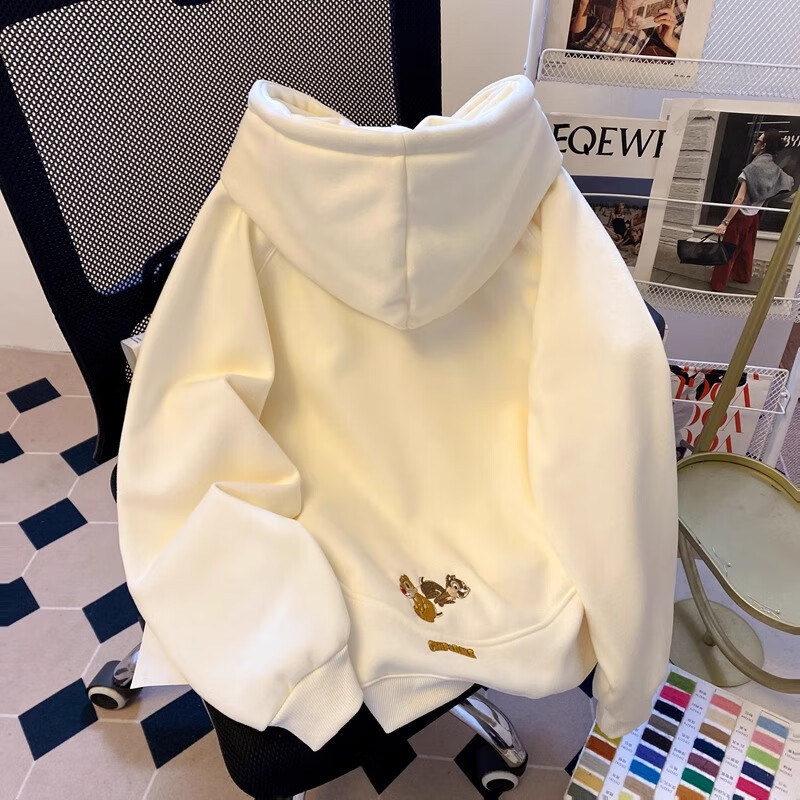 LDBE design embroidered squirrel hooded sweatshirt for women 2025 new velvet thickening loose lazy style spring coat trend apricot autumn and winter velvet M 80-105Jin Jin is equal to 0.5 kg
