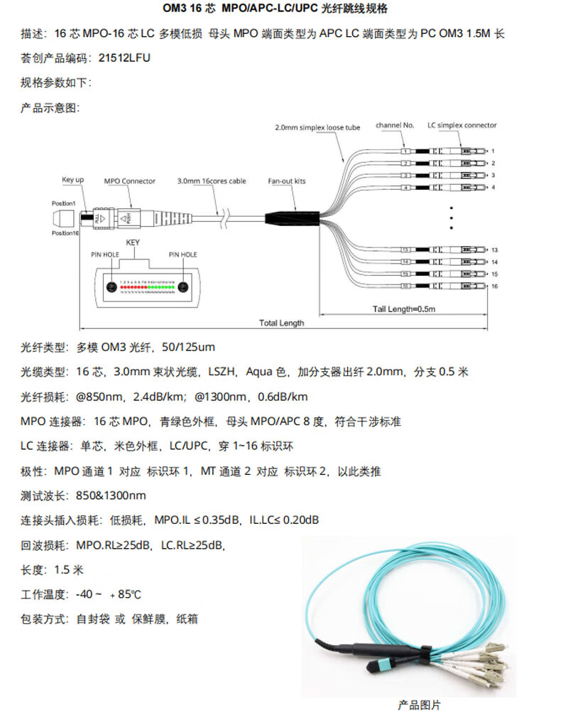 VCHUNG 16-core MPO optical fiber cable female APC-LC/PC multi-mode low loss OM3 1.5 meters 21512LFU