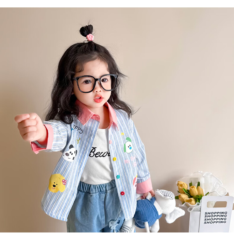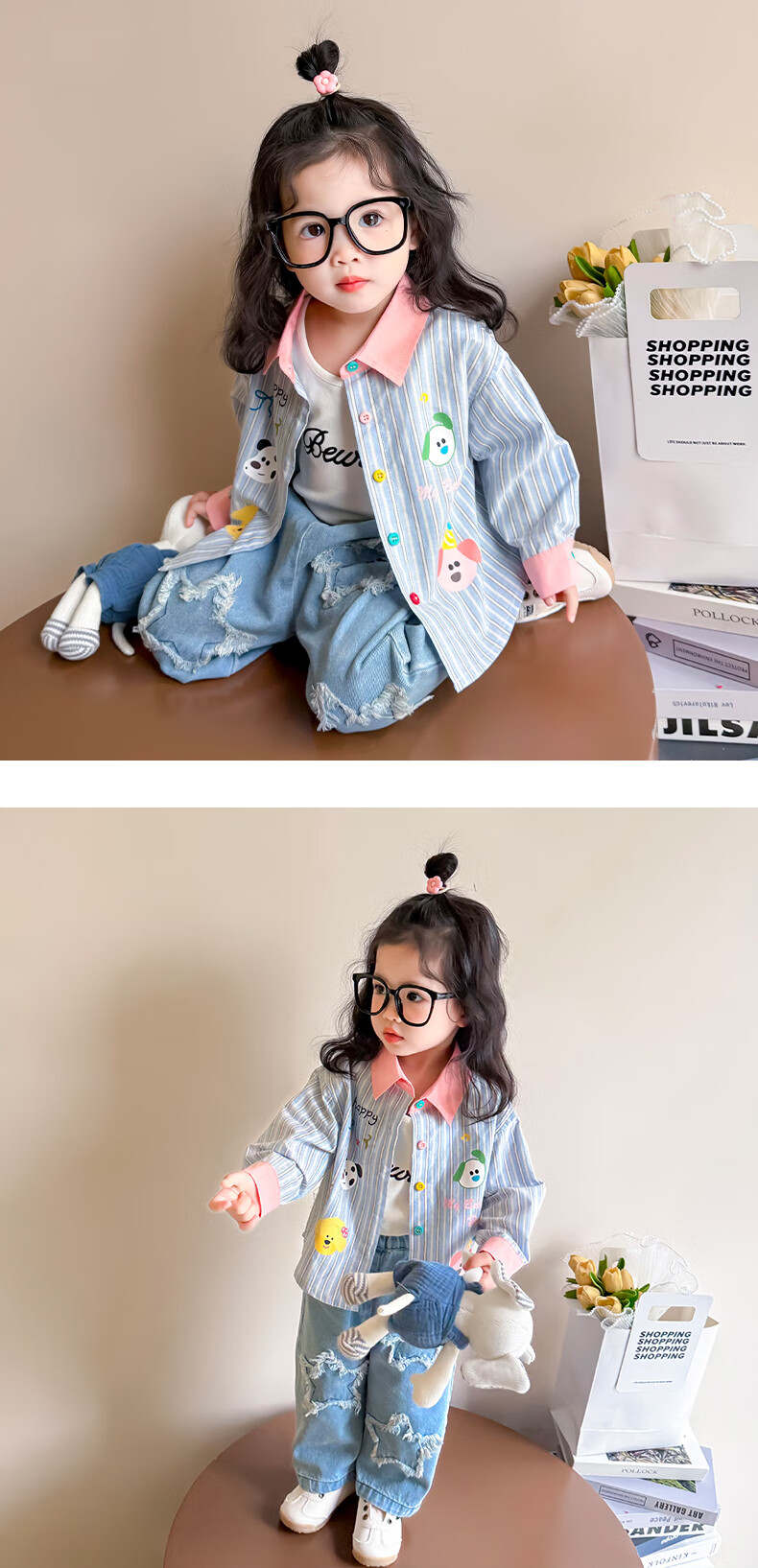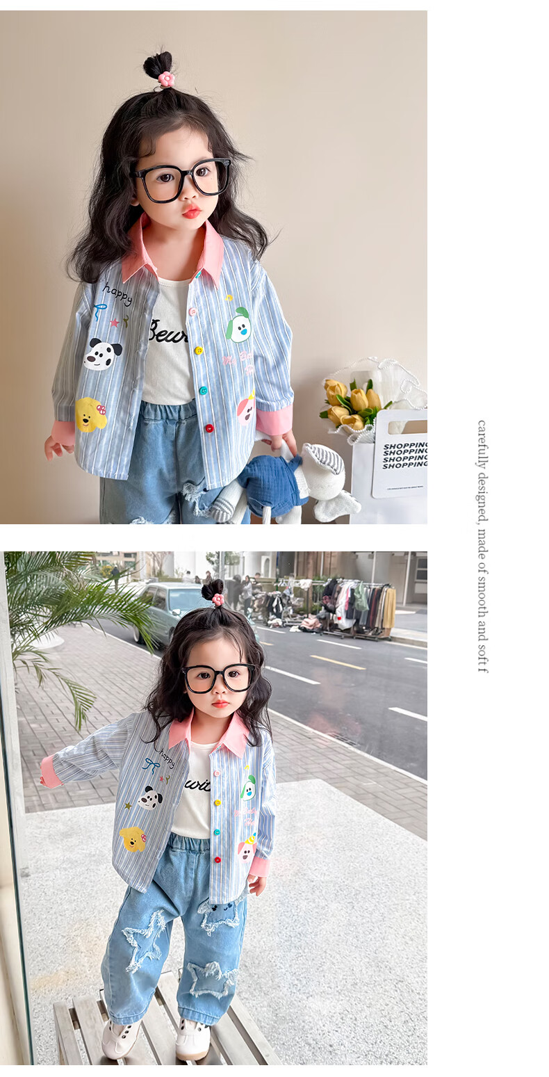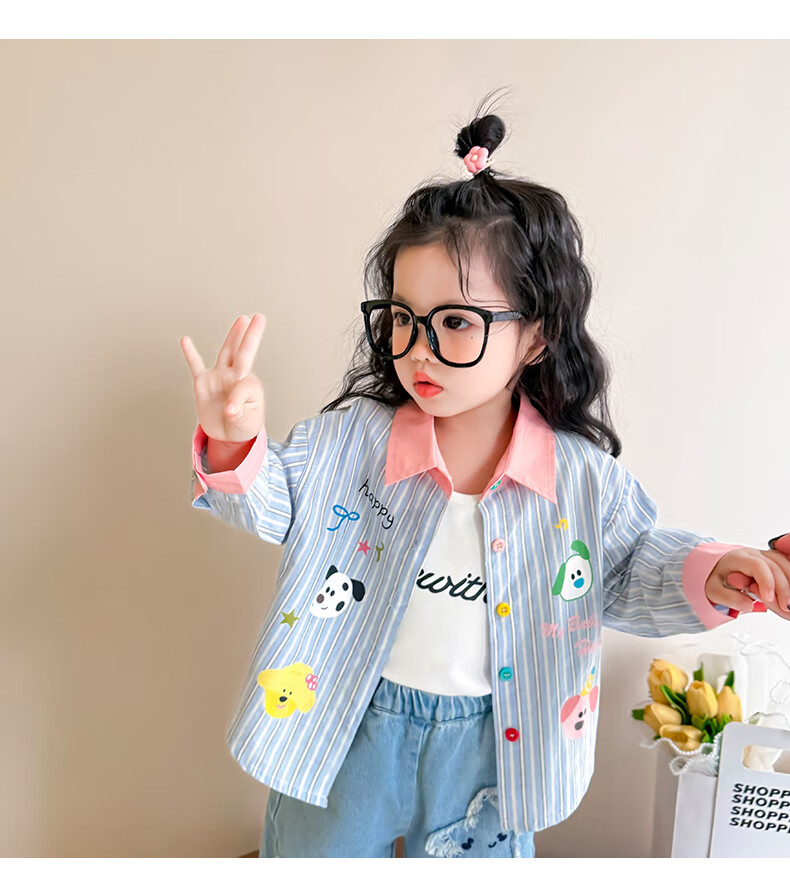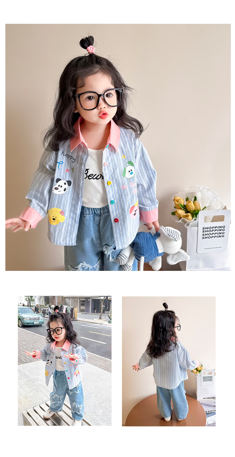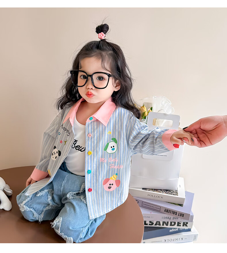 Qiyuxin children's clothing girls striped shirt spring and autumn children's shirt 2025 new little girl baby casual jacket top blue 90 (suitable for height 80-90cm)