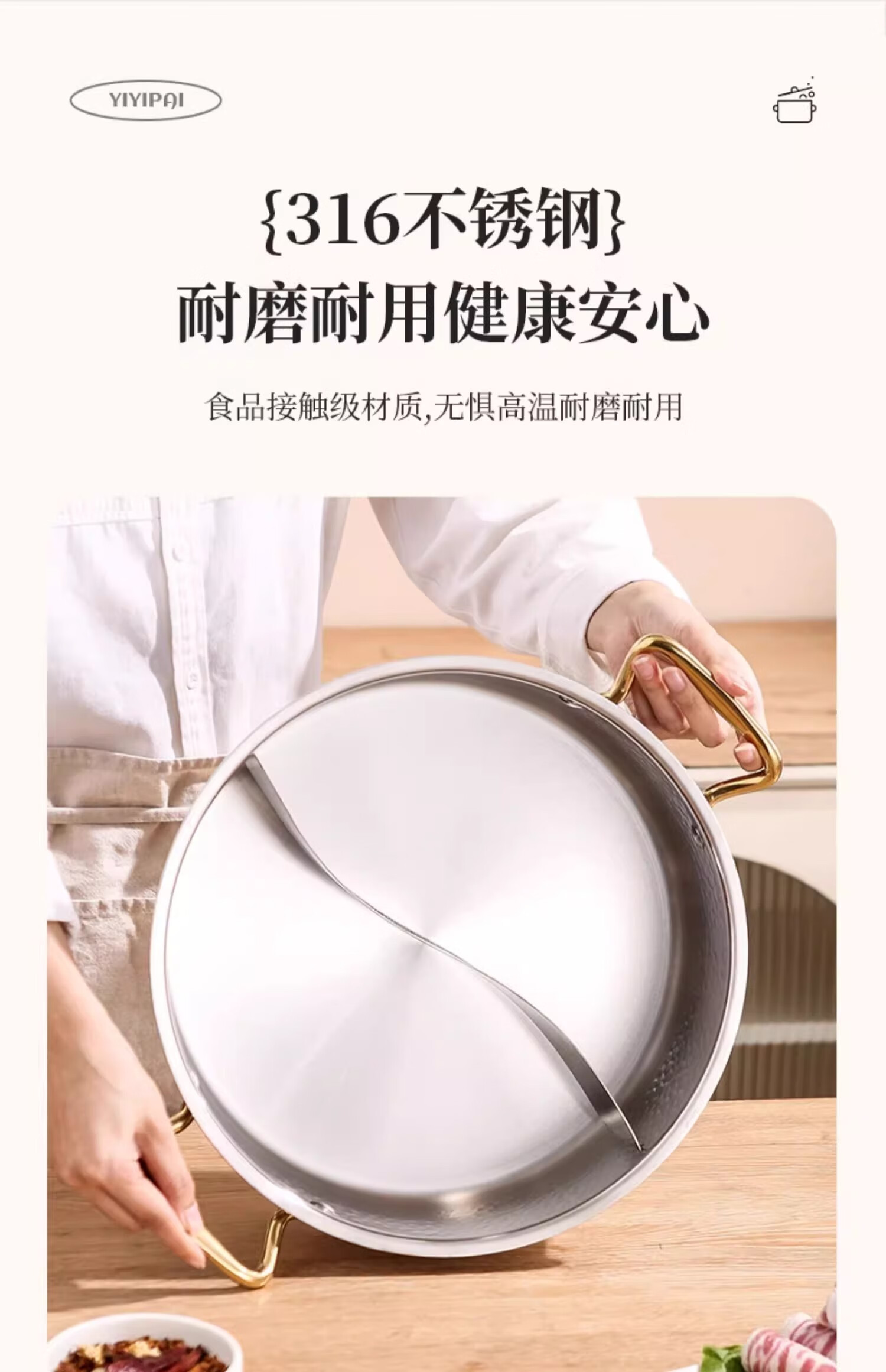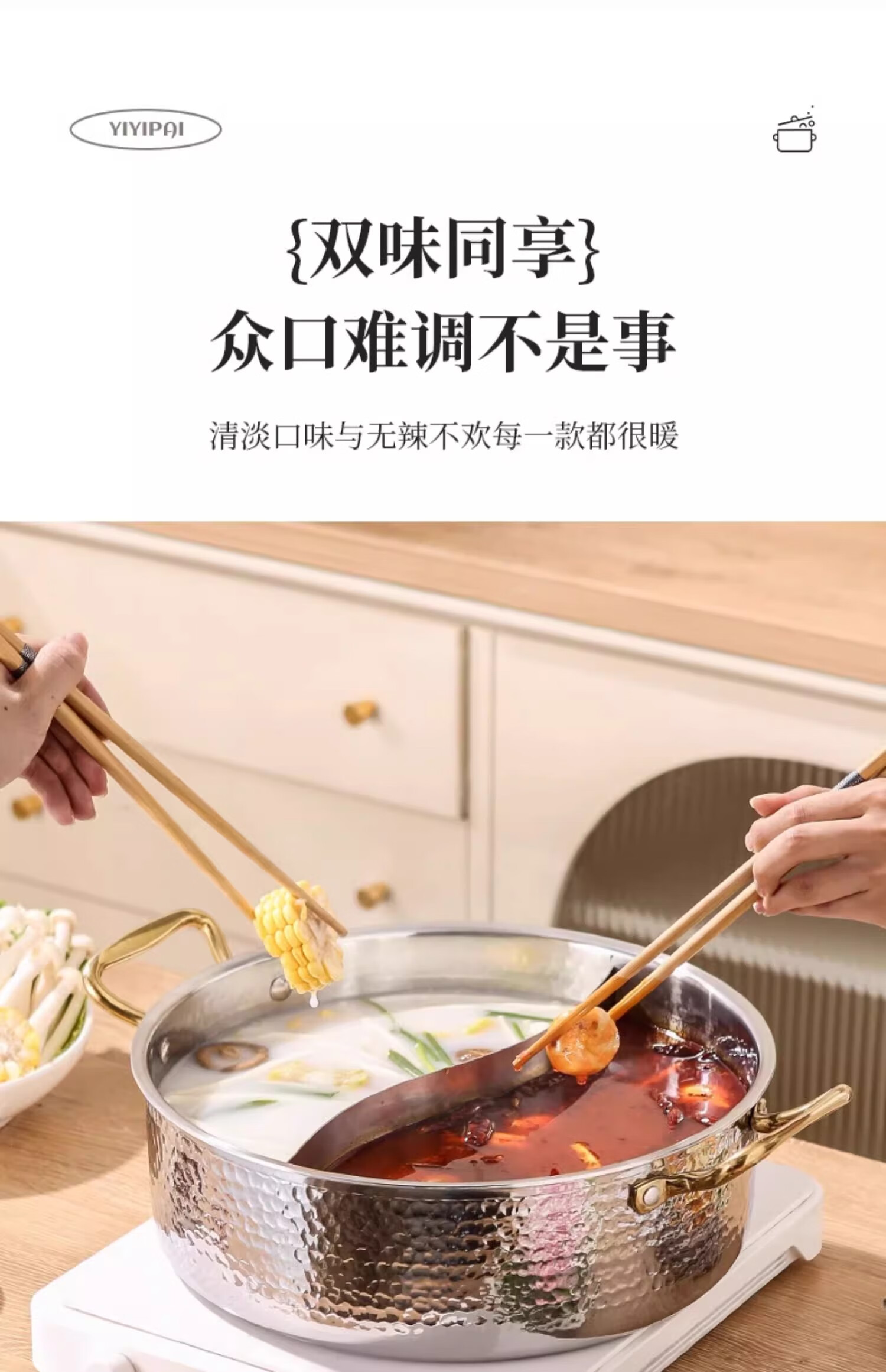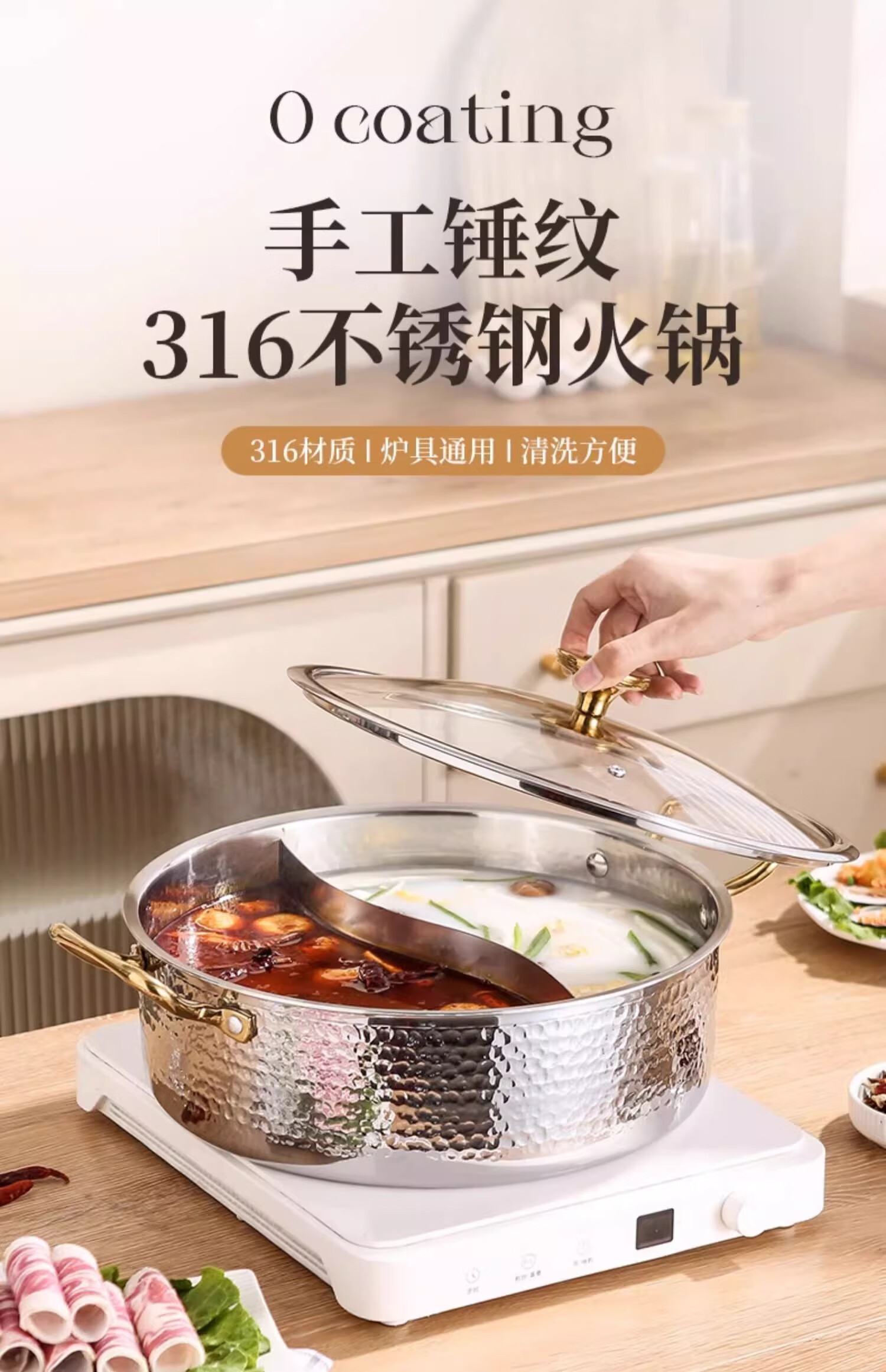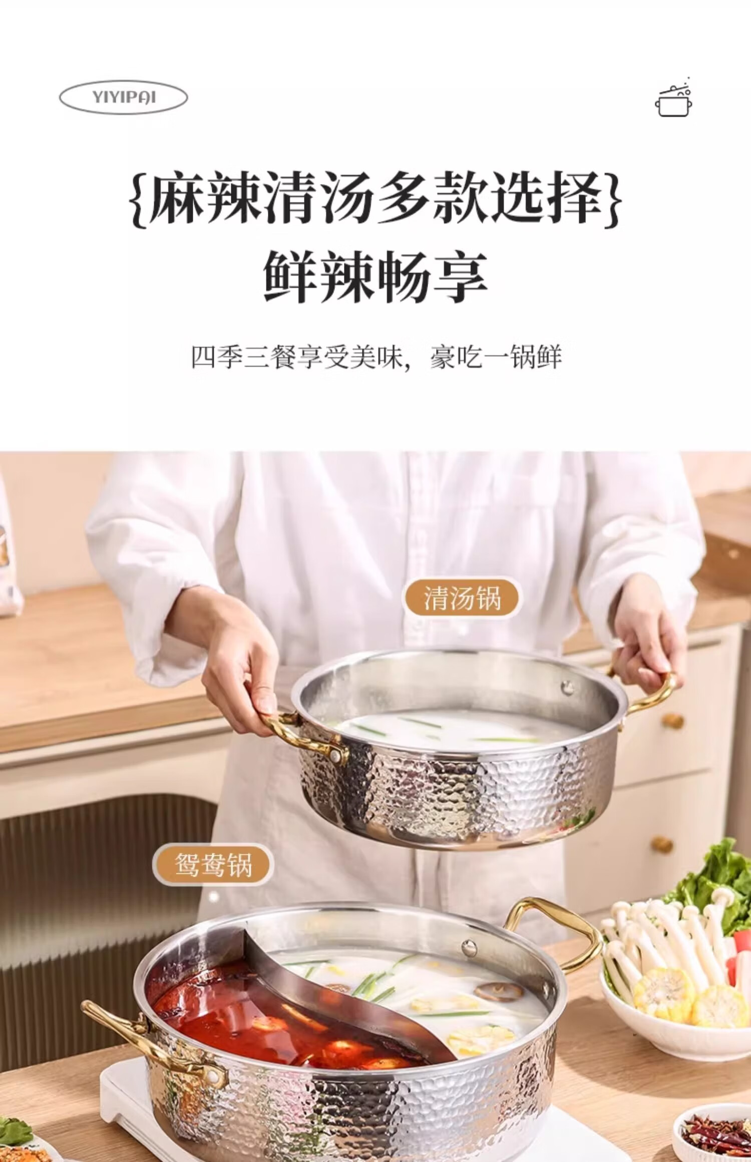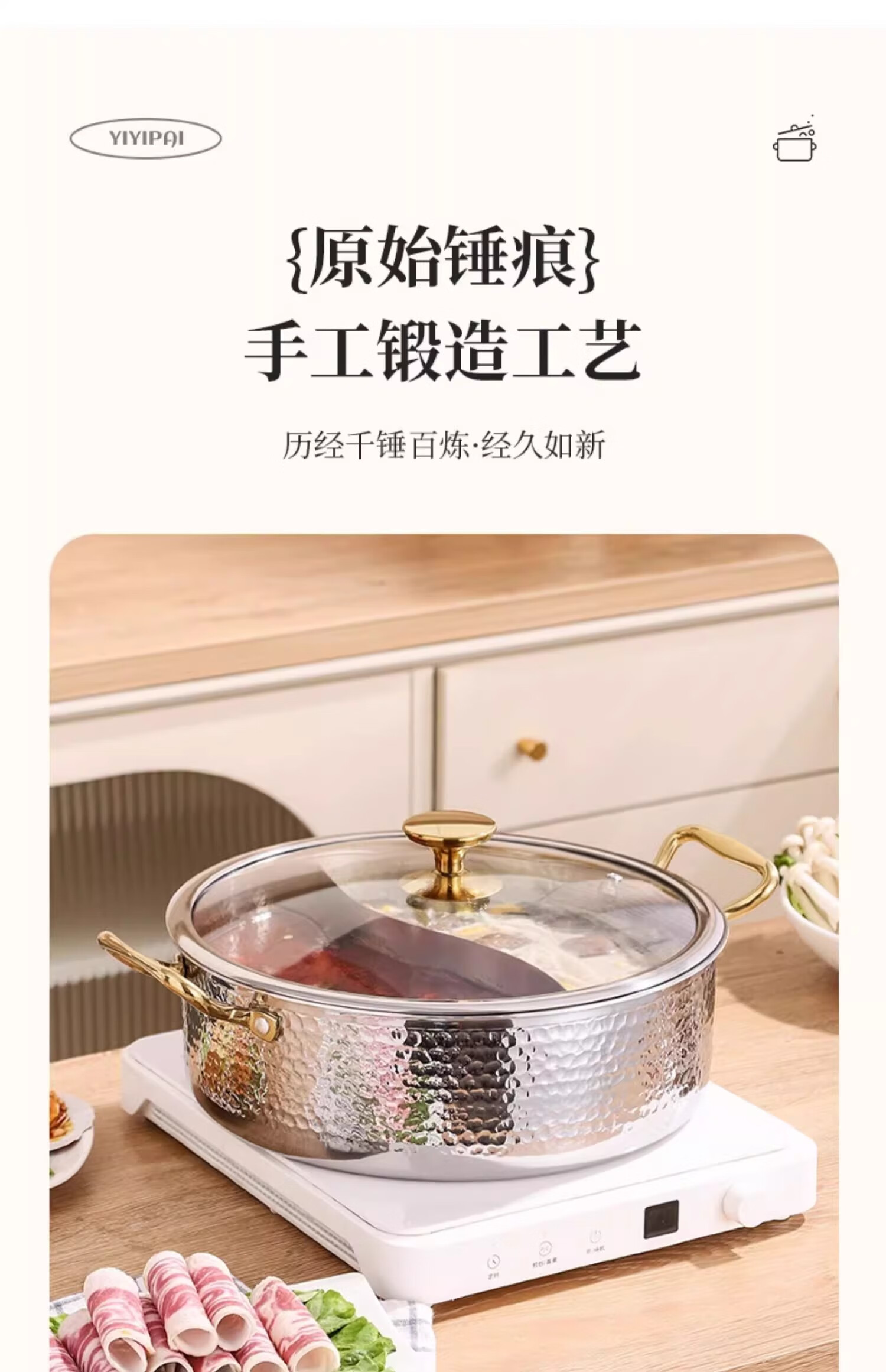 YIYIPAI thickened 316 stainless steel mandarin duck pot hammer pattern hot pot basin household pot induction cooker special 2025 new model mandarin duck hammer pattern three-layer steel thickened with lid 28cm