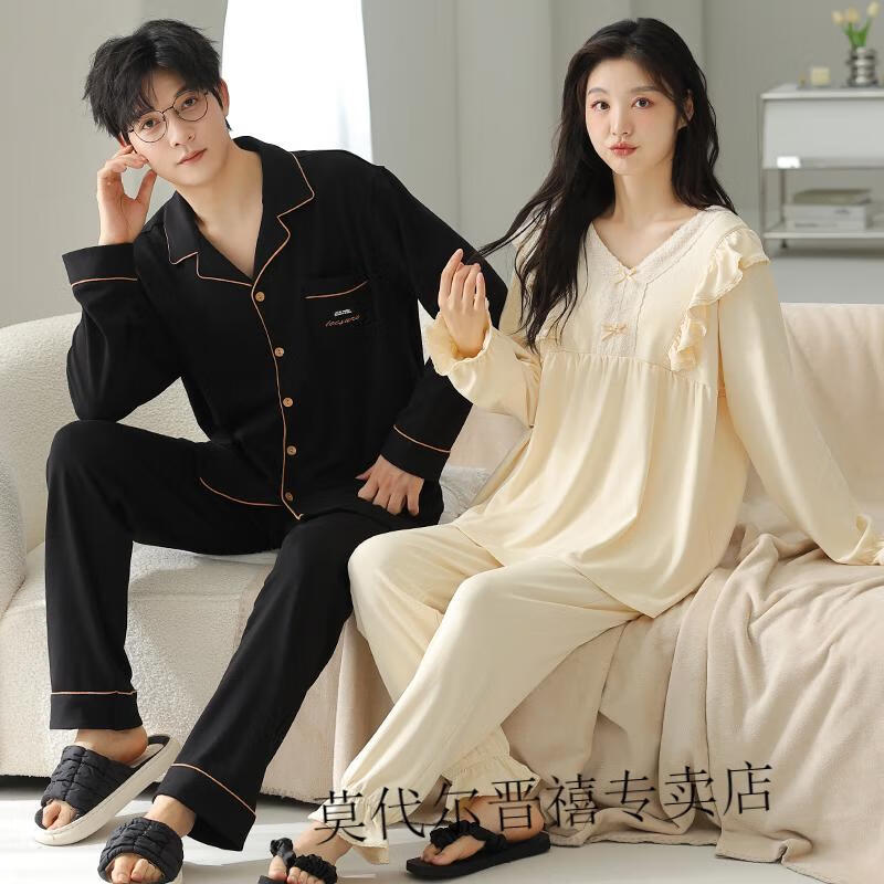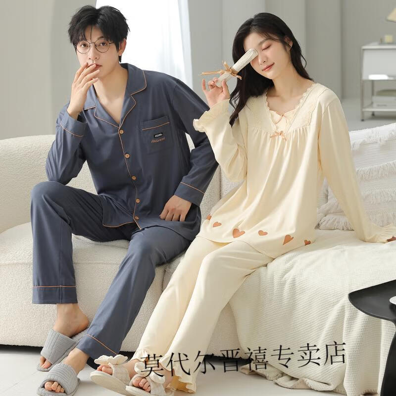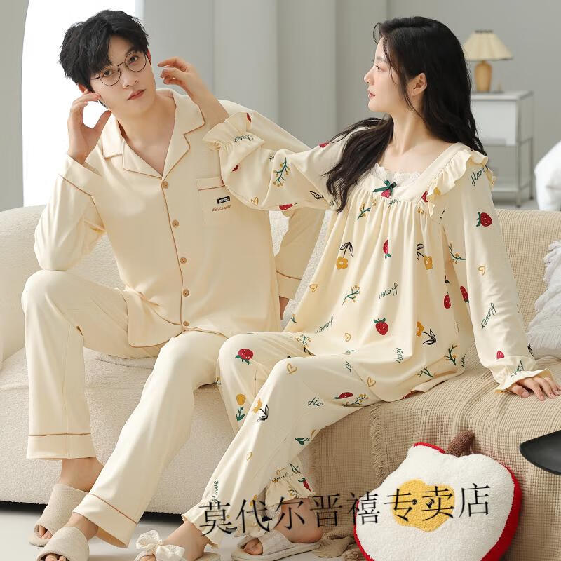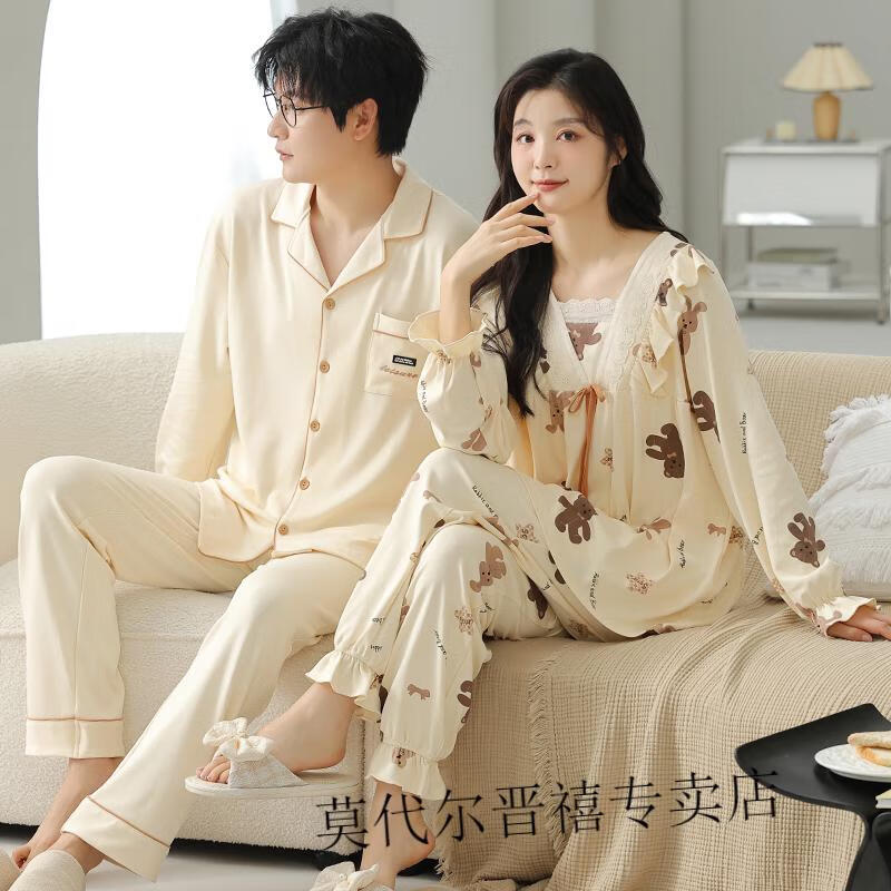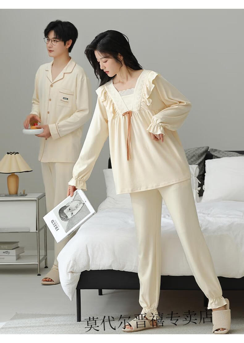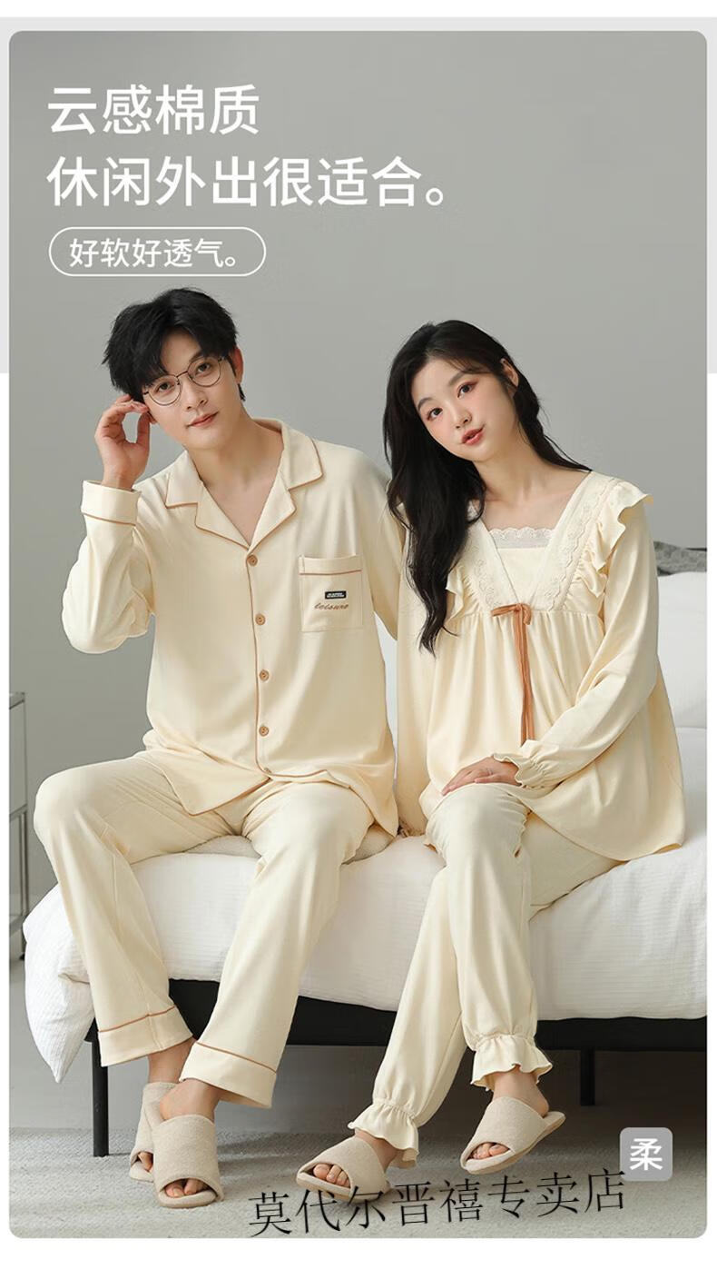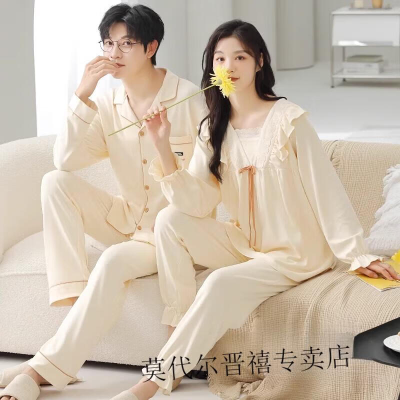 Modal Couple Pajamas Women's Spring and Autumn Style 2025 New Spring and Autumn Long Sleeve Love Large Size Cotton Men's Home Clothes Set Main Picture Model XB 68603 (G) 98911 (B) Apricot 2XL Women
