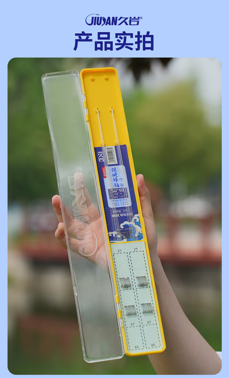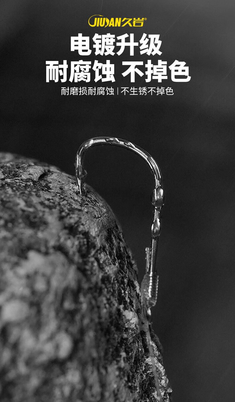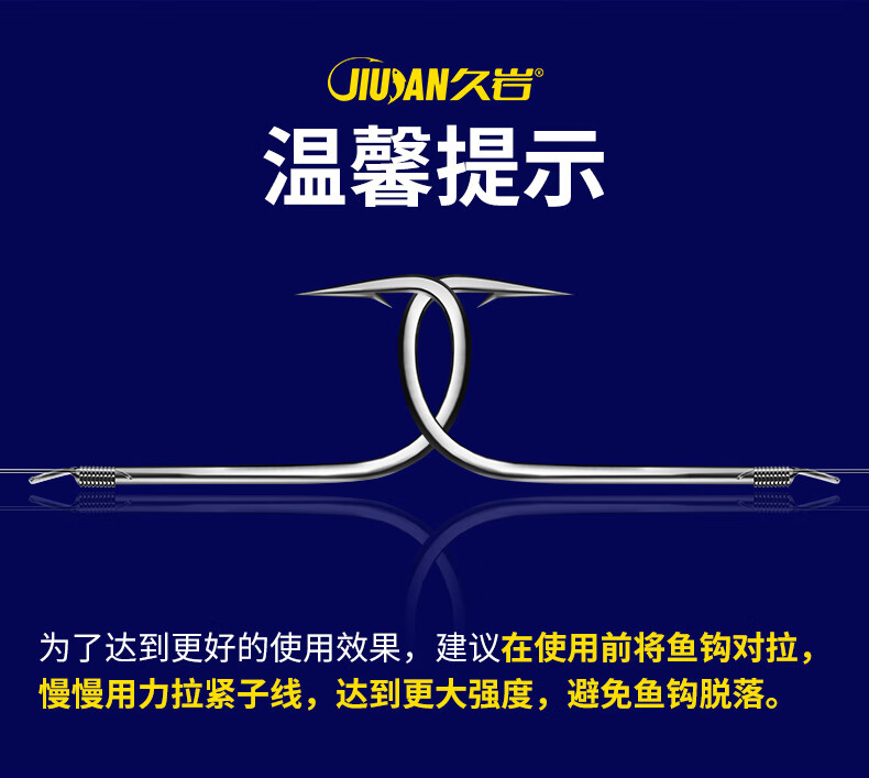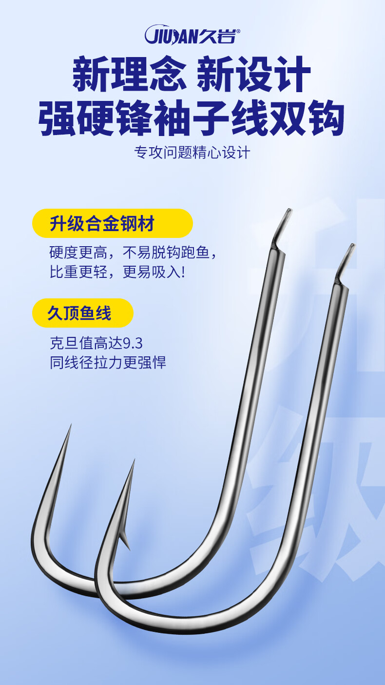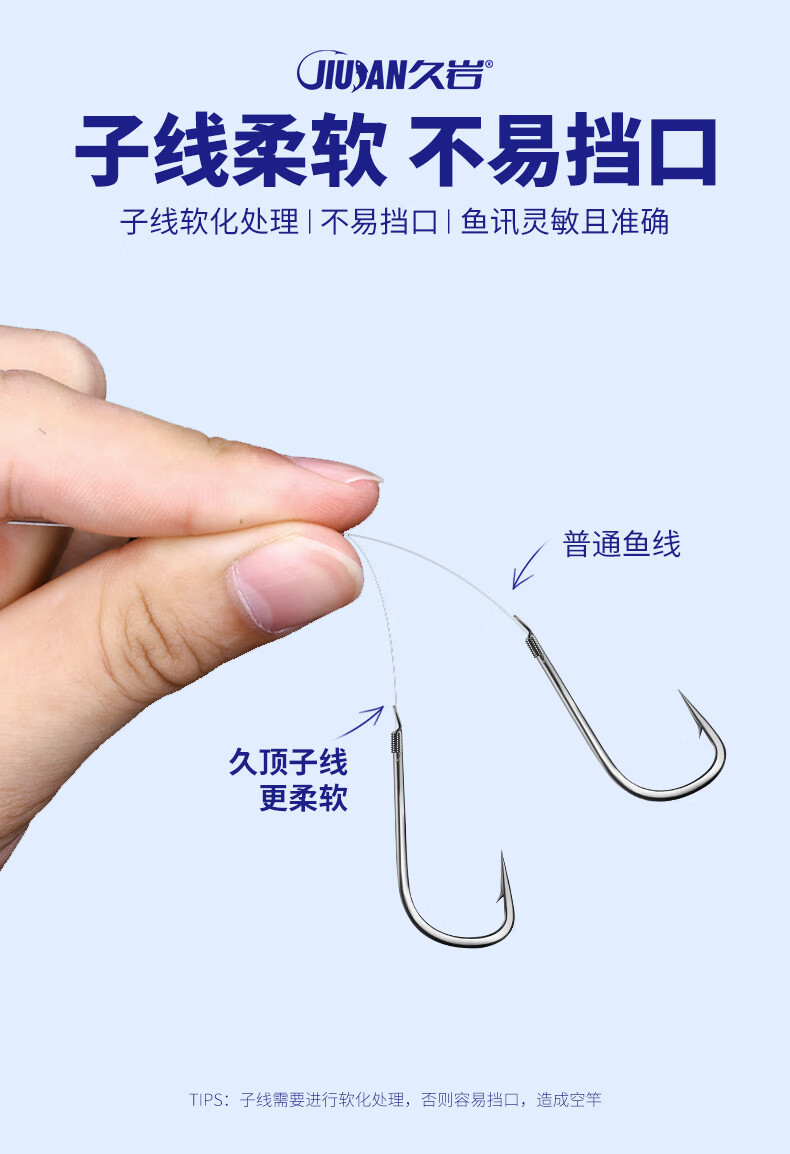Jiuyan's tough front sleeves are tied with good sub-threads and double hooks. Finished set sleeve hooks are thorn-free for wild fishing crucian carp and are anti-winding short sub-thread fish hooks. 25cm tough front sleeves have thorns. Hooks are 5 and 0.8.