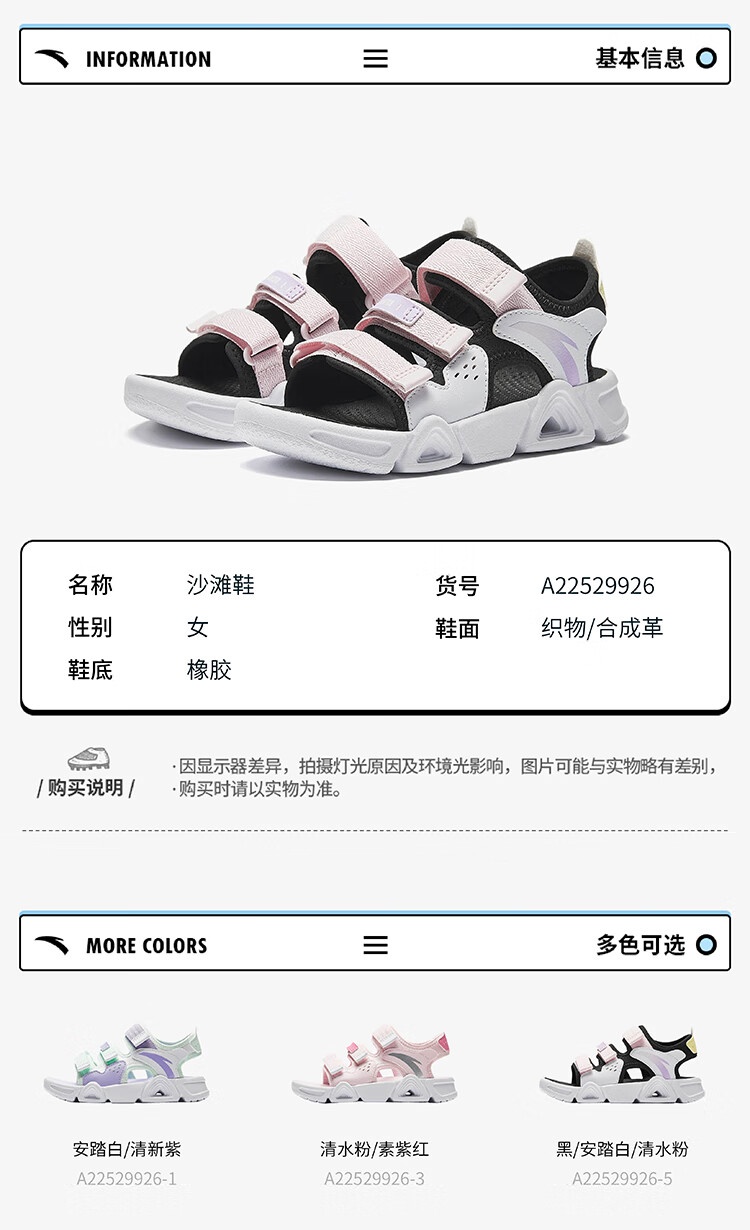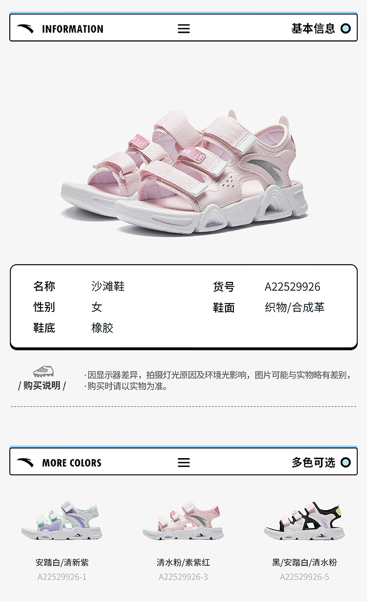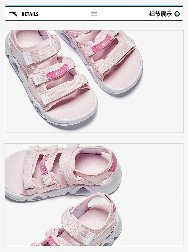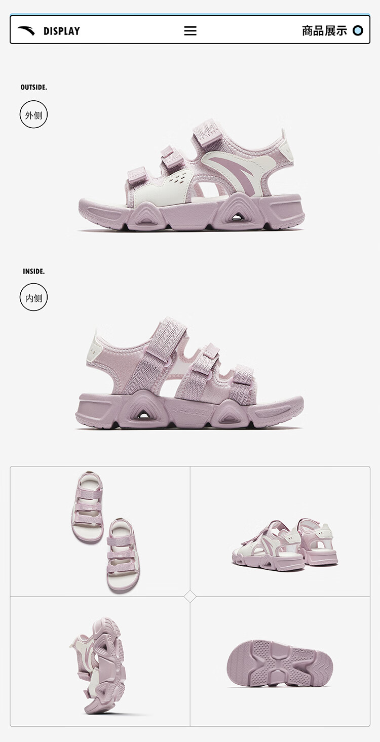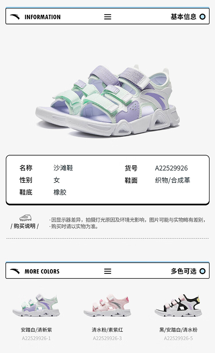 ANTA Children's Sandals Girls' Shoes 2025 Summer New Velcro Outdoor Arch Lingbo Open-Toe Beach Shoes Anta White/Fresh Purple-1 28 Shoe Inner Length 17.5cm