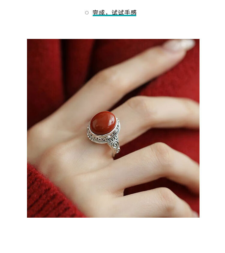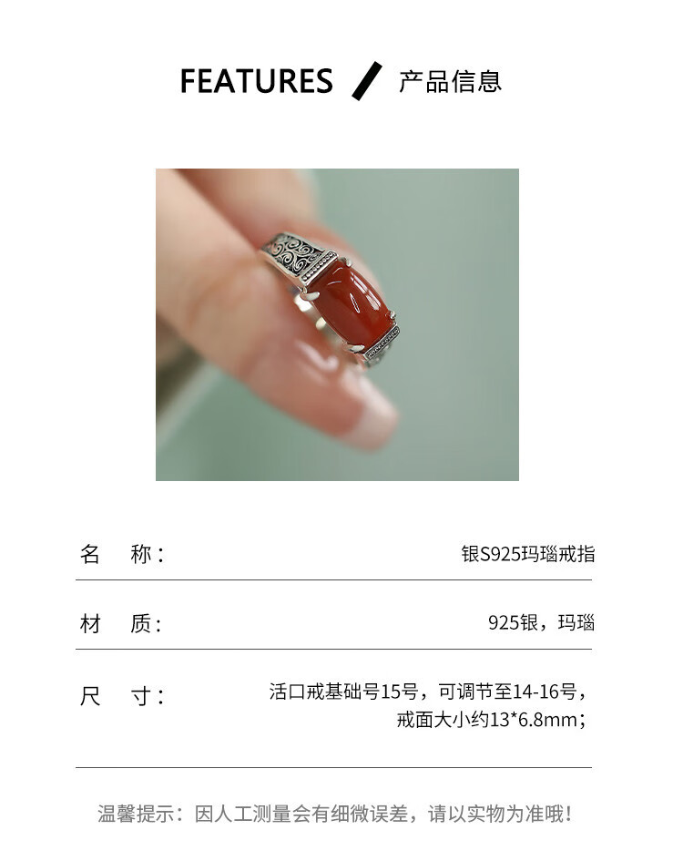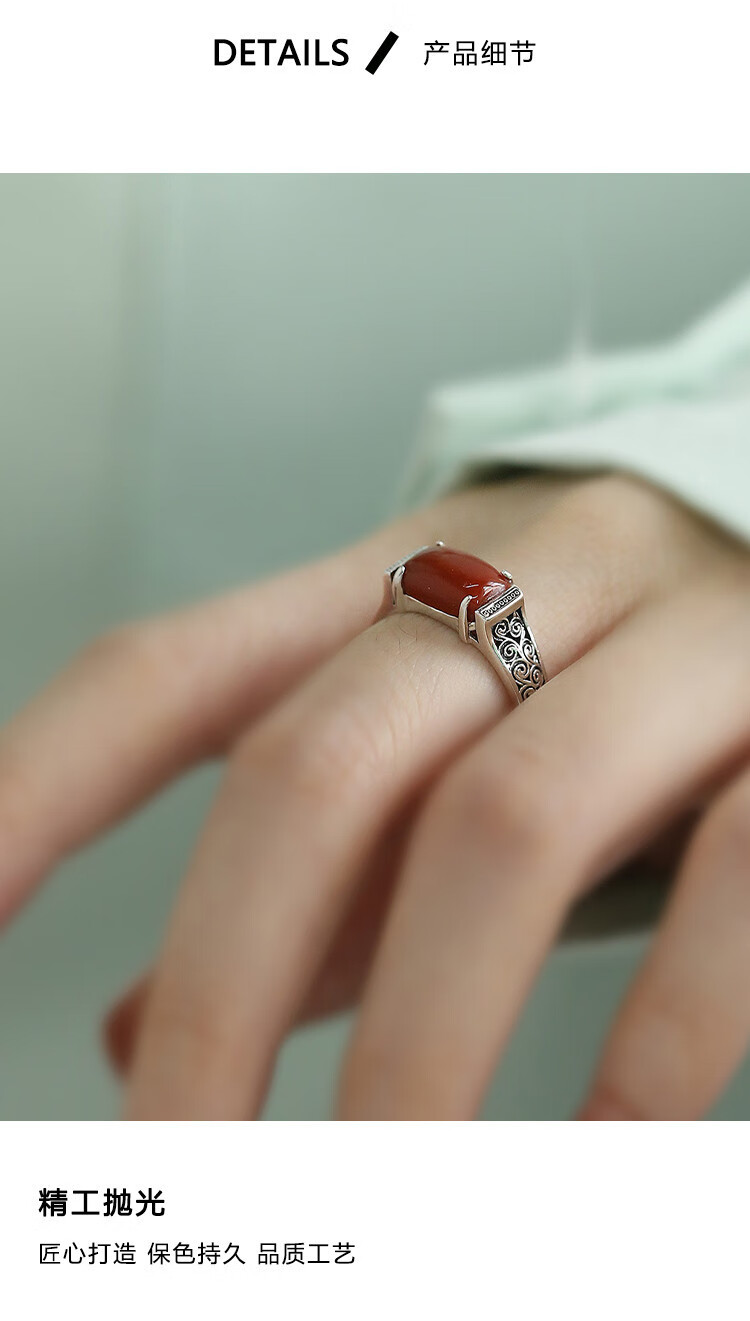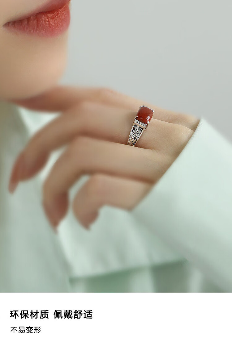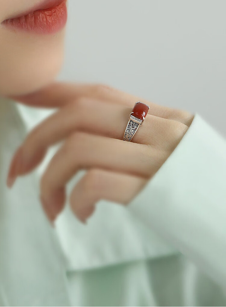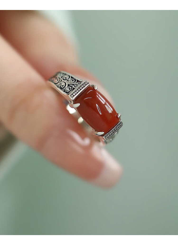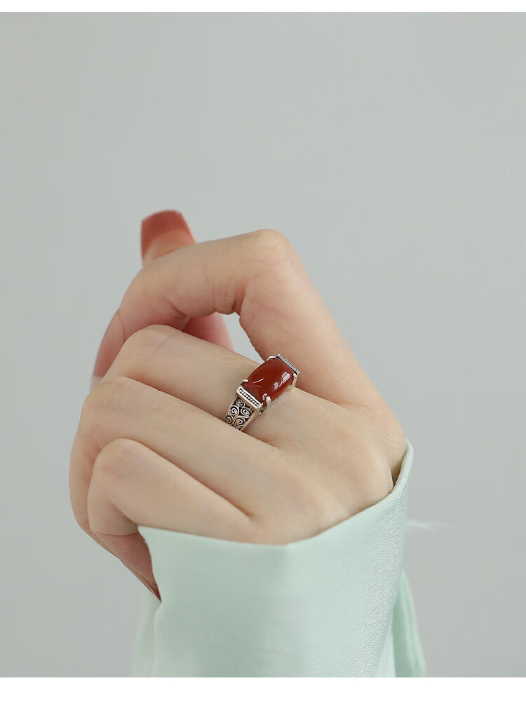 BOIGO925 Silver Tang Grass Pattern Southern Red Agate Square Ring Chinese Style Gift Adjustable Ring Jewelry Silver + Red One Size