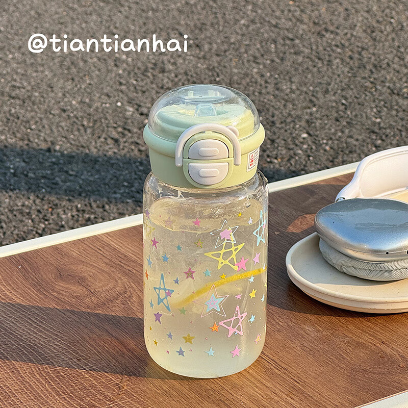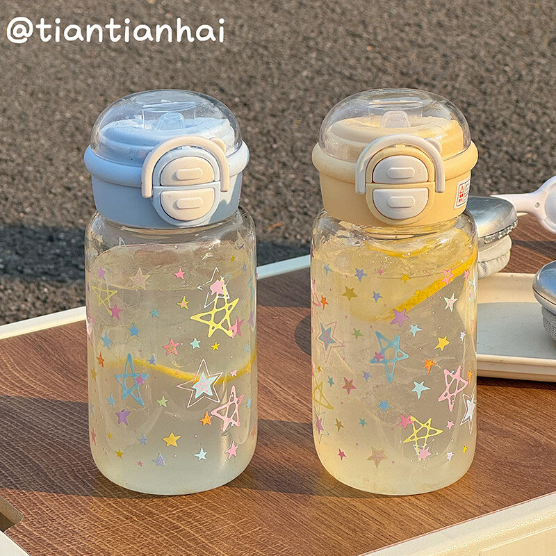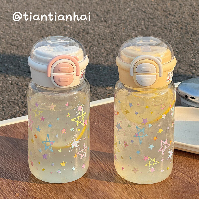 Juyoujia cup for women with good looks in summer plastic straw cup cartoon star water cup for children and students portable double drinking cup white pink sweet cool star transparent straw cup 500ml
