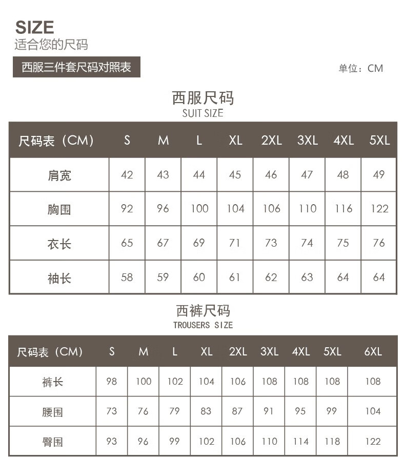 China (cm) 165 / 88-90 170 / 96-98 175 / 108-110 180 / 118-122 185 / 126-130