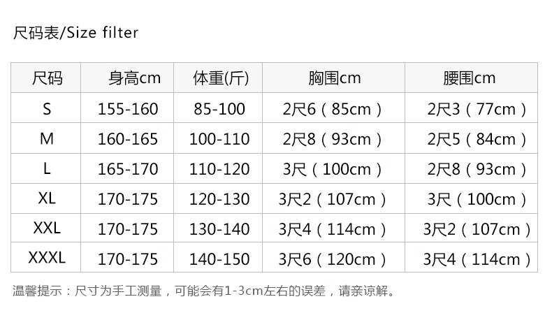China (cm) 165 / 88-90 170 / 96-98 175 / 108-110 180 / 118-122 185 / 126-130
