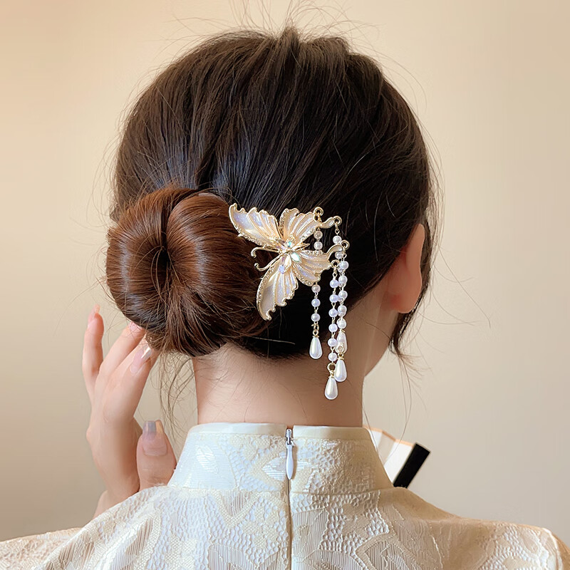 Nianfu New Chinese Style Butterfly Pearl Hairpin for Women Ancient Style Tassel Temperament U-shaped Hairpin Mid-Autumn Festival Gift for Girls White Butterfly Two-Tooth Hairpin