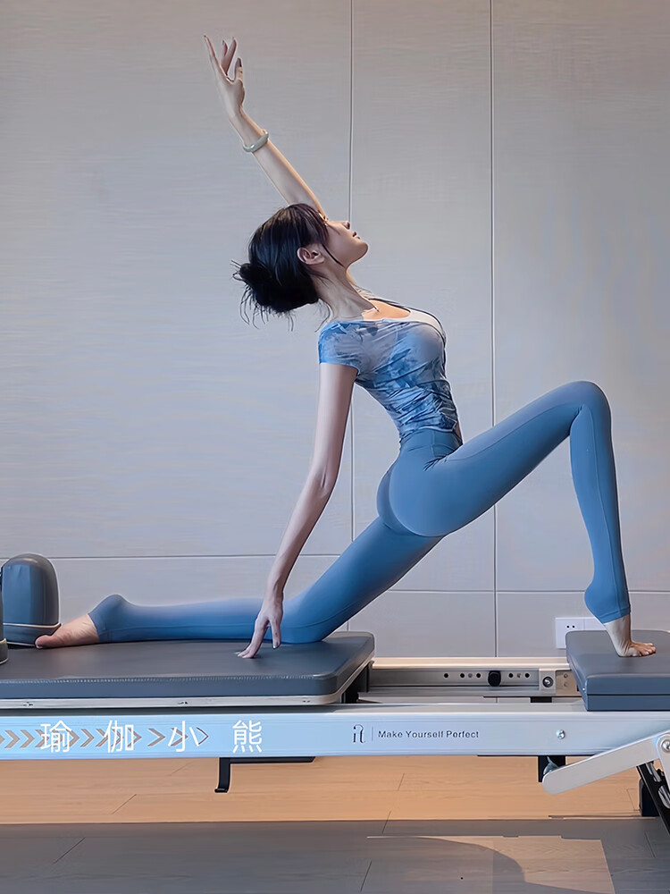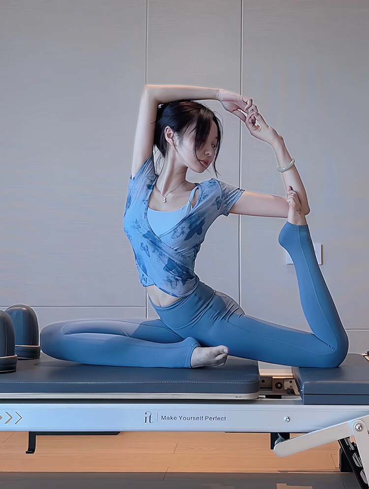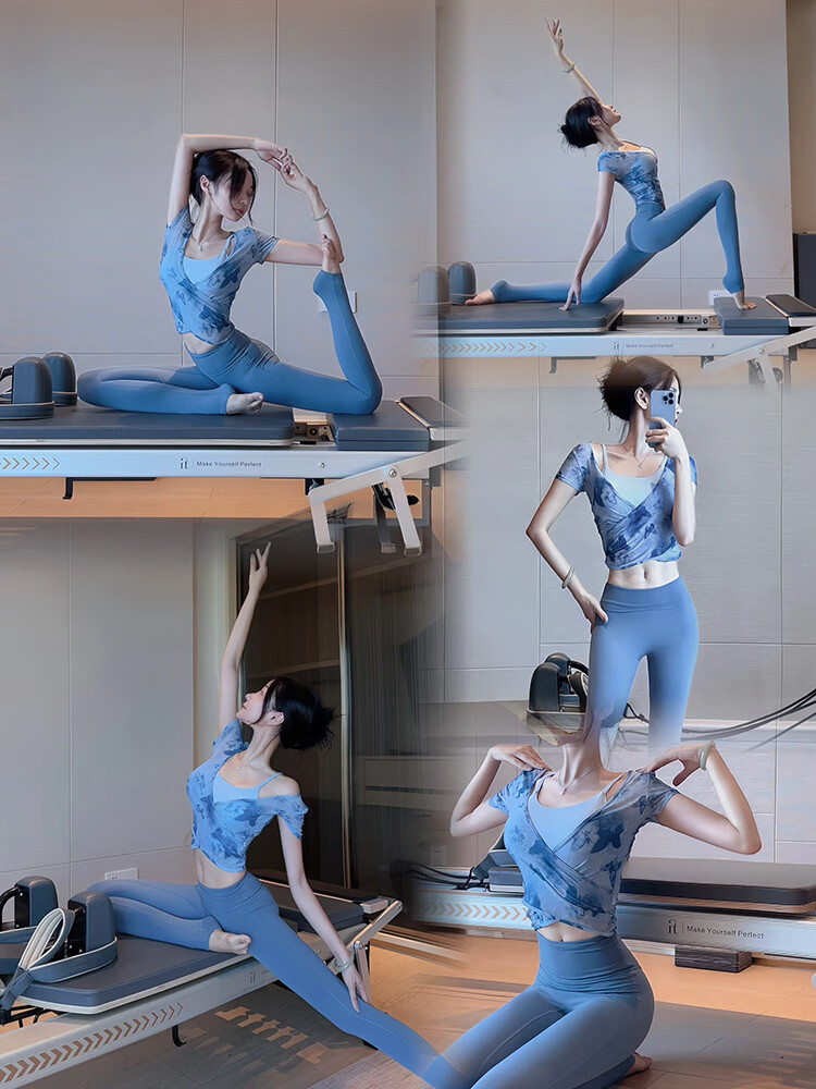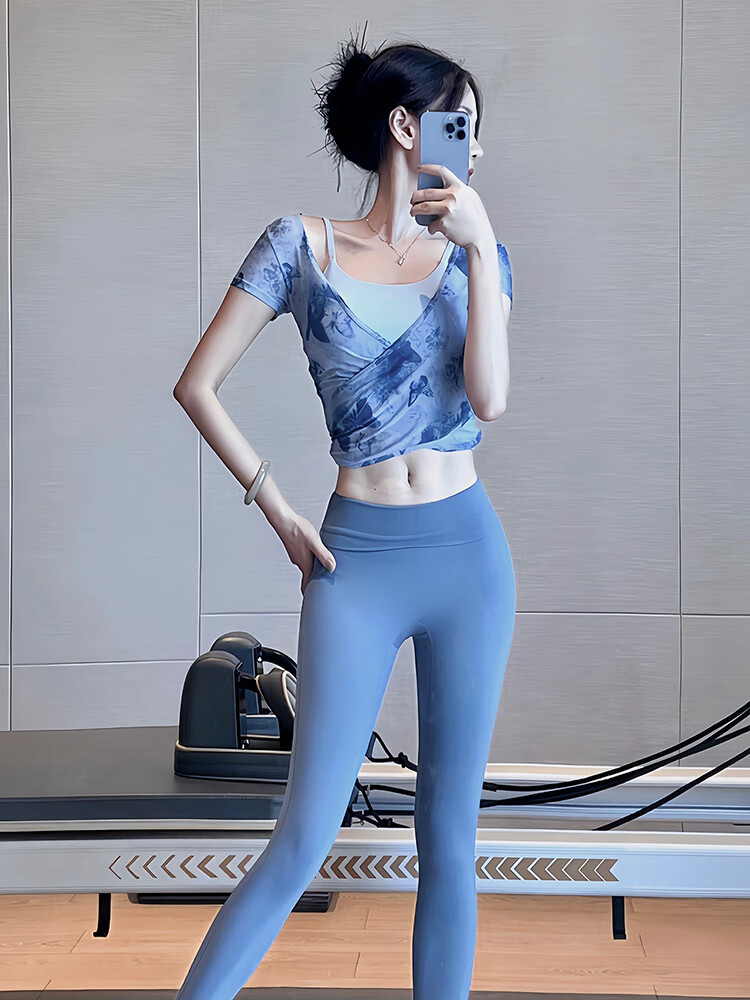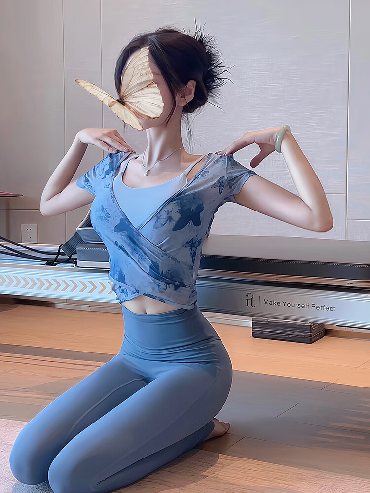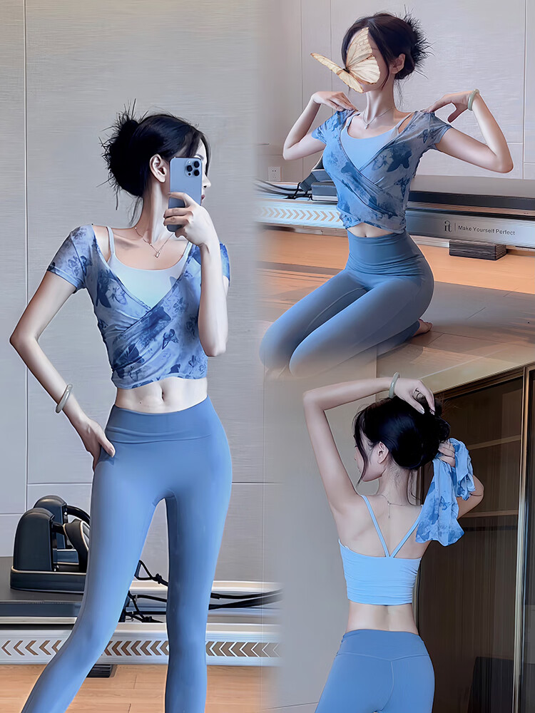 Kangaroo (DAISHU) yoga clothing set, high-end three-piece Pilates training clothing, Chinese style yoga clothing tops for women, beautiful fitness clothing, three-piece set, wind chime blue blouse + wind chime blue text L (108-118Jin Jin equals 0.5 kg)