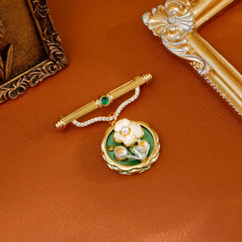 Medieval vintage brooch female palace oil painting pearl niche design suit pin corsage Mother's Day gift 18K gold green brooch
