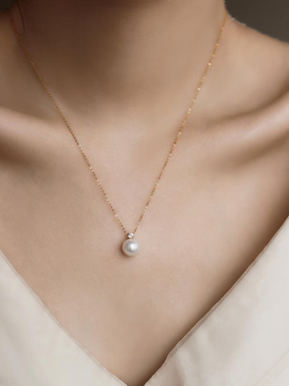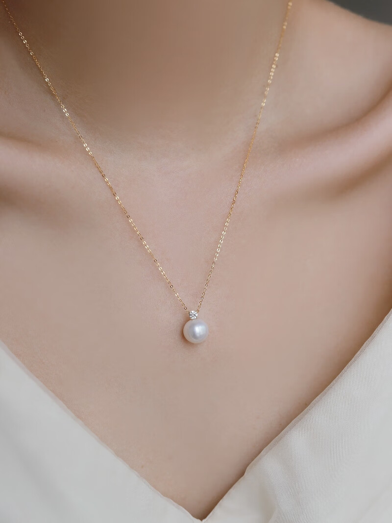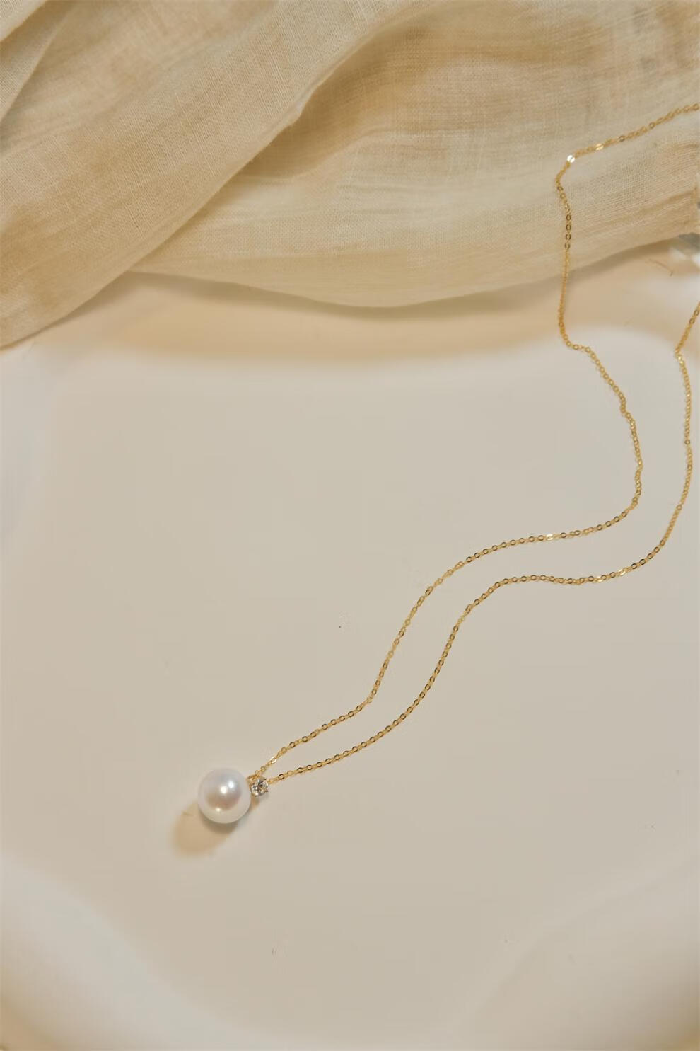 Fat Donglai same style pearl pendant 18k18k gold princess style freshwater pendant necklace round strong light single pearl Princess Diana k yellow with chain 9-10mm