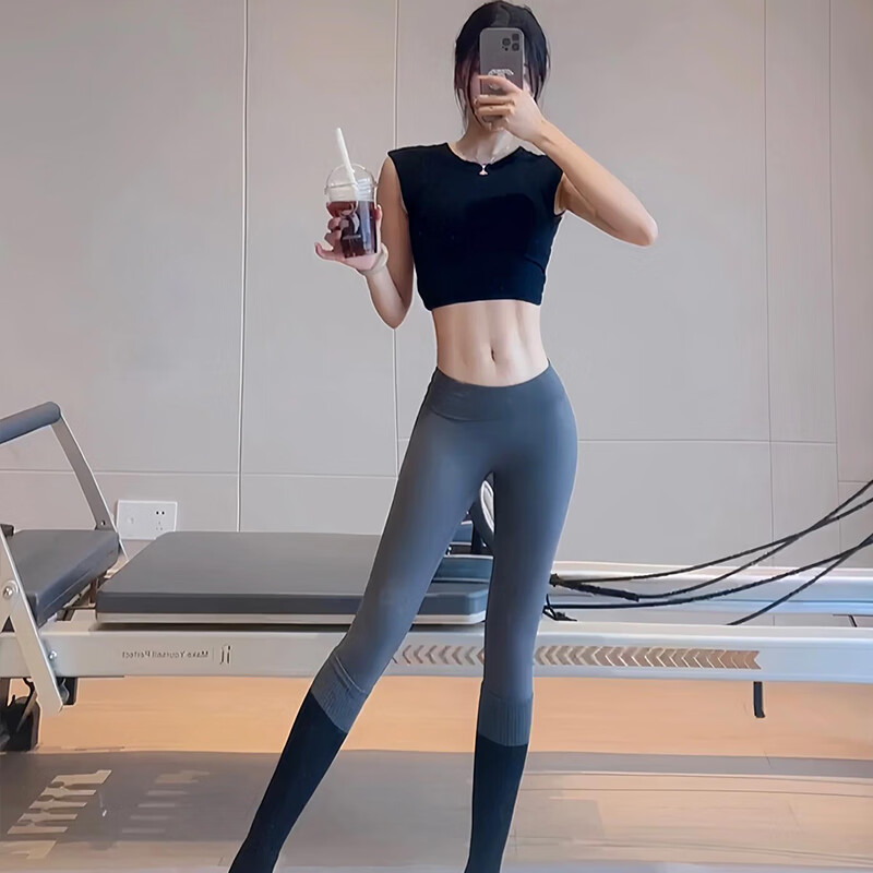 Kangaroo (DAISHU) 2025 new style yoga top vest with chest pad all-in-one sports fitness top yoga pants Pilates suit set black vest + gray pants M (95-108Jin Jin equals 0.5 kg)