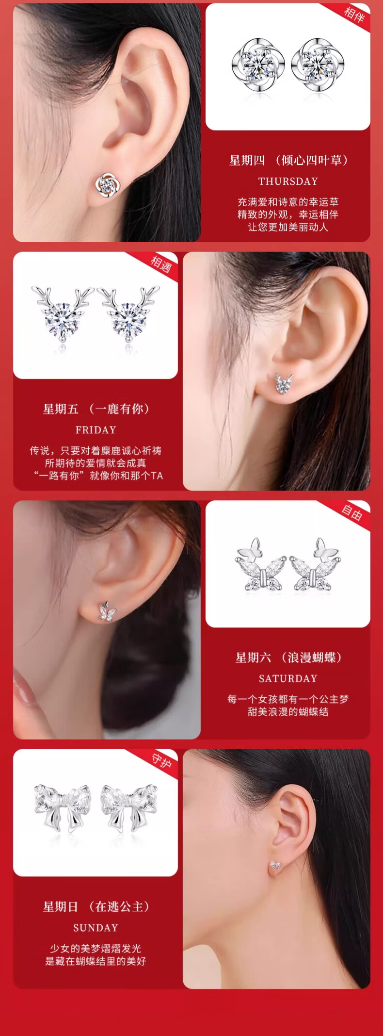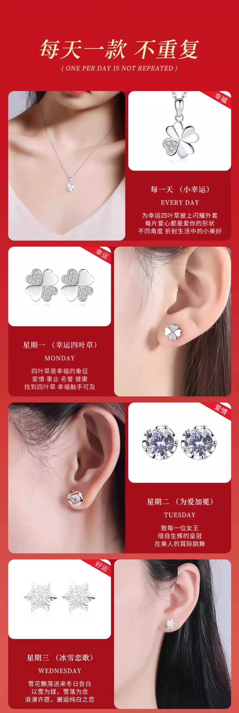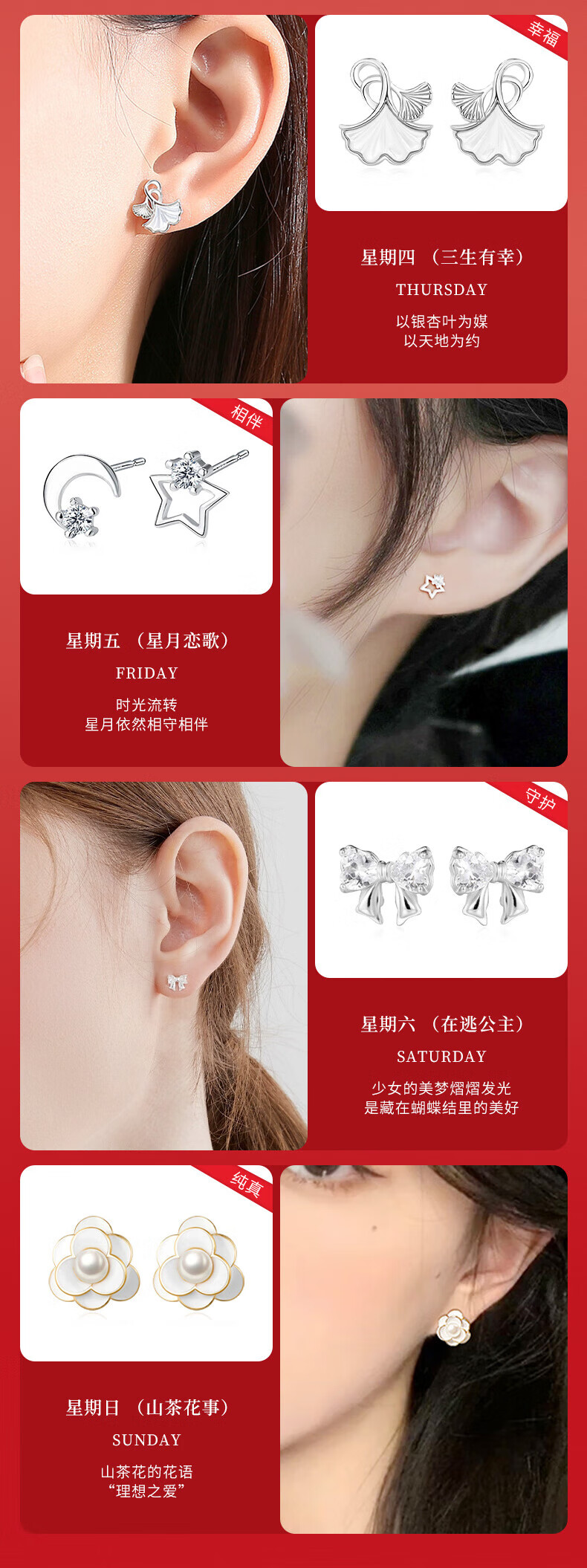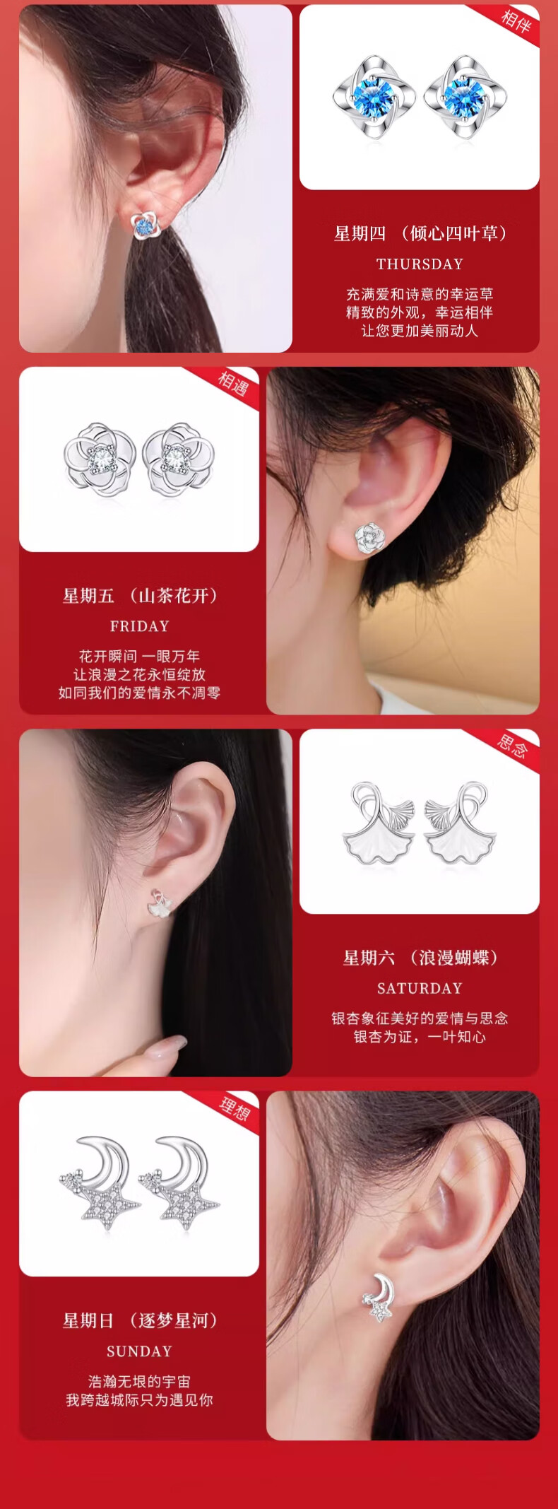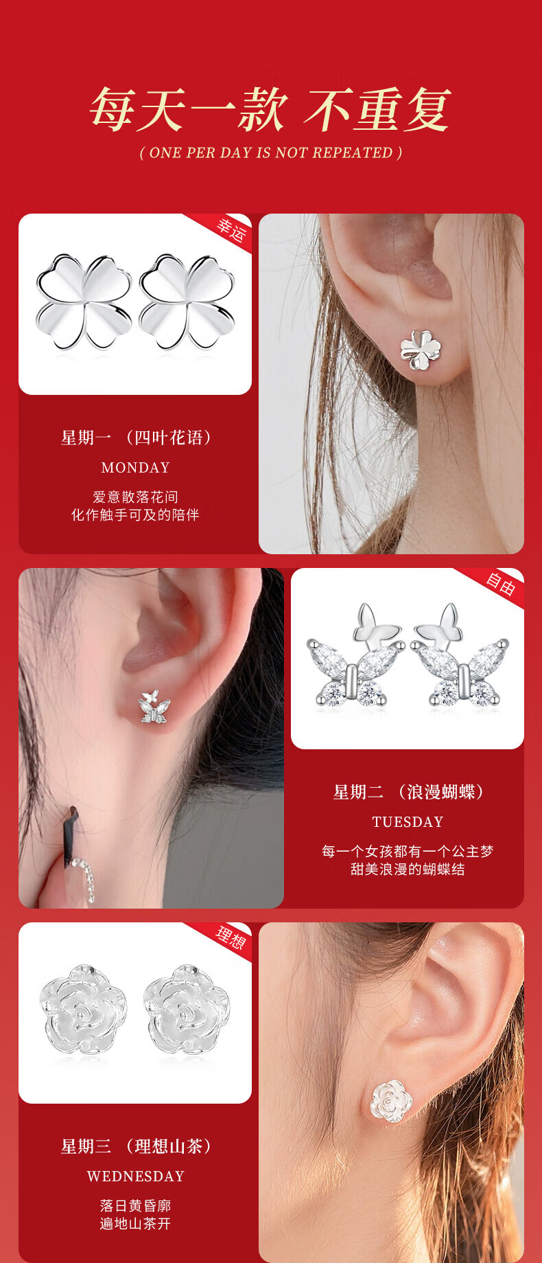 CHINA GOLD Pure Silver Necklace 925 Silver Earrings One Week Earrings Earrings High-end Light Luxury Jewelry Practical Birthday Gifts for Valentine's Day Recommended Birthday Gifts One Week Earrings - Seven Pairs