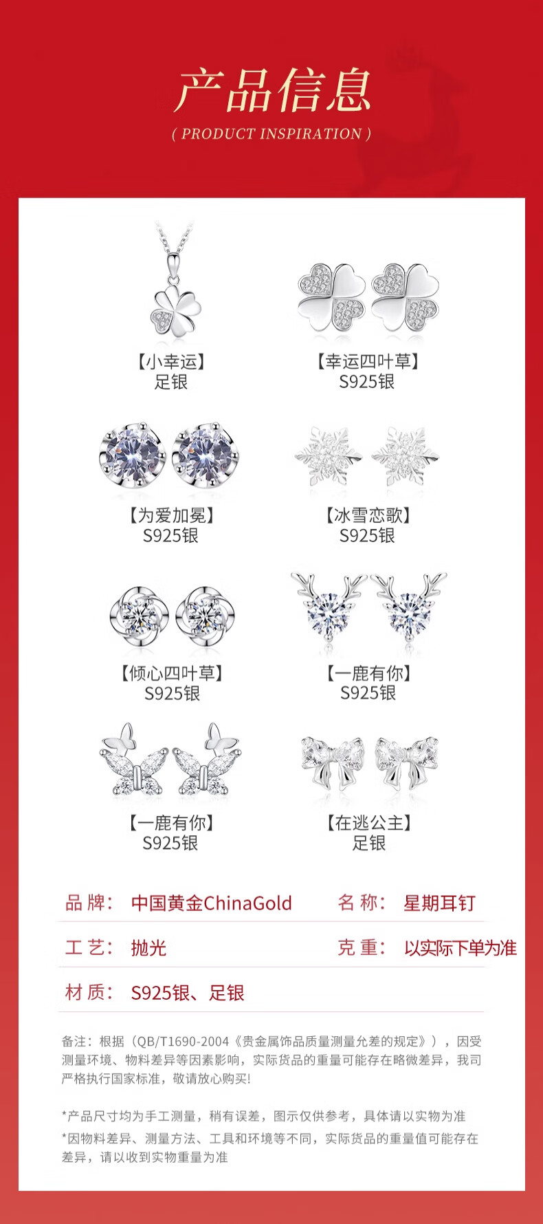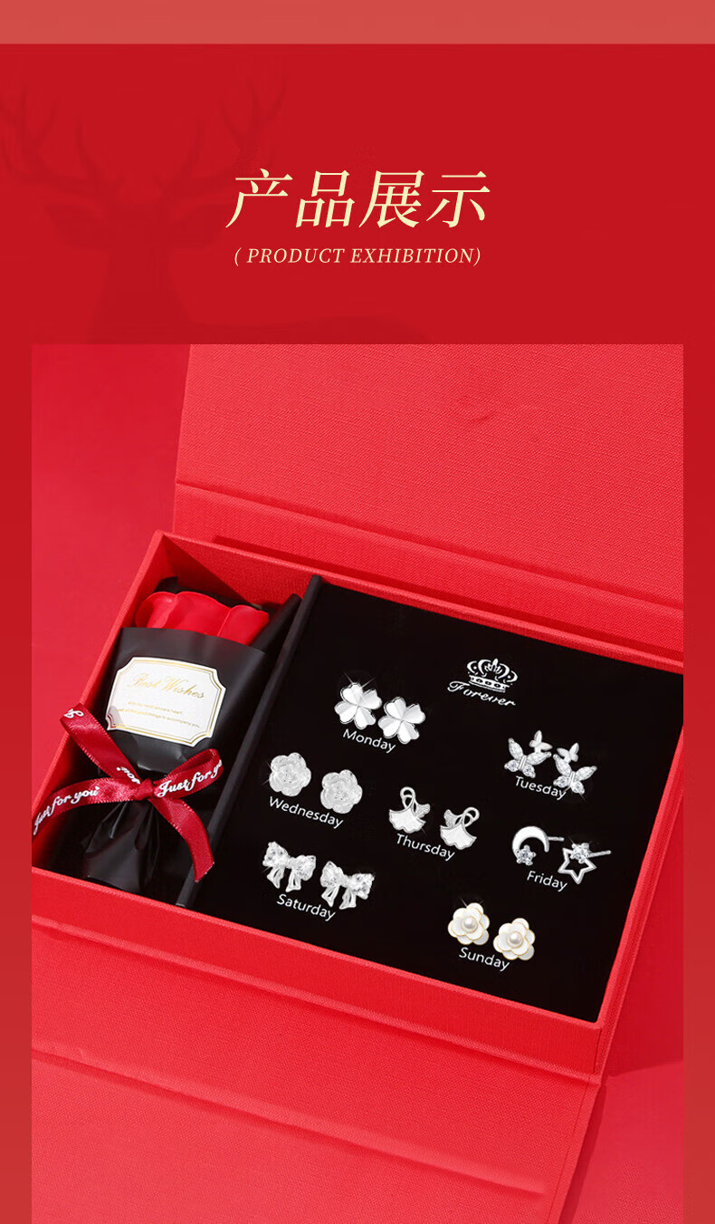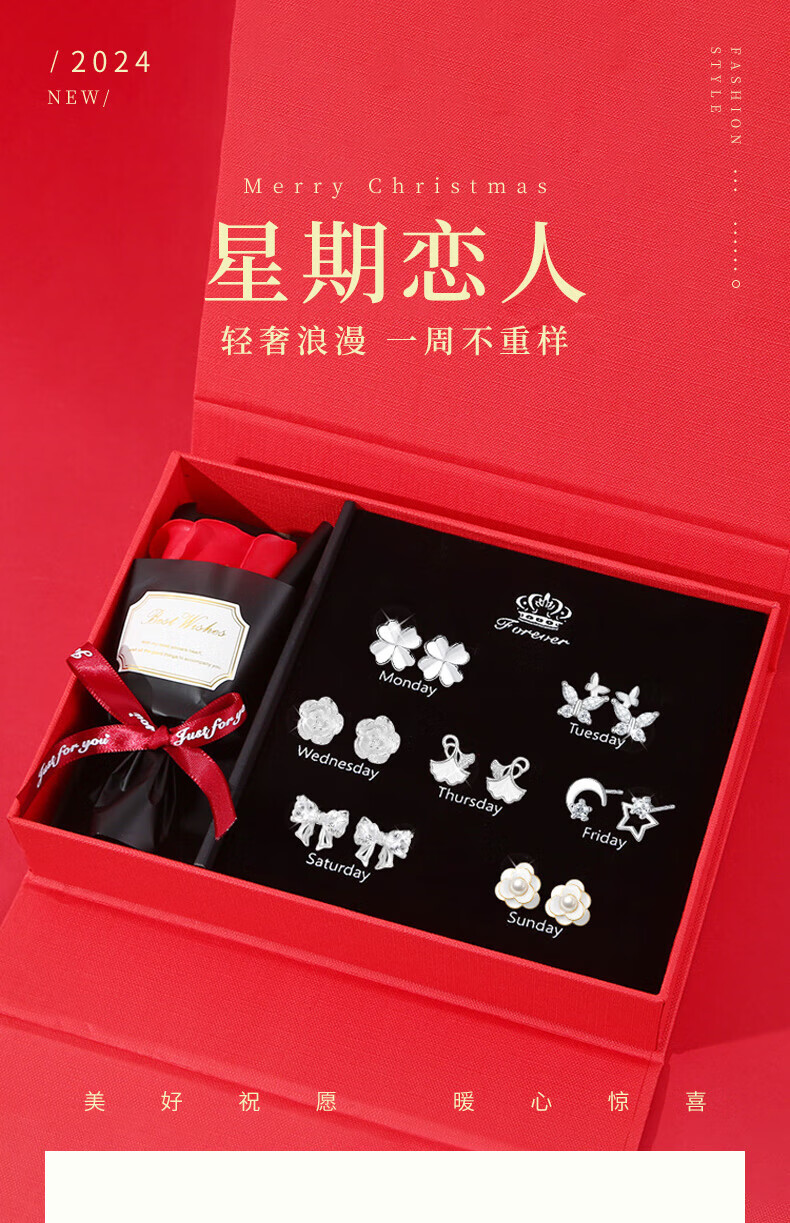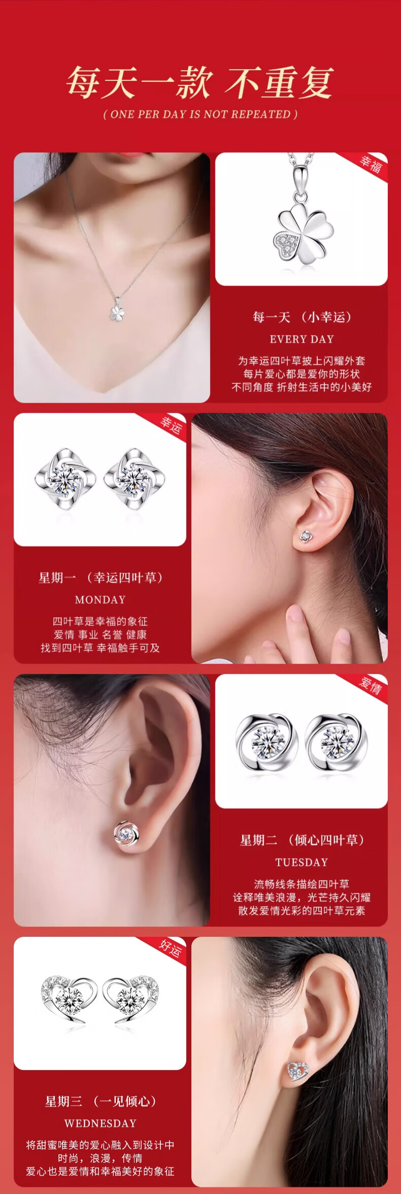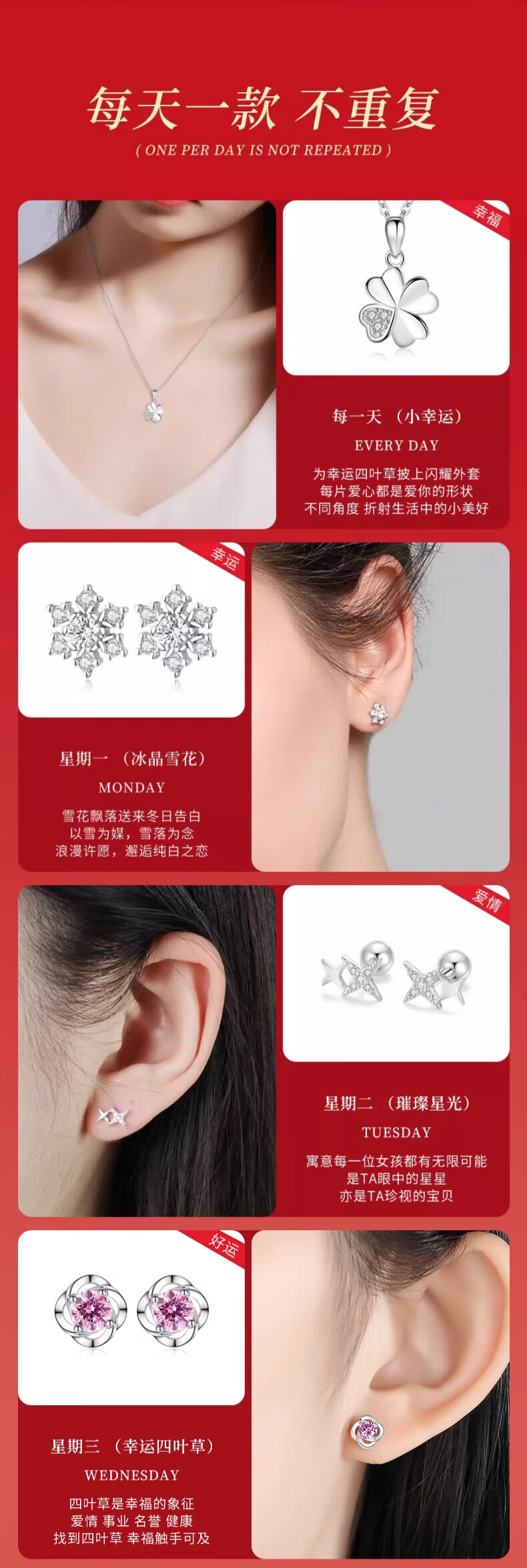 CHINA GOLD Pure Silver Necklace 925 Silver Earrings One Week Earrings Earrings High-end Light Luxury Jewelry Practical Birthday Gifts for Valentine's Day Recommended Birthday Gifts One Week Earrings - Seven Pairs
