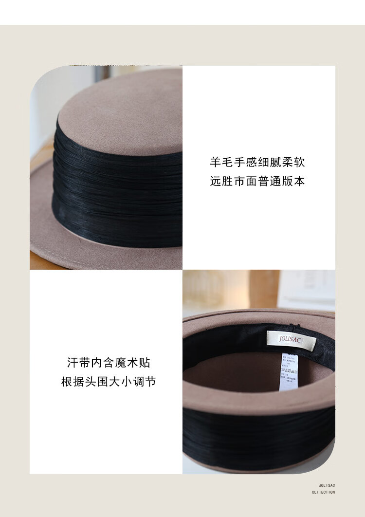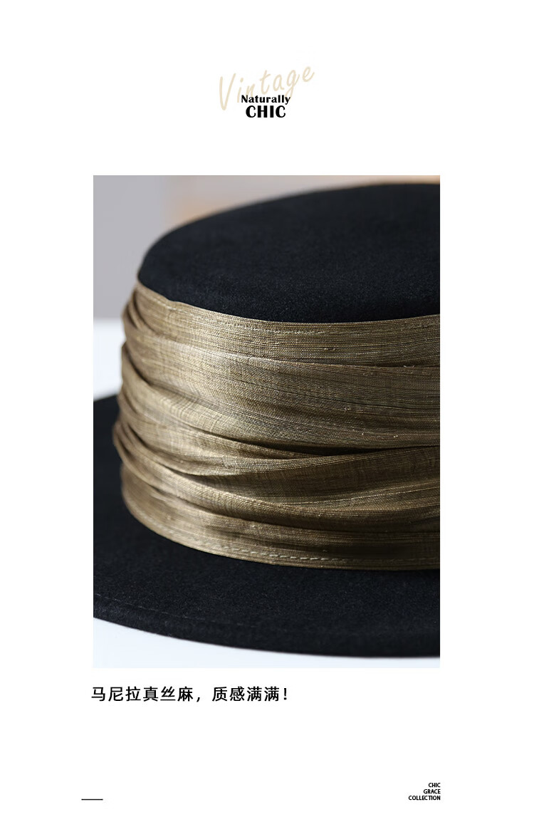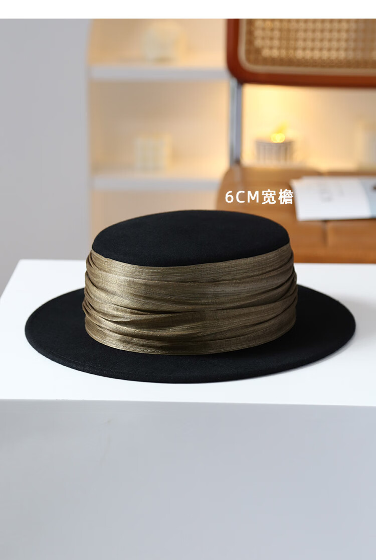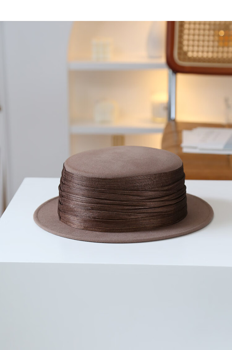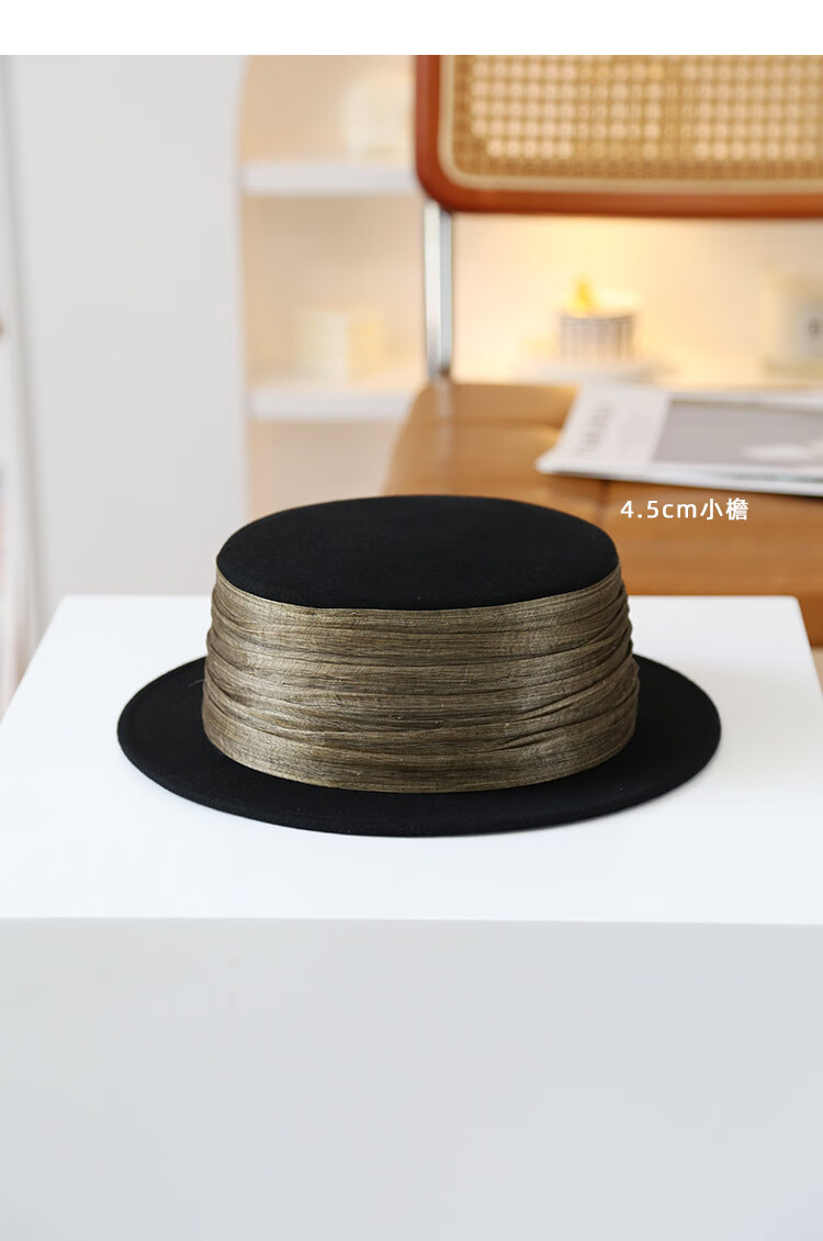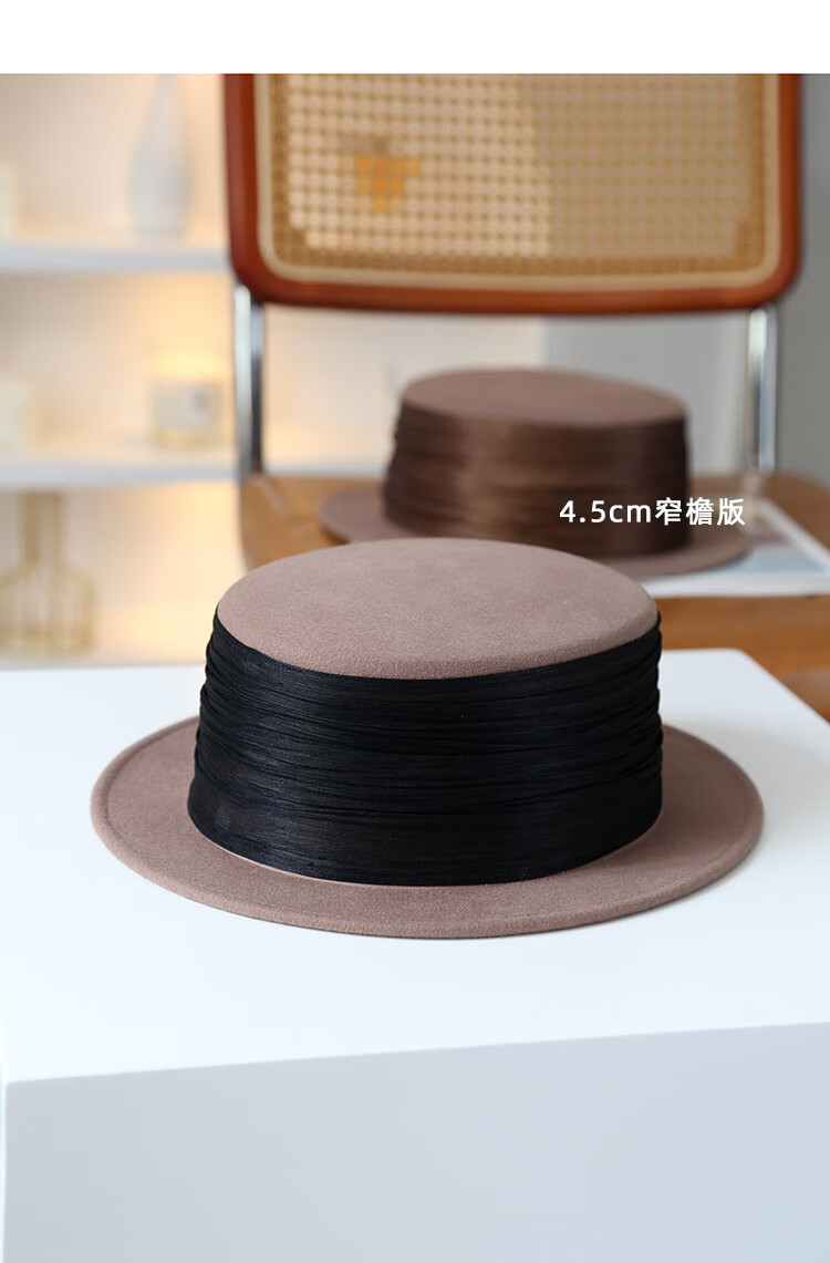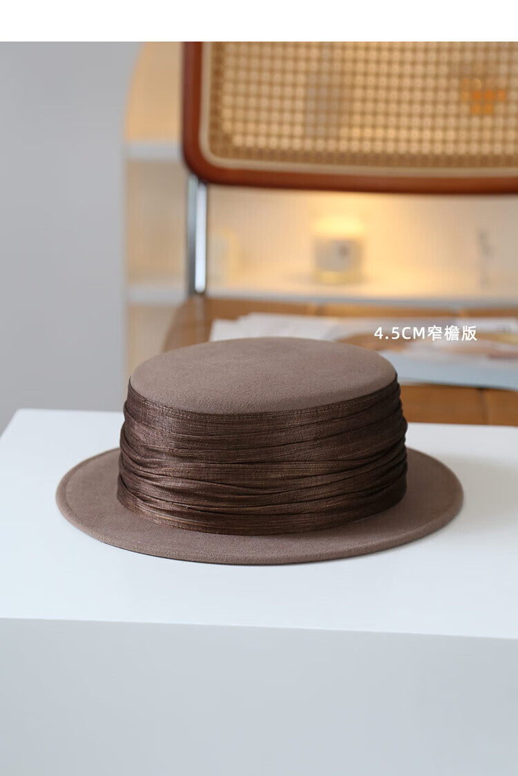 JOLISAC high-end niche Australian woolen flat hat for women pleated silk linen French retro flat brim hat short brim autumn and winter black with coffee 6CM wide brim adjustable