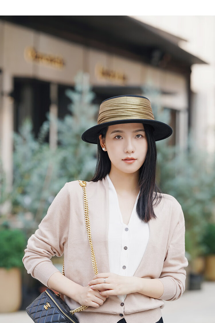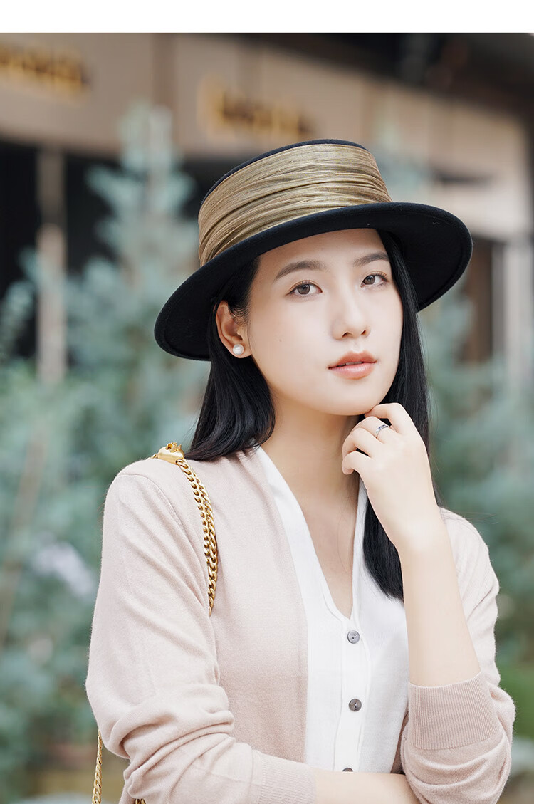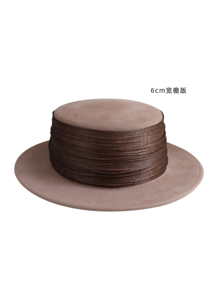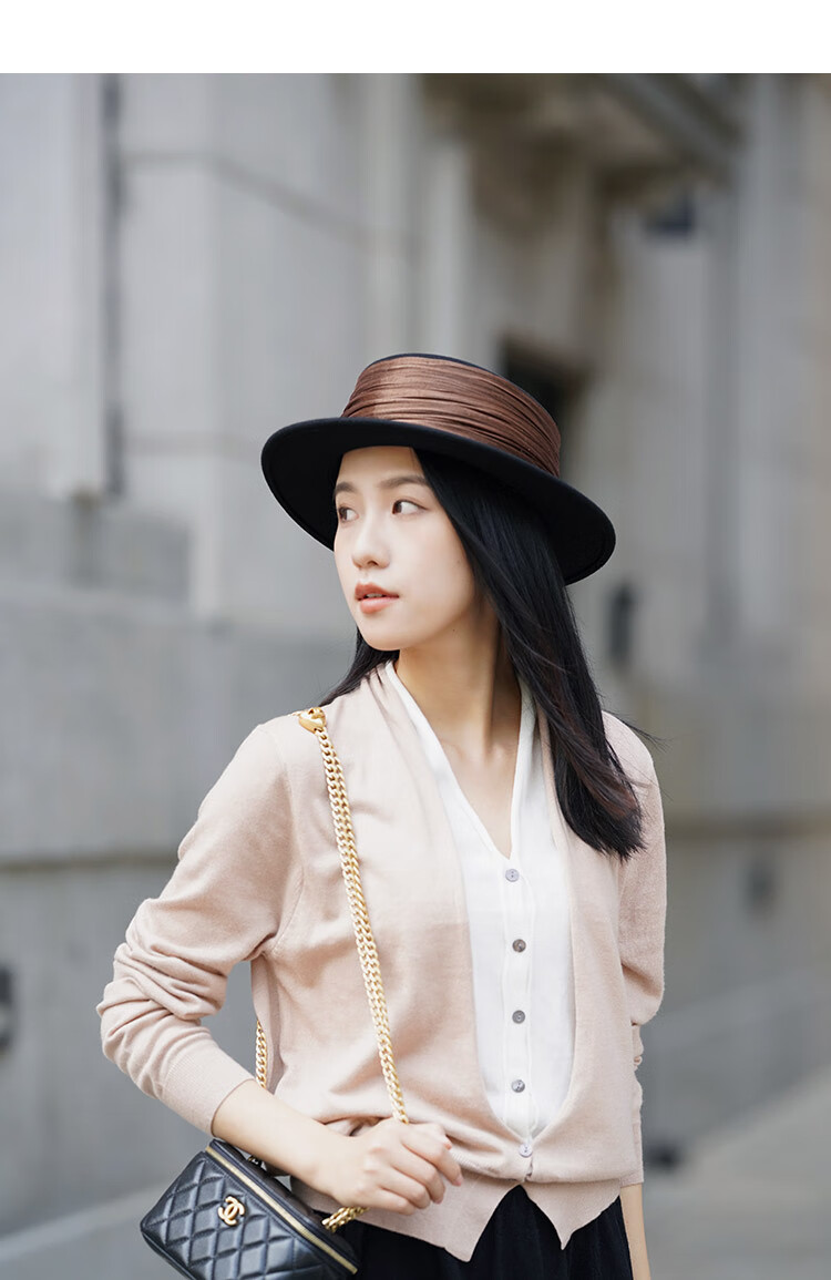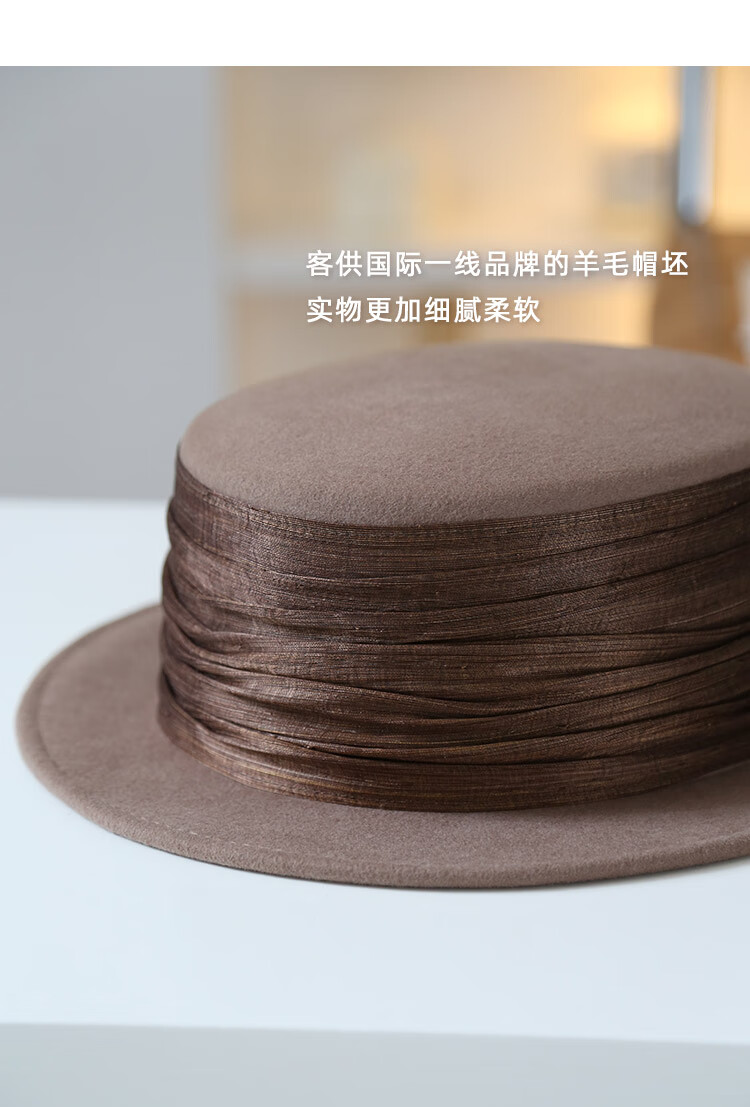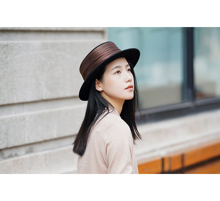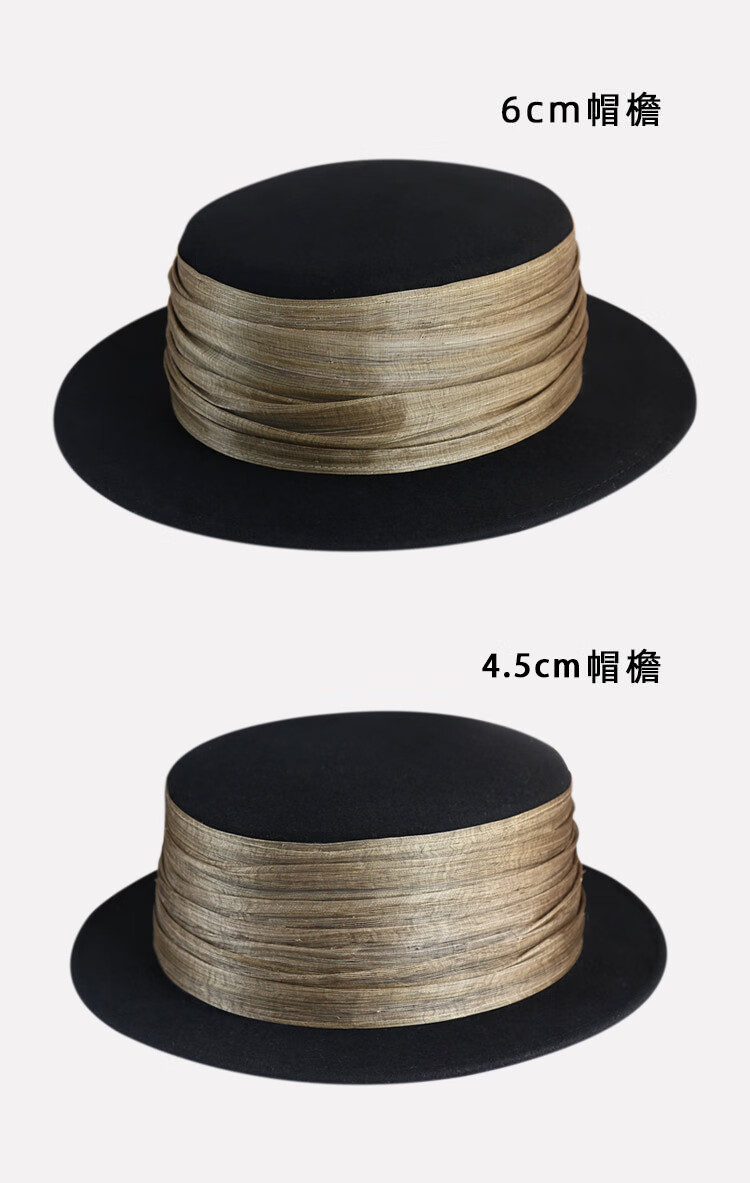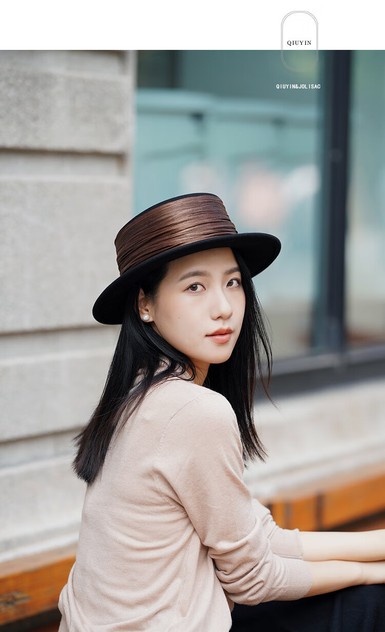 JOLISAC high-end niche Australian woolen flat hat for women pleated silk linen French retro flat brim hat short brim autumn and winter black with coffee 6CM wide brim adjustable