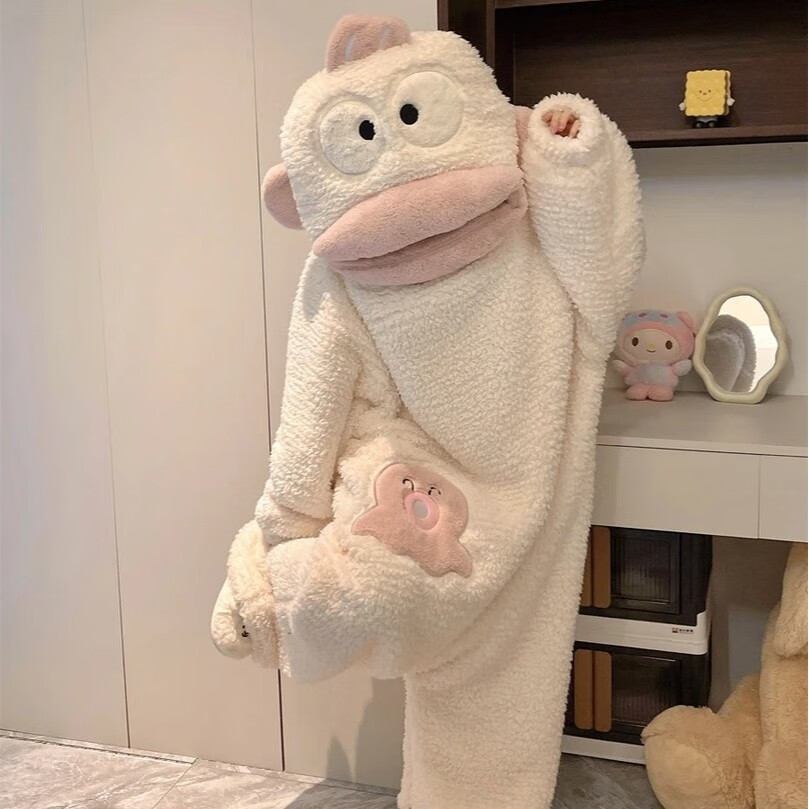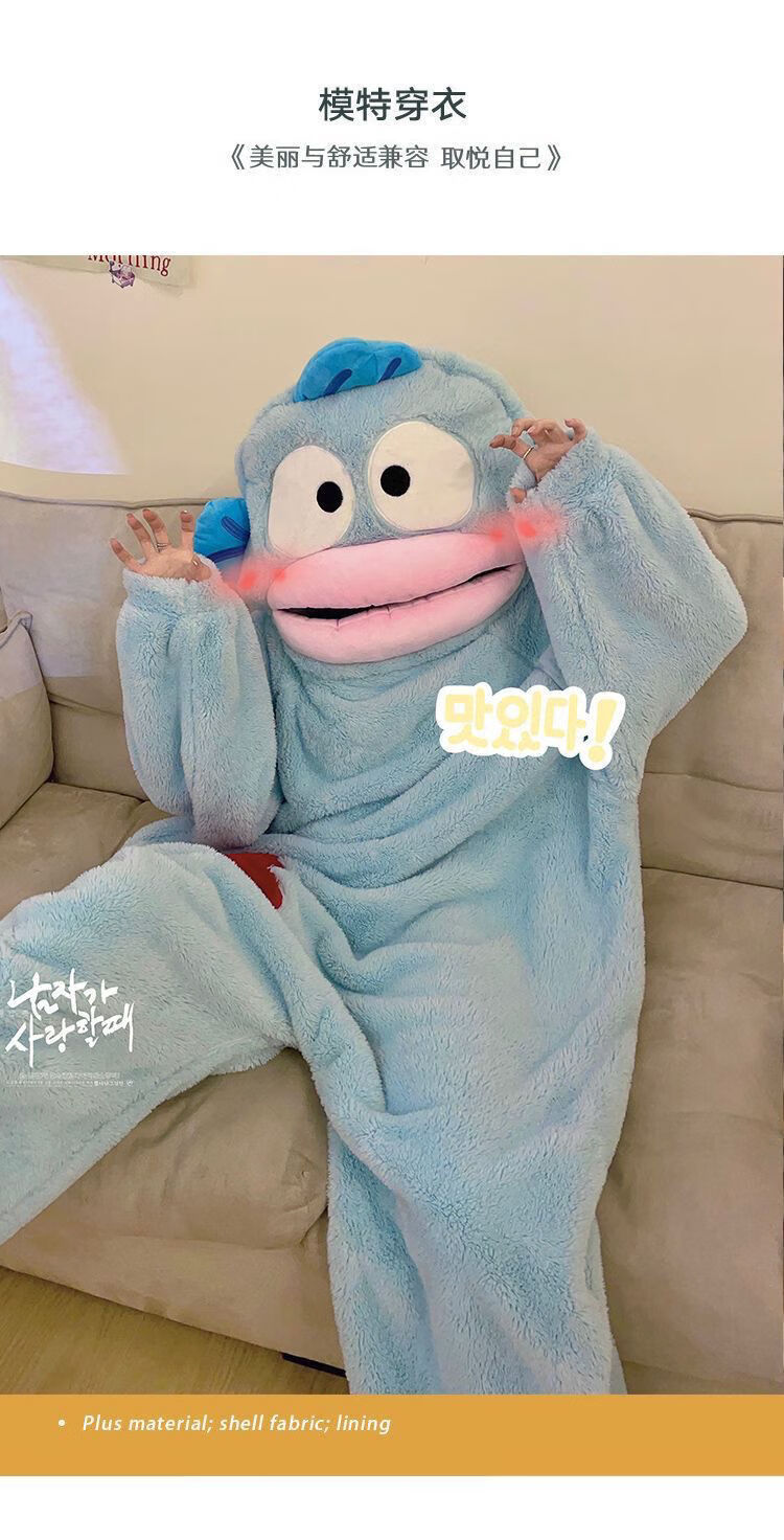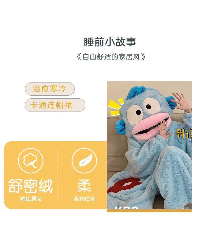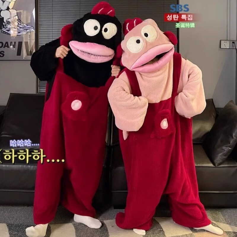 Funny Ugly Fish One-piece Pajamas Women's Coral Velvet Thickened Warm Autumn and Winter Cartoon Cute Couple Pajamas Home Clothes Ugly Fish One-piece Velvet One-piece+Shoes M 100-130Jin Jin equals 0.5 kg High-quality velvet