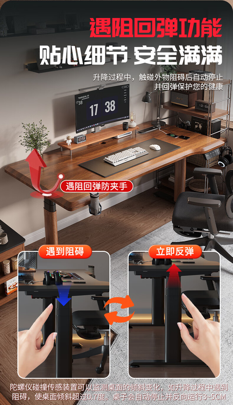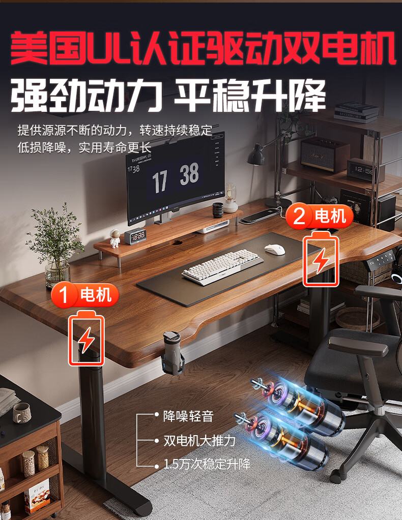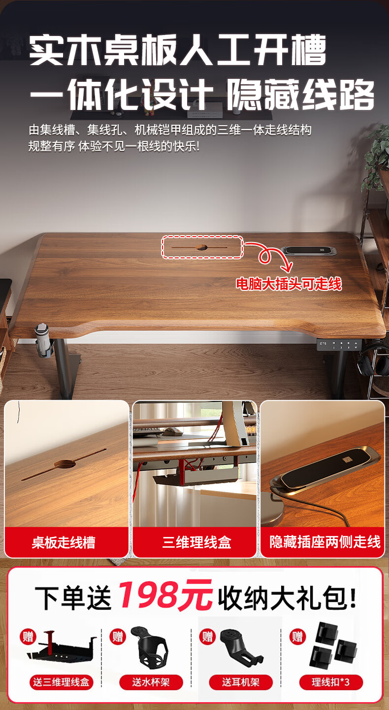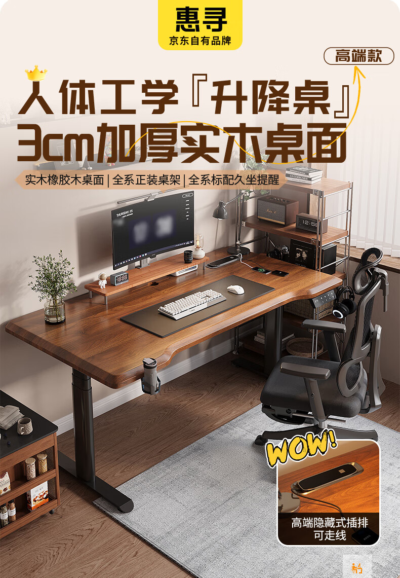Huixun Jingdong's own brand solid wood electric lifting table computer table desktop liftable workbench gaming table desk formal single motor 3cm solid wood walnut color 120*60 (hidden double-sided power strip)