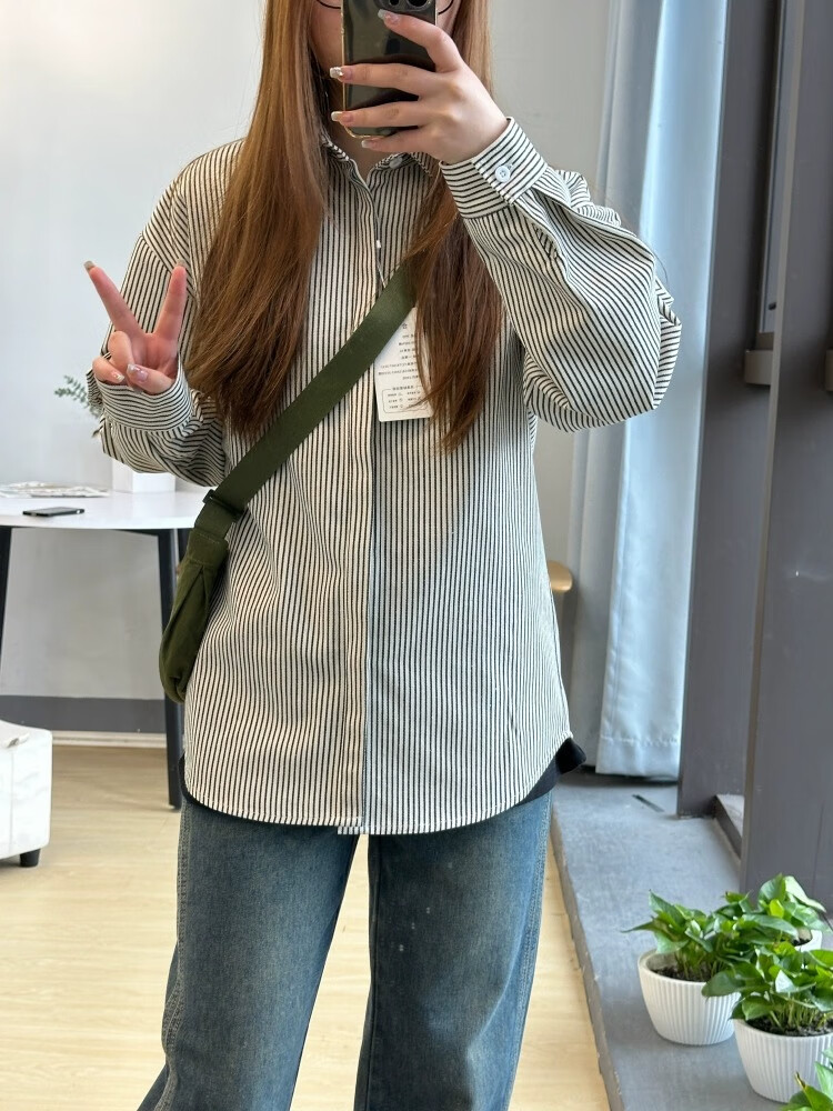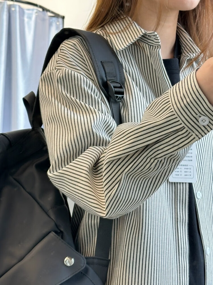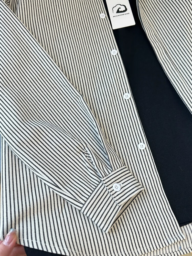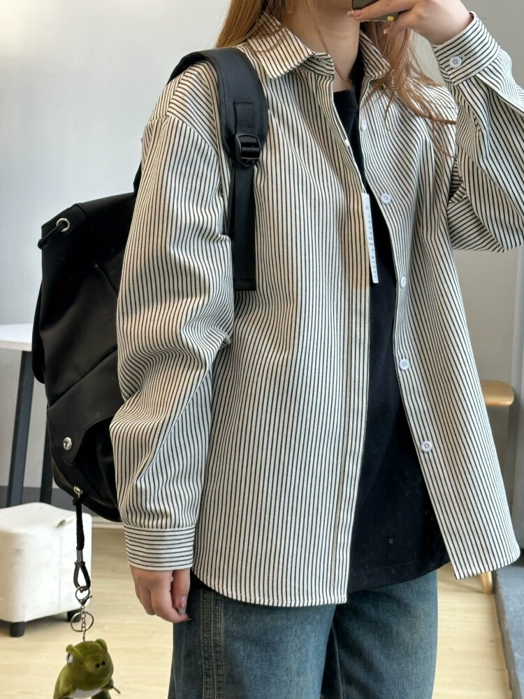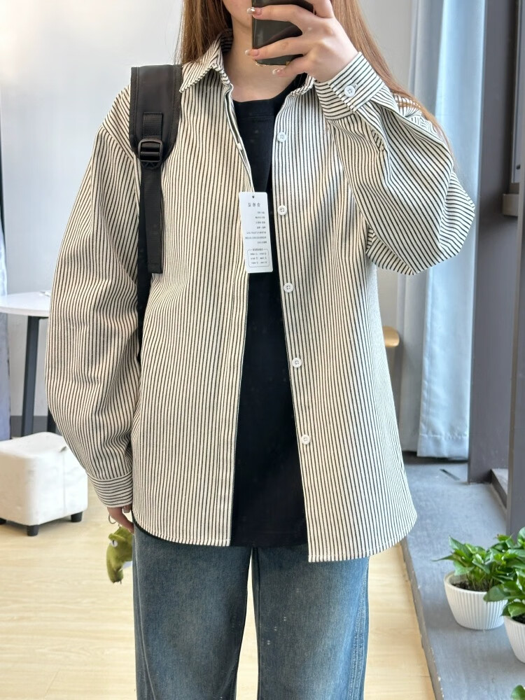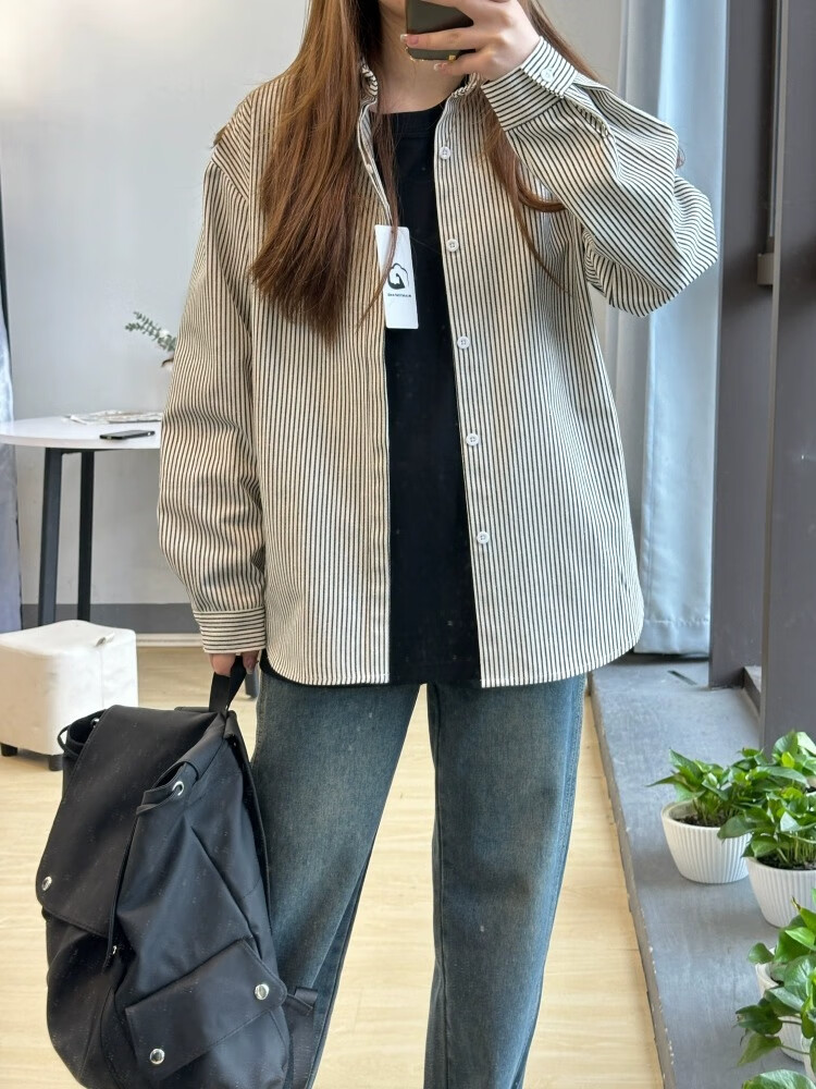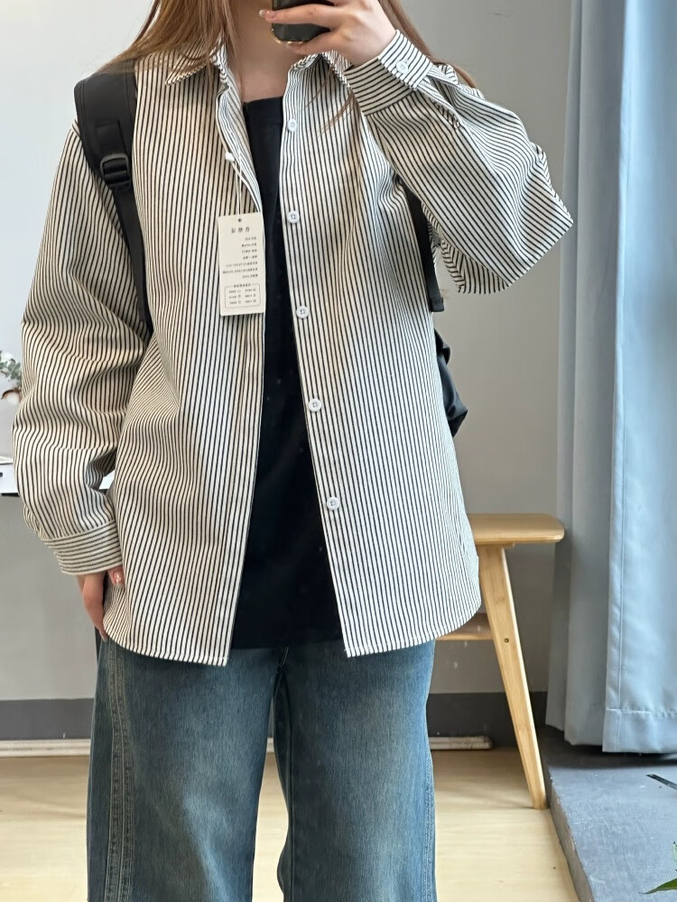 迪伽达复古条纹长袖衬衣男士春秋冬季新款衬衫男女同款休闲宽松开衫外套 ZSFS-C51黑色 XL