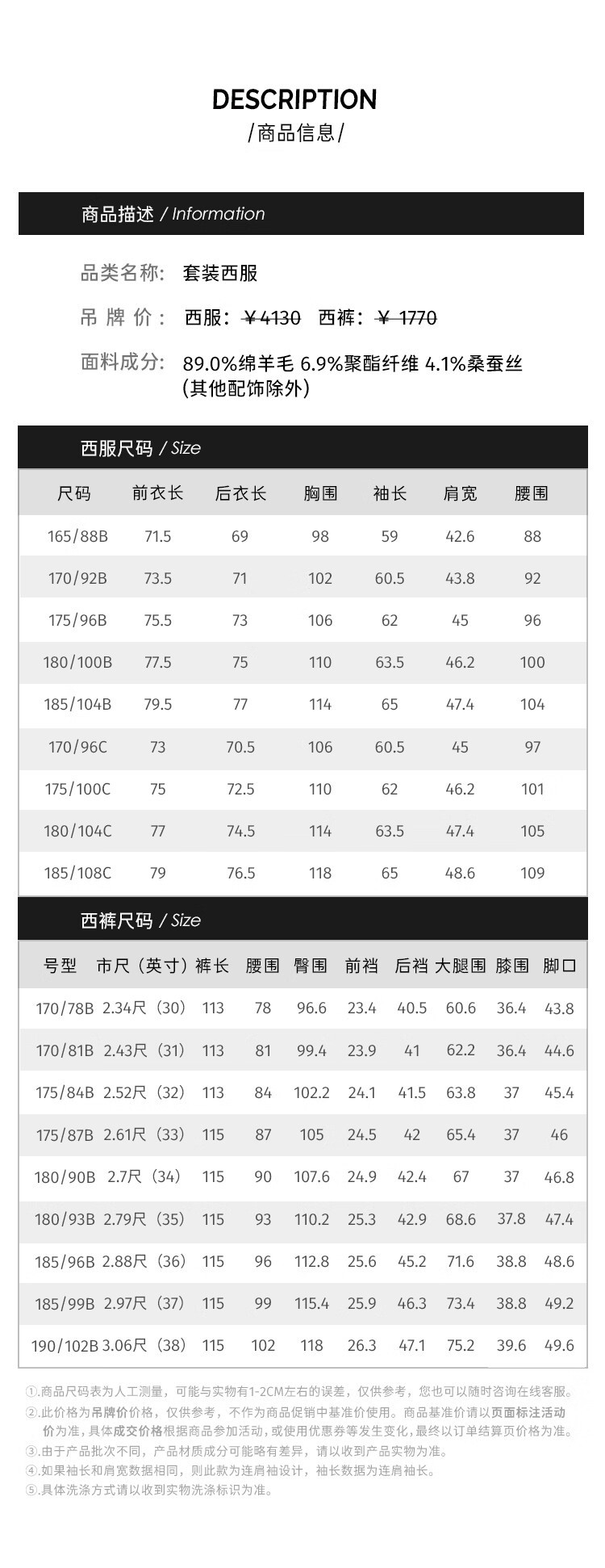 China (cm) 165 / 88-90 170 / 96-98 175 / 108-110 180 / 118-122 185 / 126-130