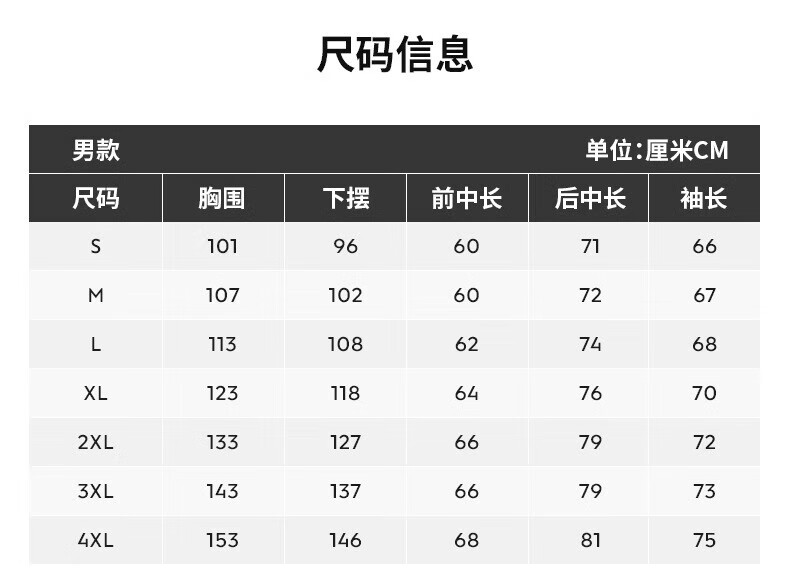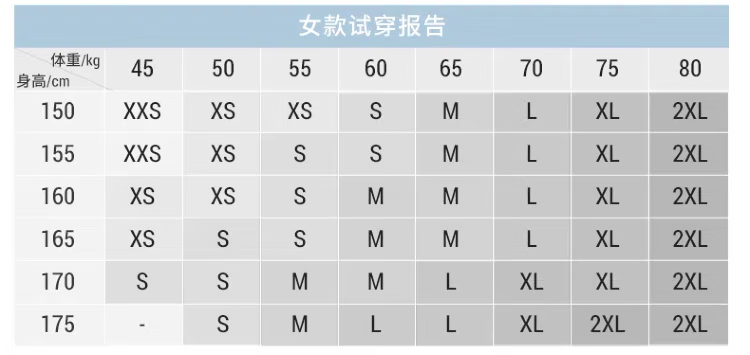 China (cm) 160-165/84-86 165-170 / 88-90 167-172 / 92-96 168-173 / 98-102 170-176 / 106-110