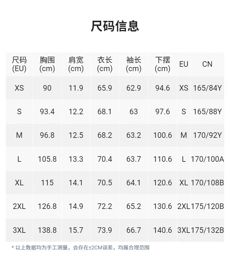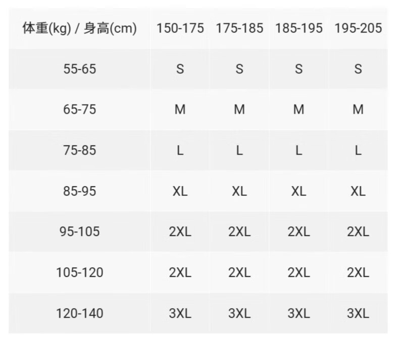 China (cm) 165 / 88-90 170 / 96-98 175 / 108-110 180 / 118-122 185 / 126-130