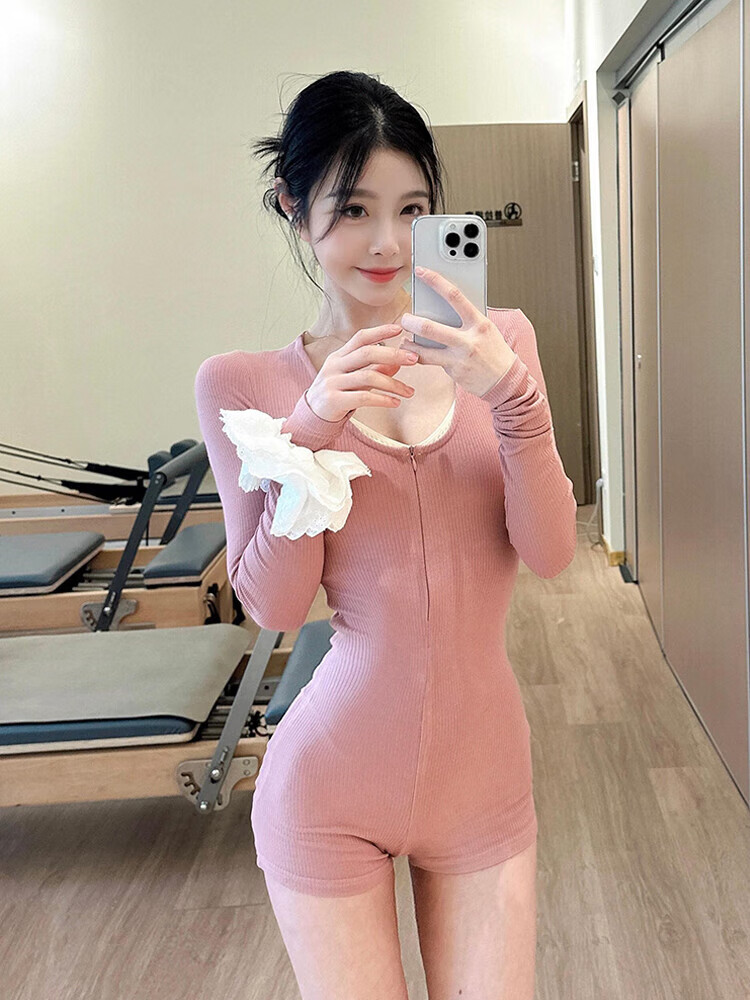 Kangaroo (DAISHU) beautiful yoga clothes for women, Pilates training clothes, one-piece fitness clothes, long-sleeved slimming sports tights, one-piece shorts set, pink one-piece + white vest M (98-110Jin Jin equals 0.5 kg)