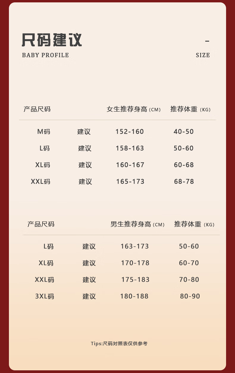 China (cm) 160-165/84-86 165-170 / 88-90 167-172 / 92-96 168-173 / 98-102 170-176 / 106-110