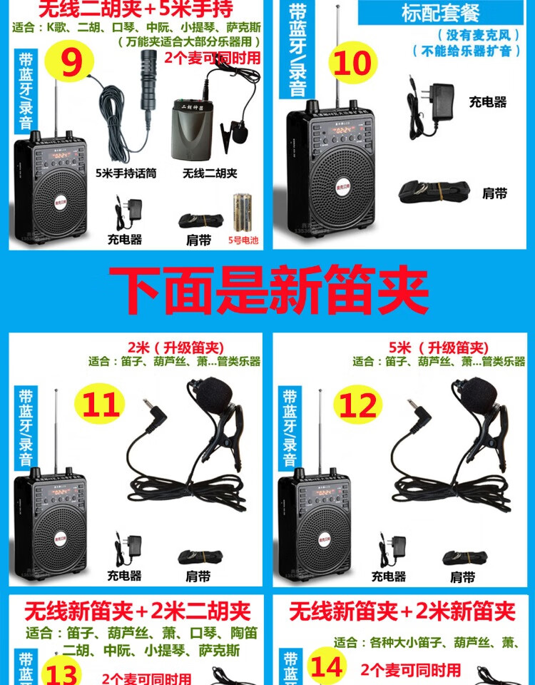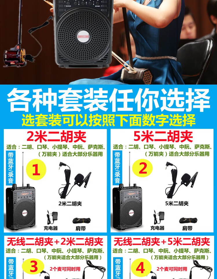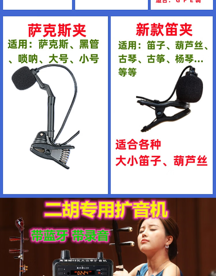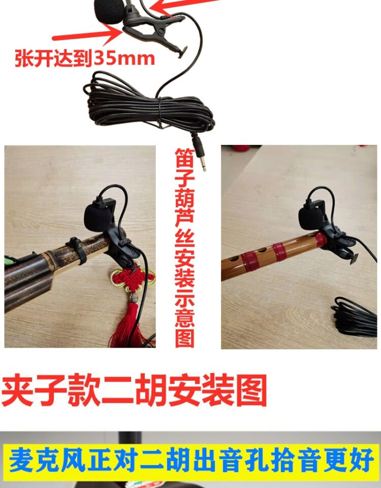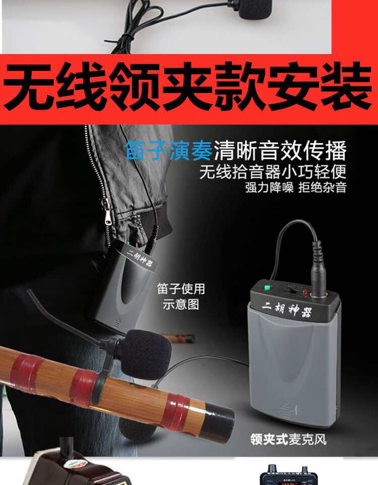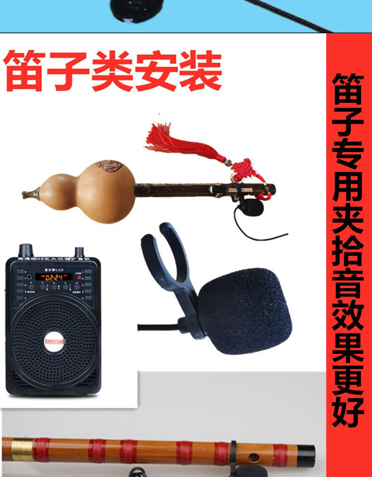 Jinsheng microphone microphone clip is suitable for Erhu, flute, cucurbit flute, saxophone, harmonica, Xiao musical instrument special wireless audio amplifier Bluetooth portable speaker No. 6, wireless headset + 5m Erhu clip, play and sing at the same time