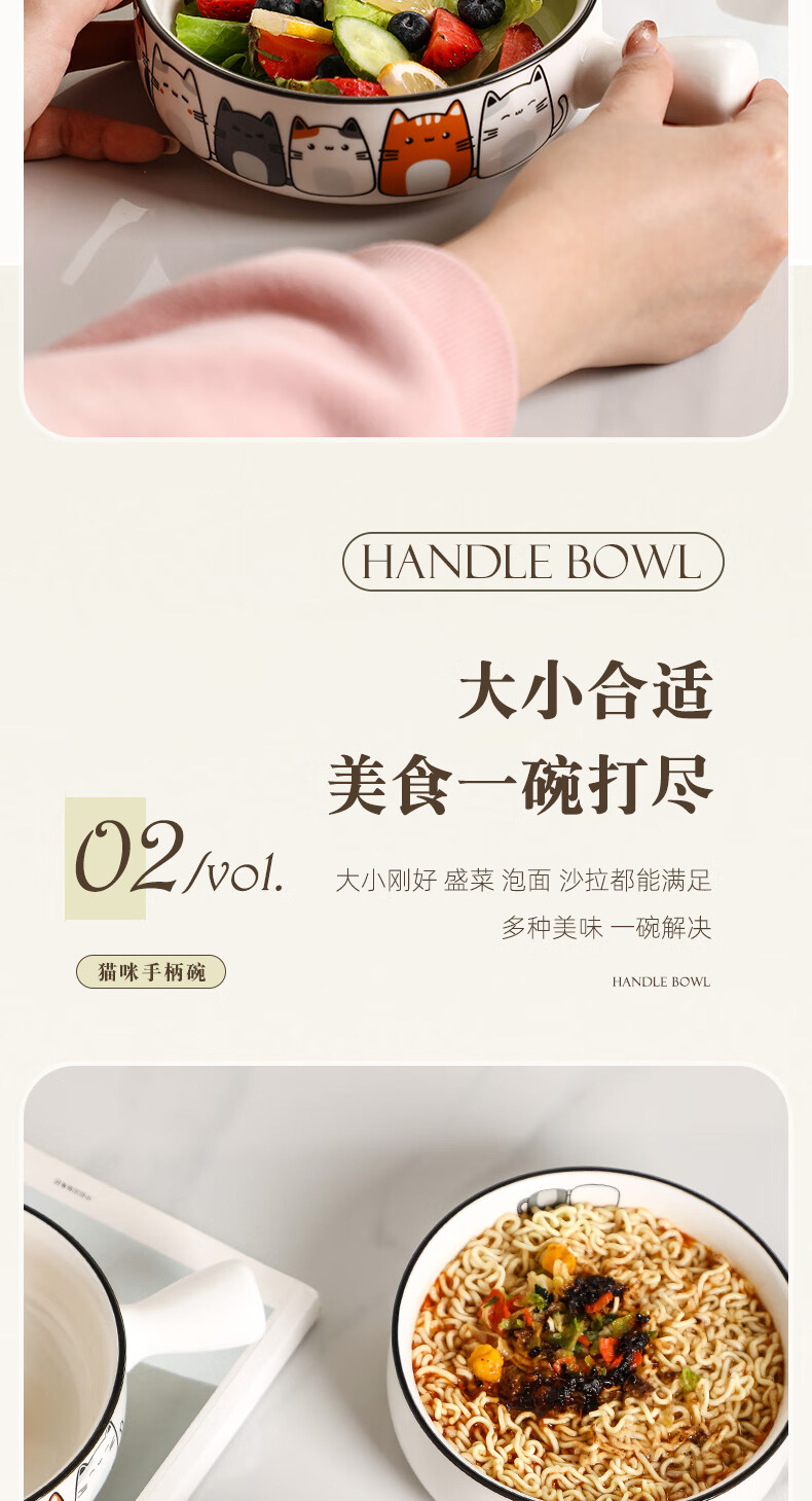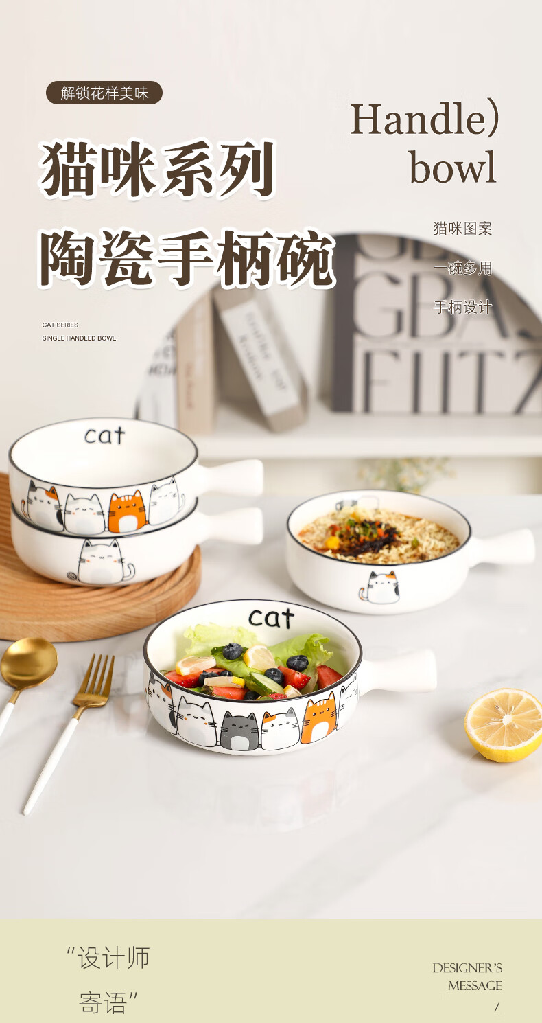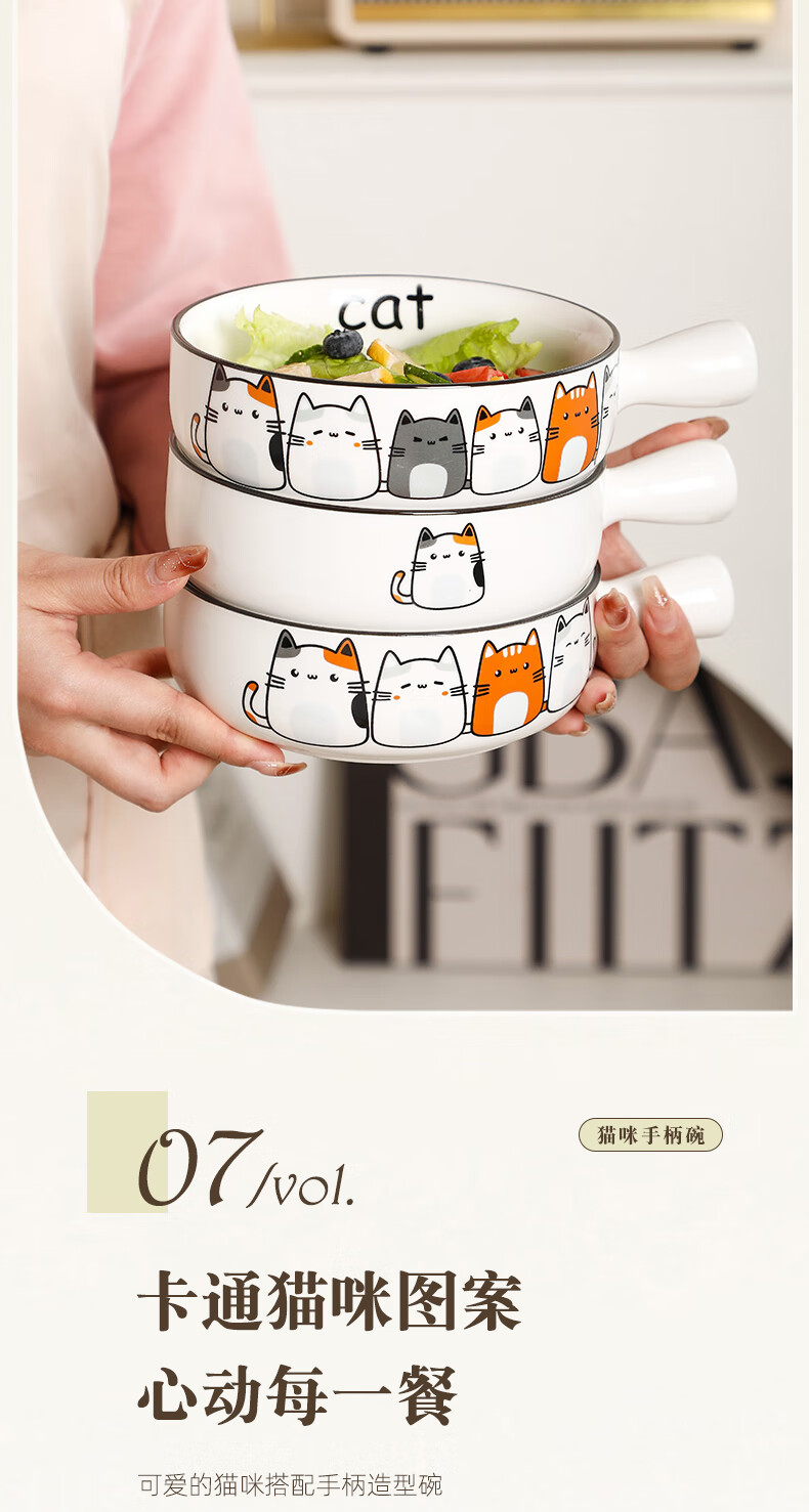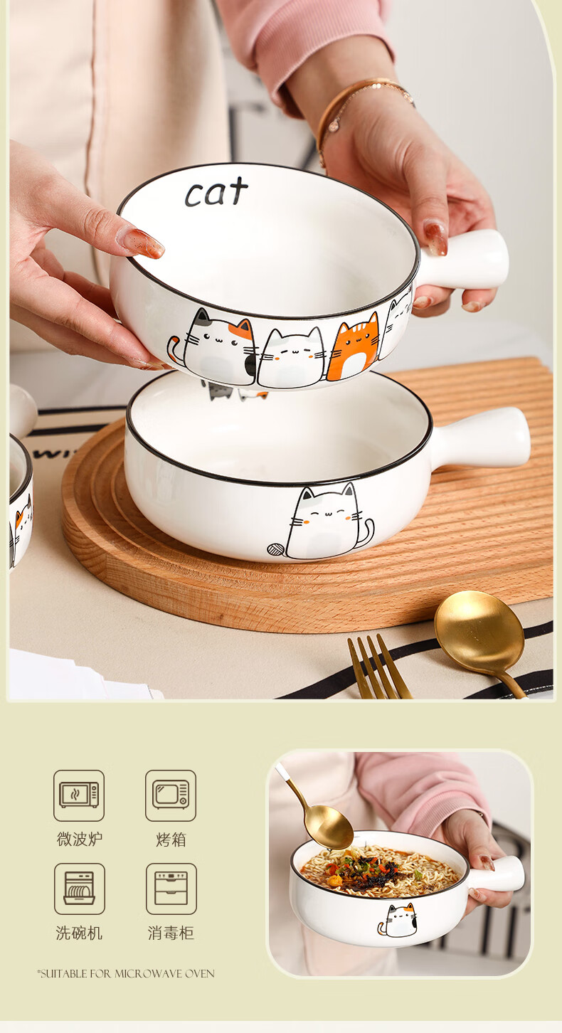Fat Donglai's same style bowl with handle, ceramic instant noodle bowl with handle, student dormitory household, cute cat 2023 new model, handle bowl + lid - four cats