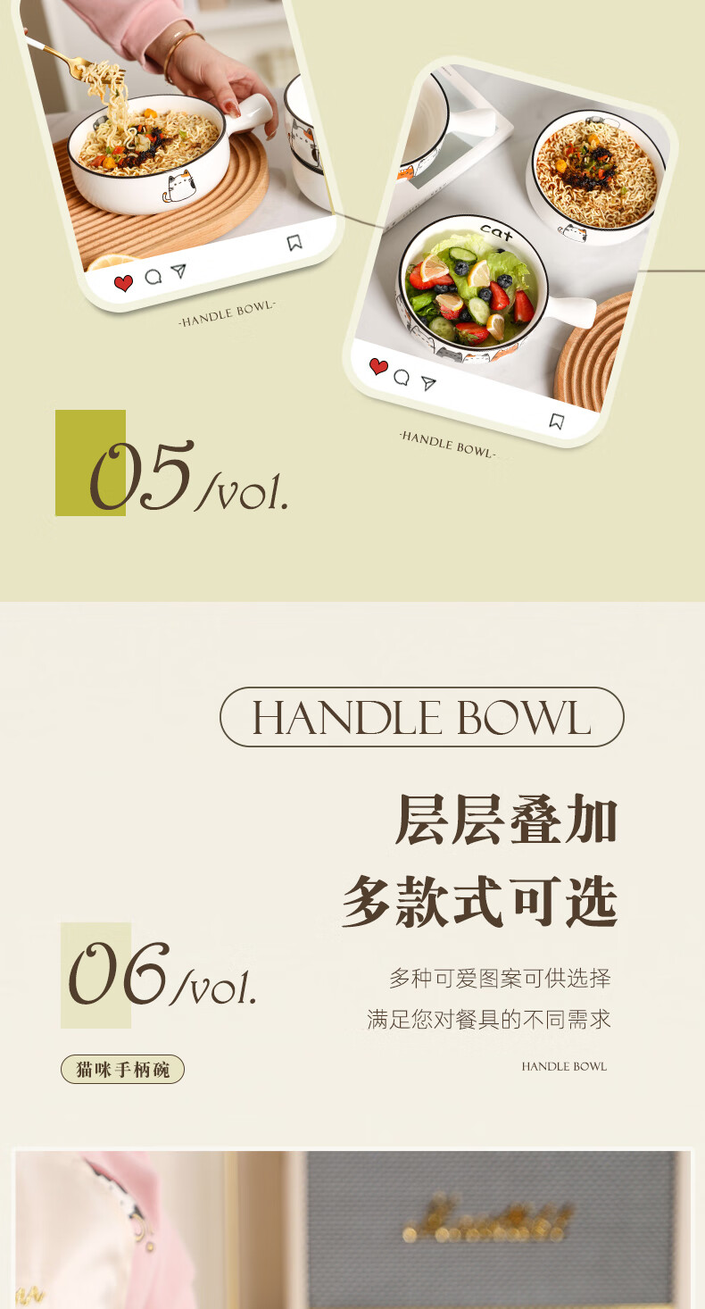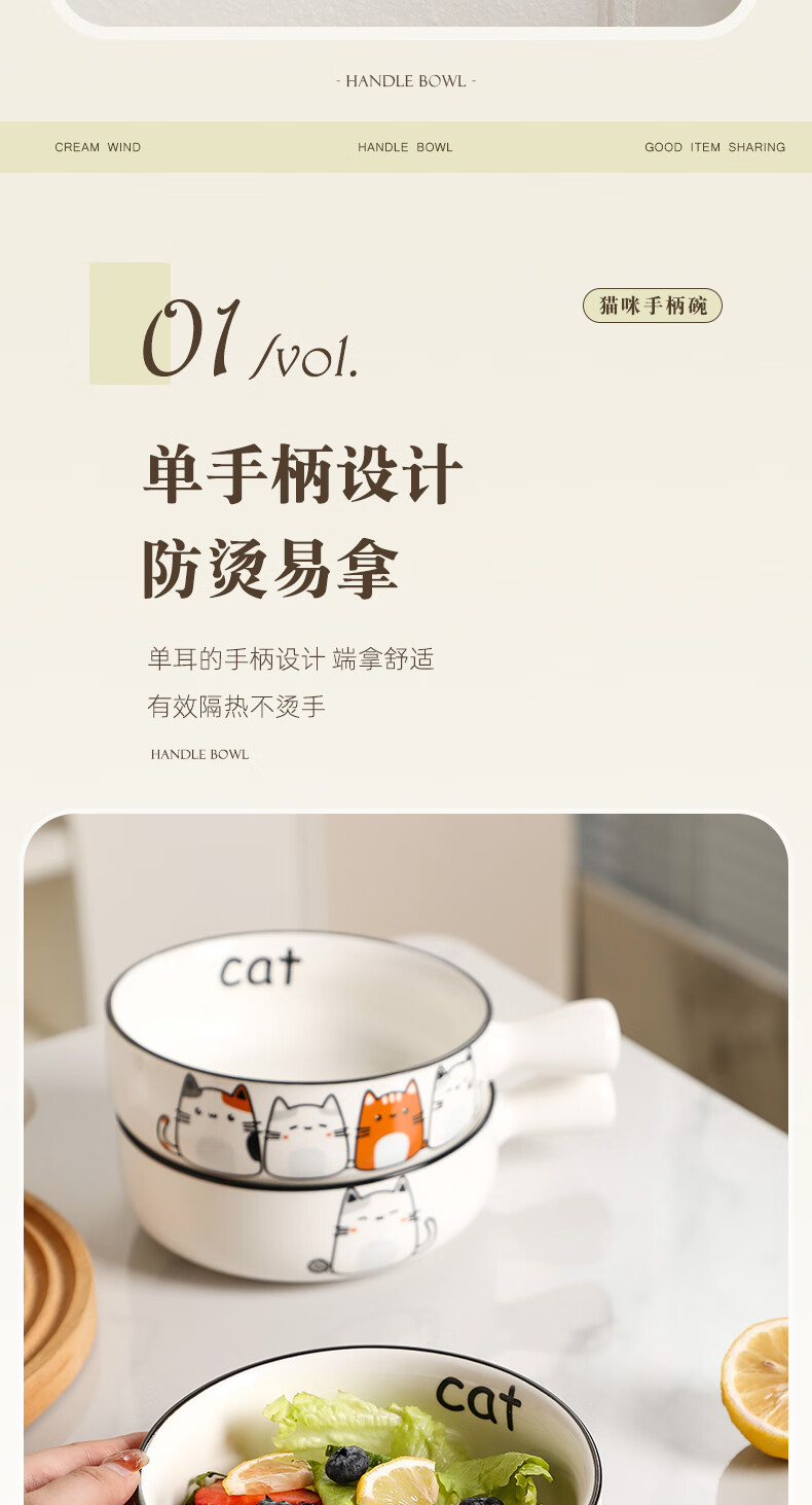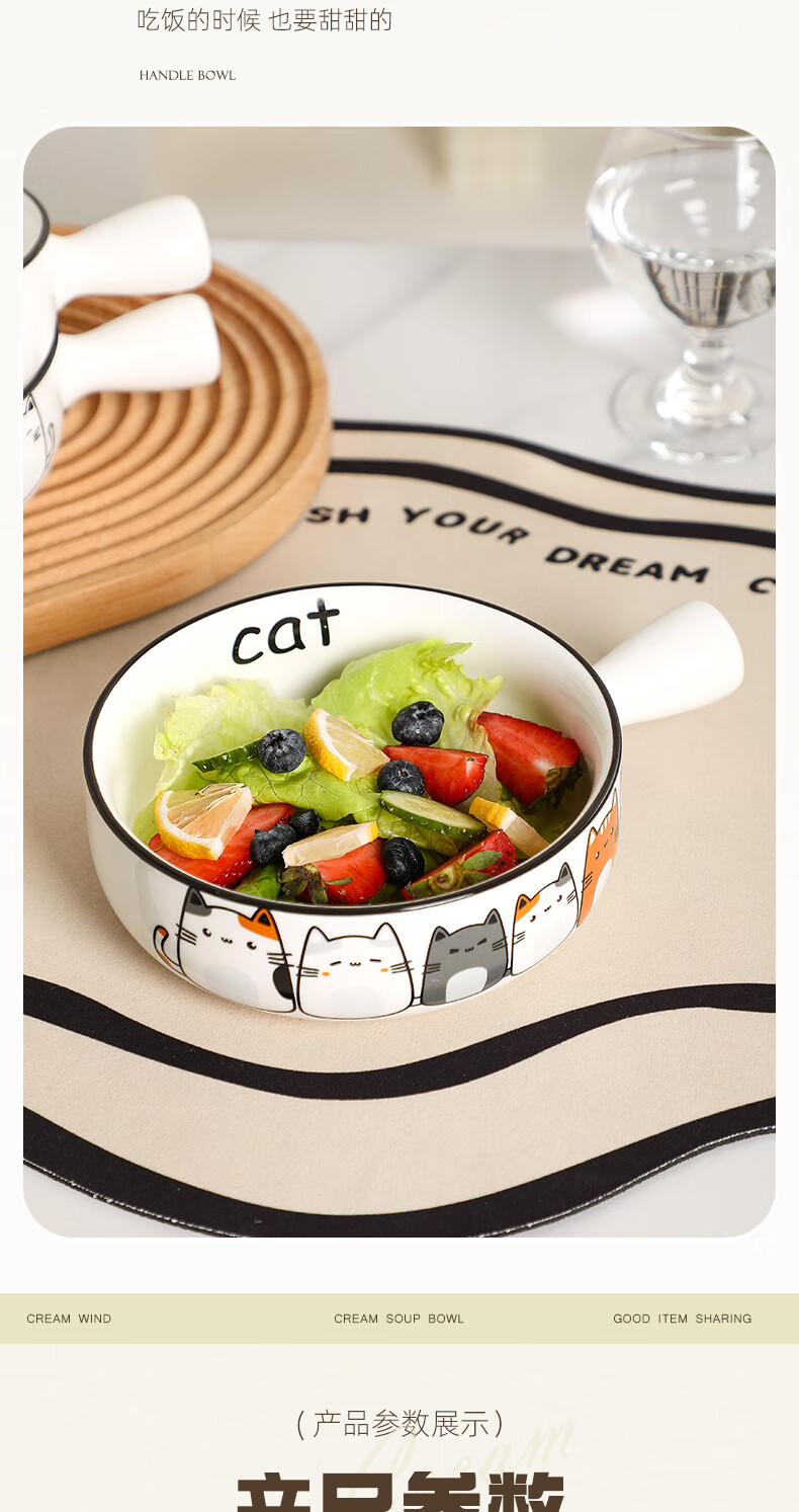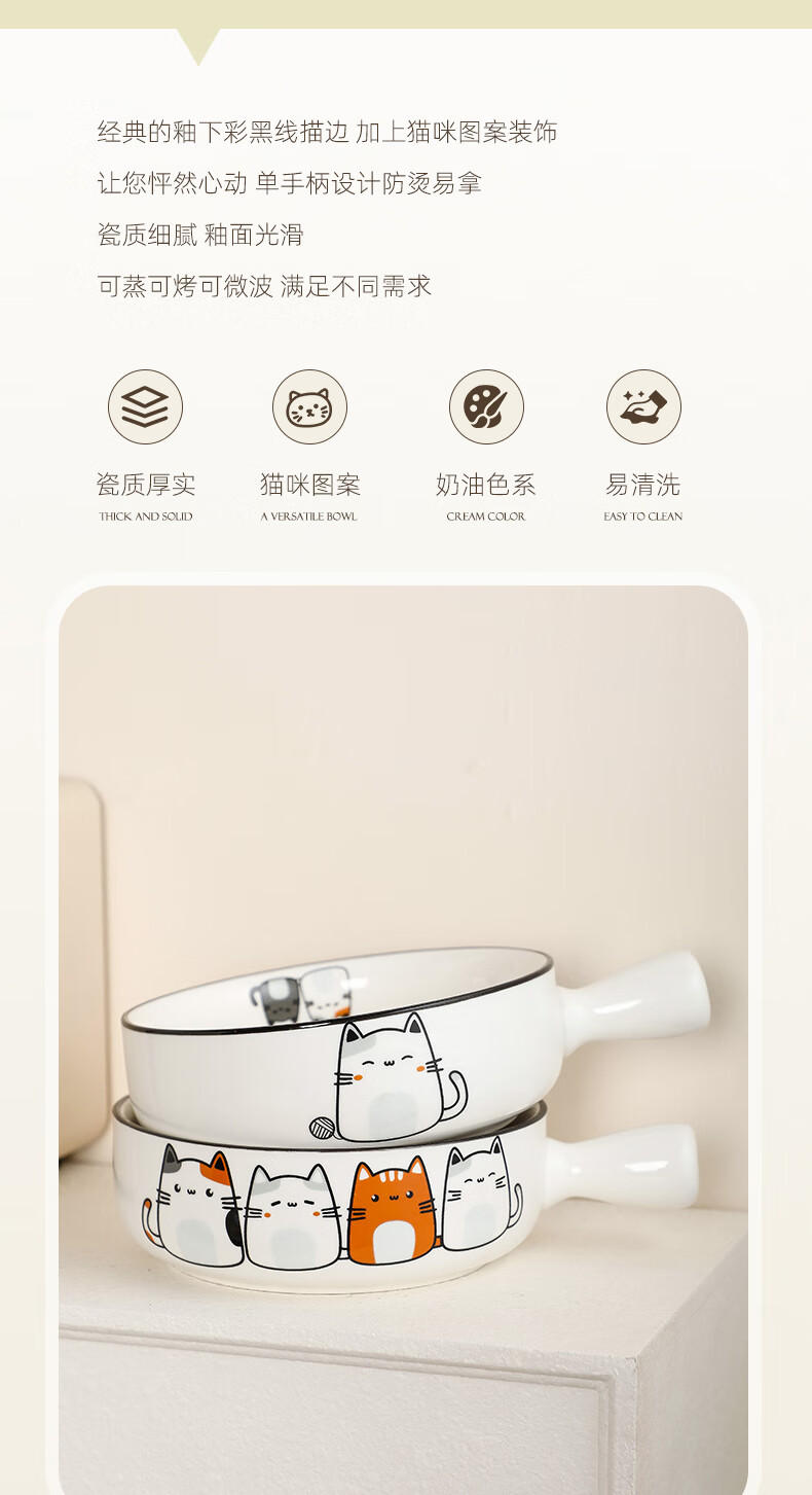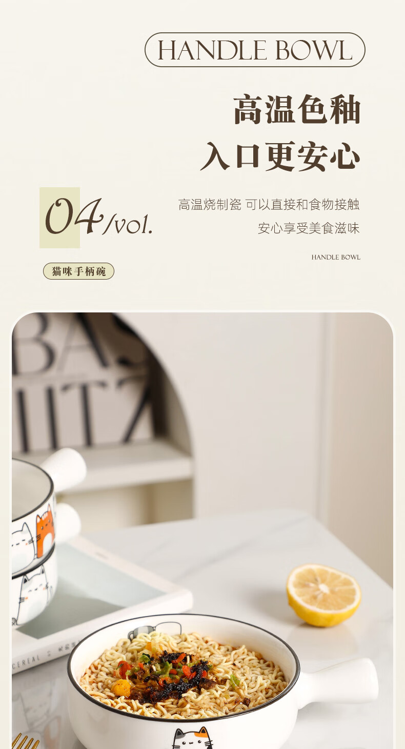 Fat Donglai's same style bowl with handle, ceramic instant noodle bowl with handle, student dormitory household, cute cat 2023 new model, handle bowl + lid - four cats