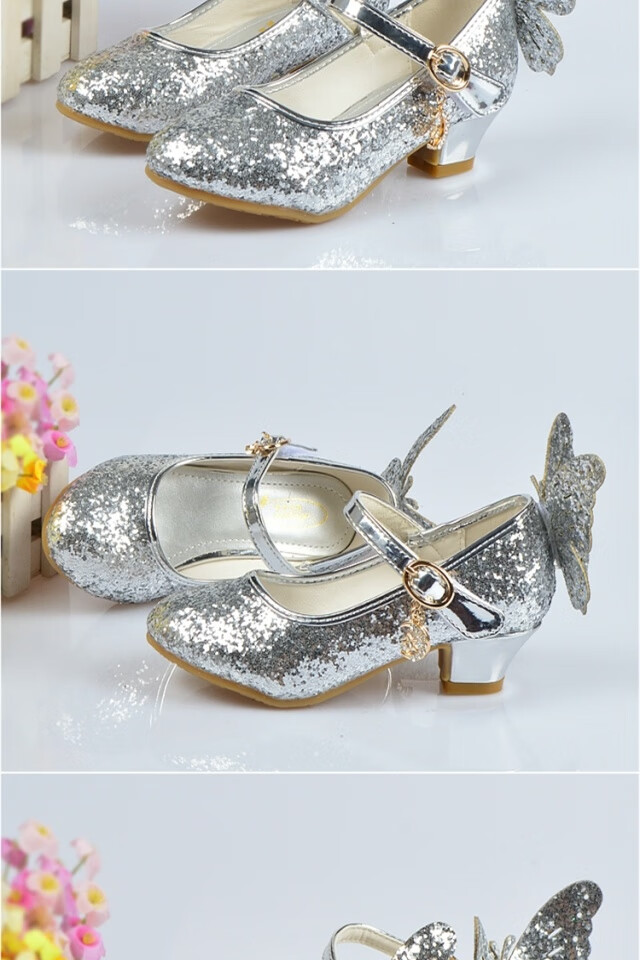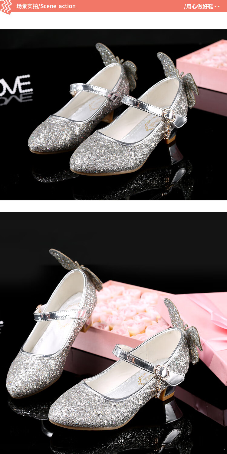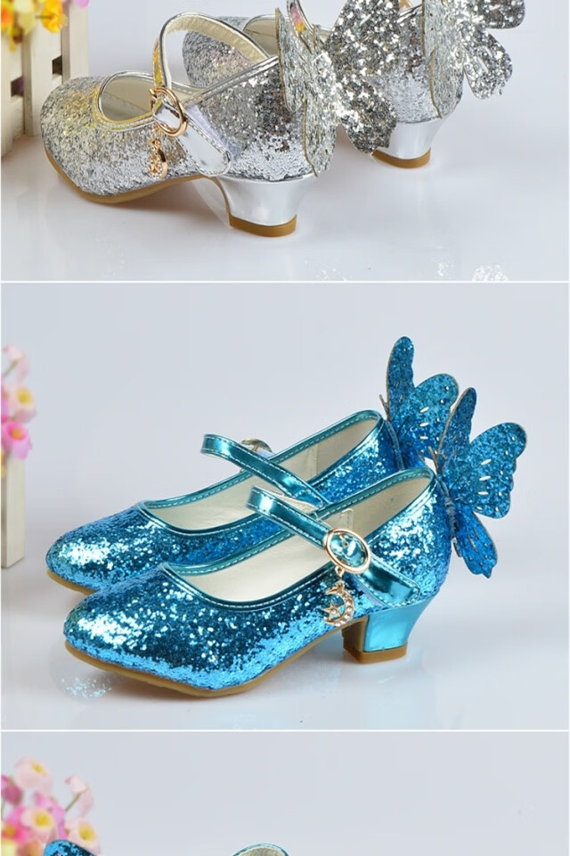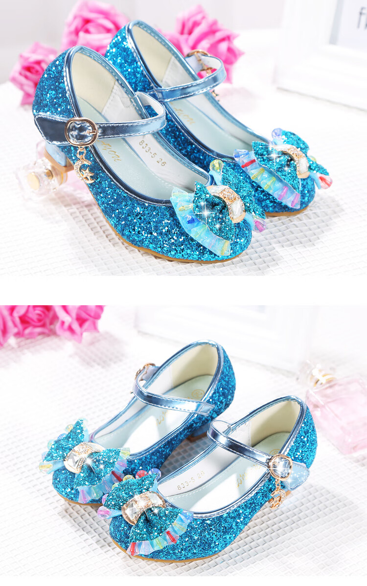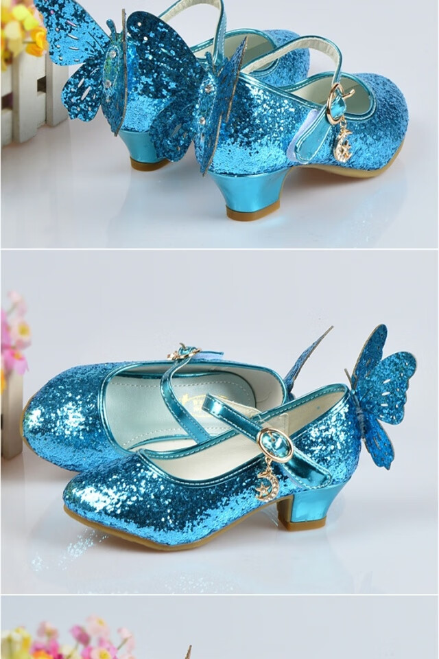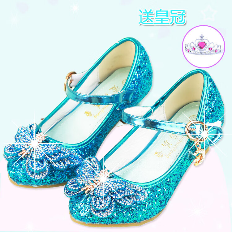 FANCYCHIC New Plus Size Girls High Heels Crystal Performance Leather Shoes Children's High Heels Student Single Shoes Elsa Princess Shoes New Back Butterfly 322-7 Blue 35 Inner Length 22cm