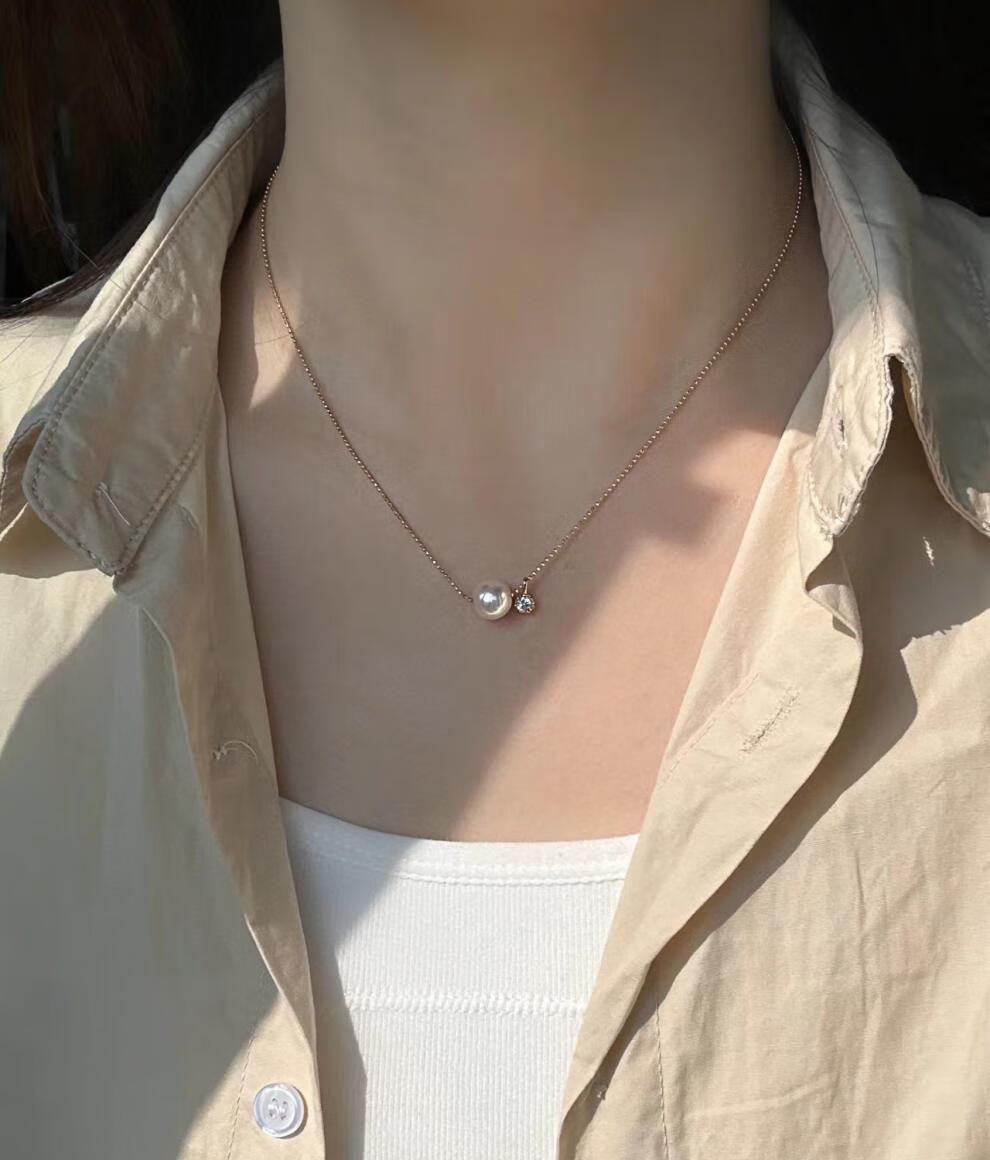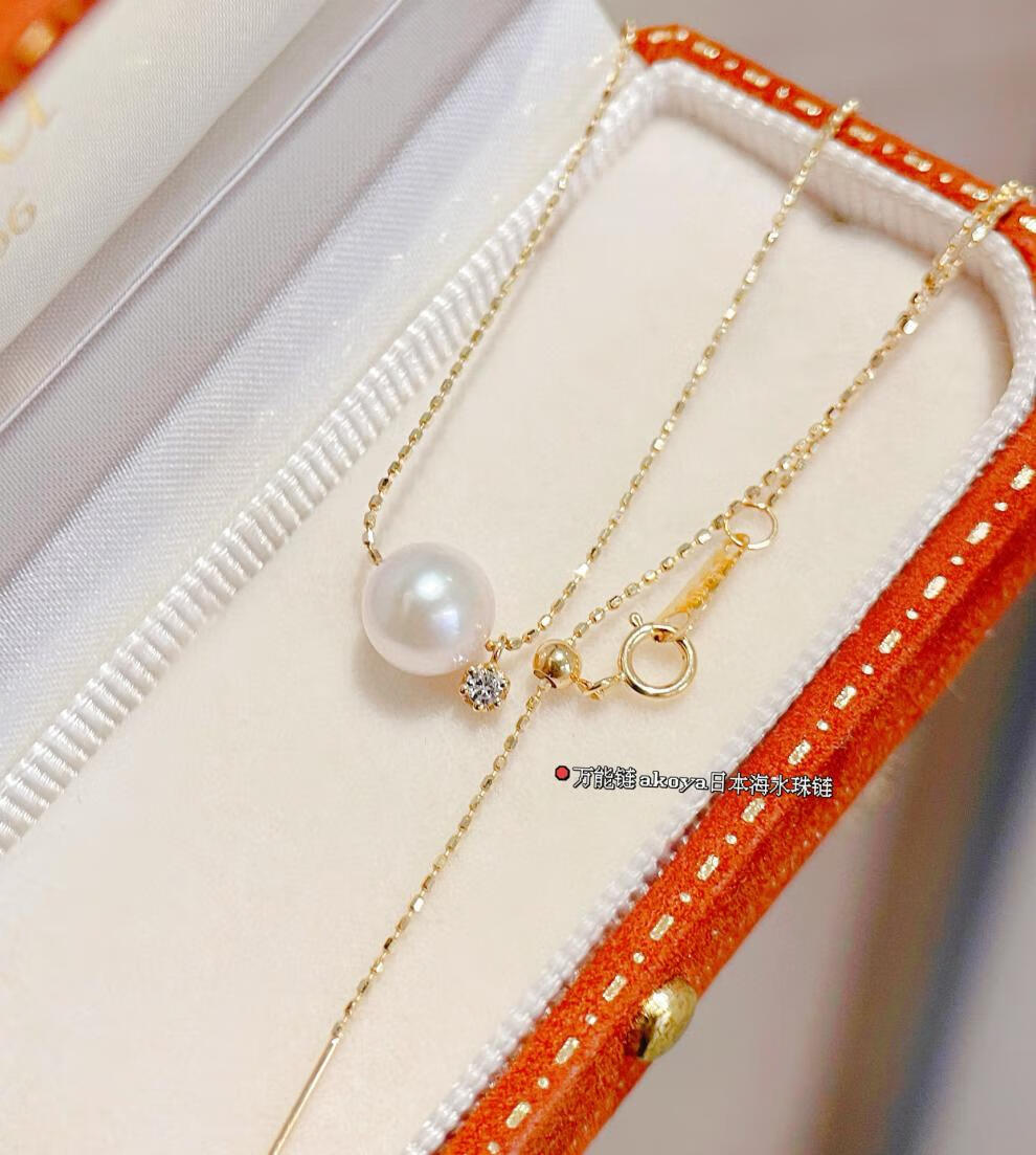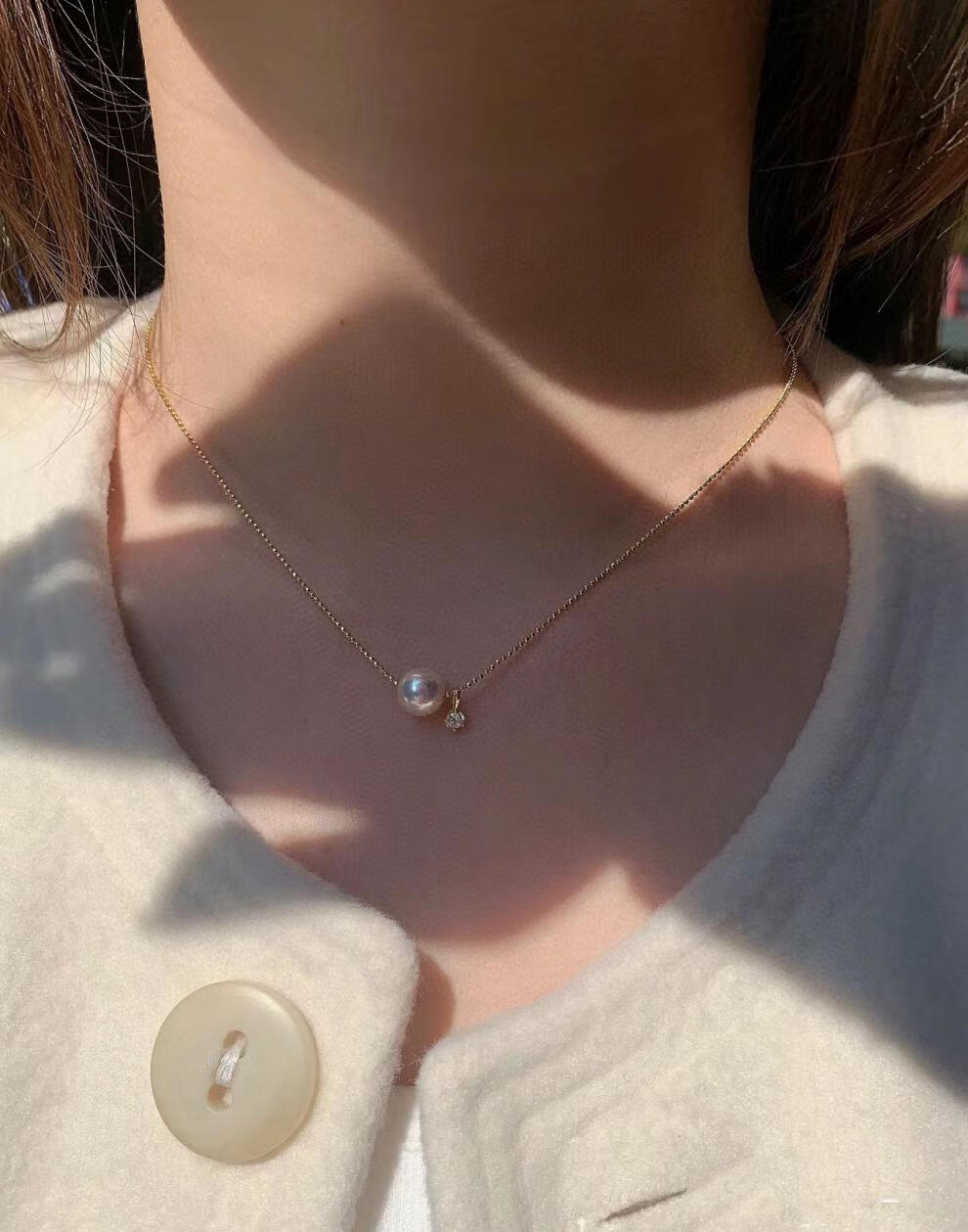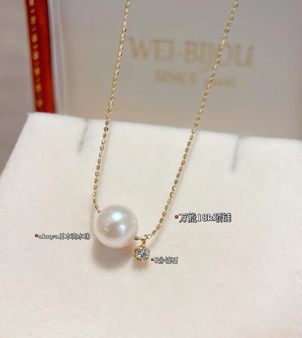 Fat Donglai same style pearl pendant 18k 18K yellow Akoya sea water pearl necklace female style French simple diamond pendant 18k yellow 6-8mm x 45cm