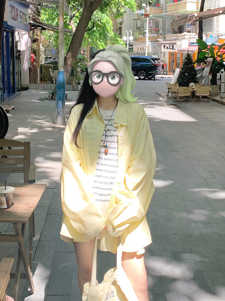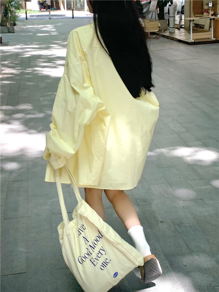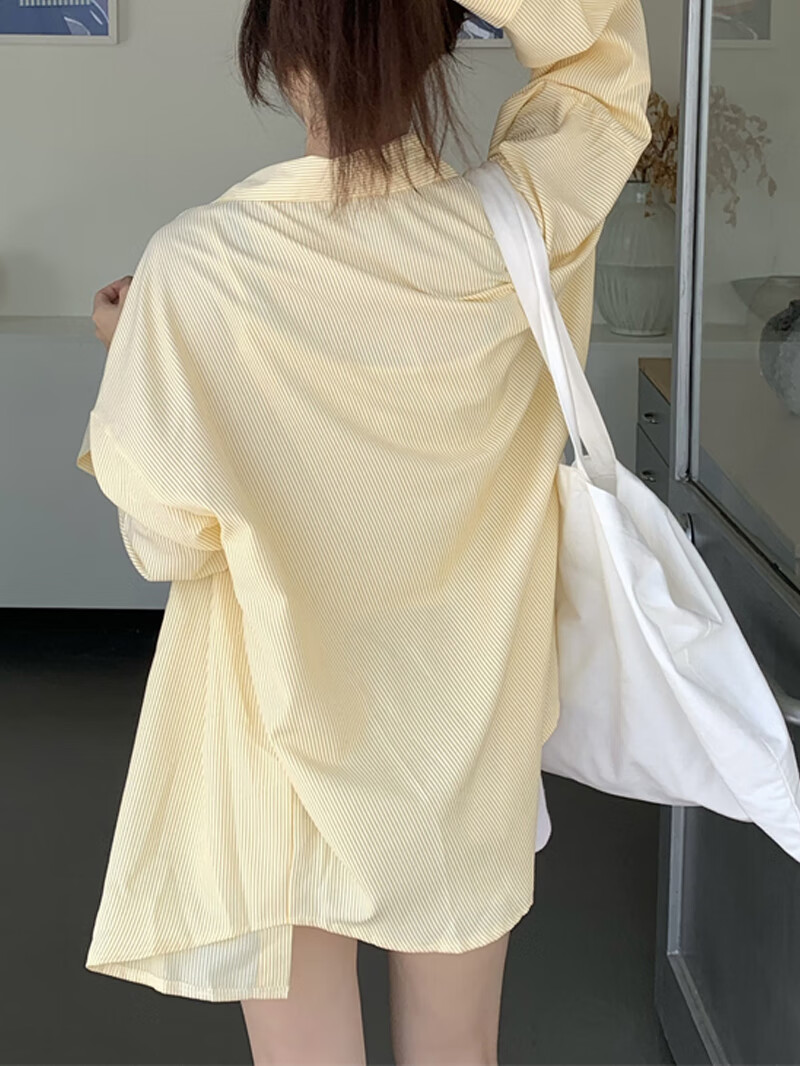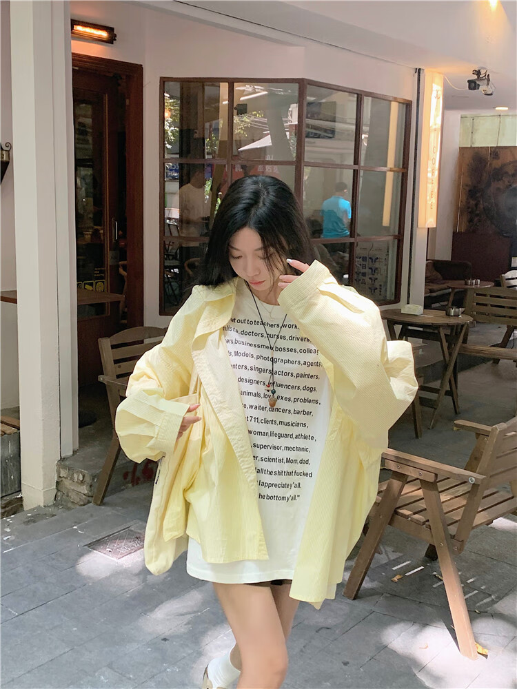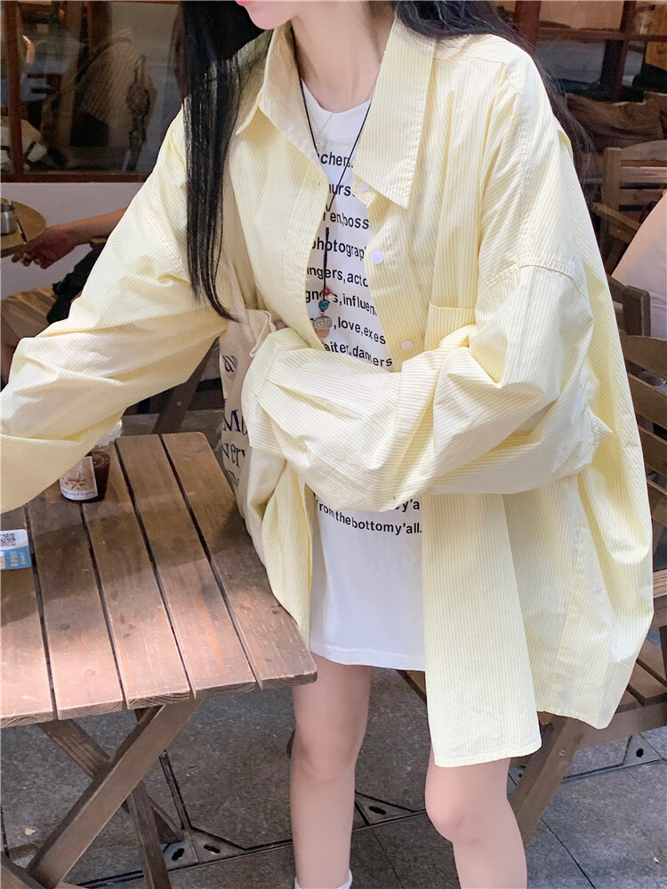 Jin Jin is equal to 0.5kg. Mu cream yellow striped shirt for women Korean style ins casual style early autumn wear loose design sun protection jacket light yellow-one size