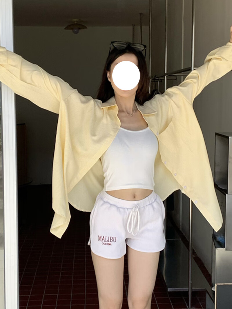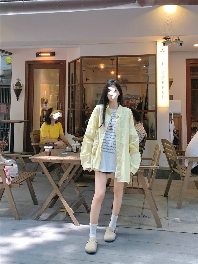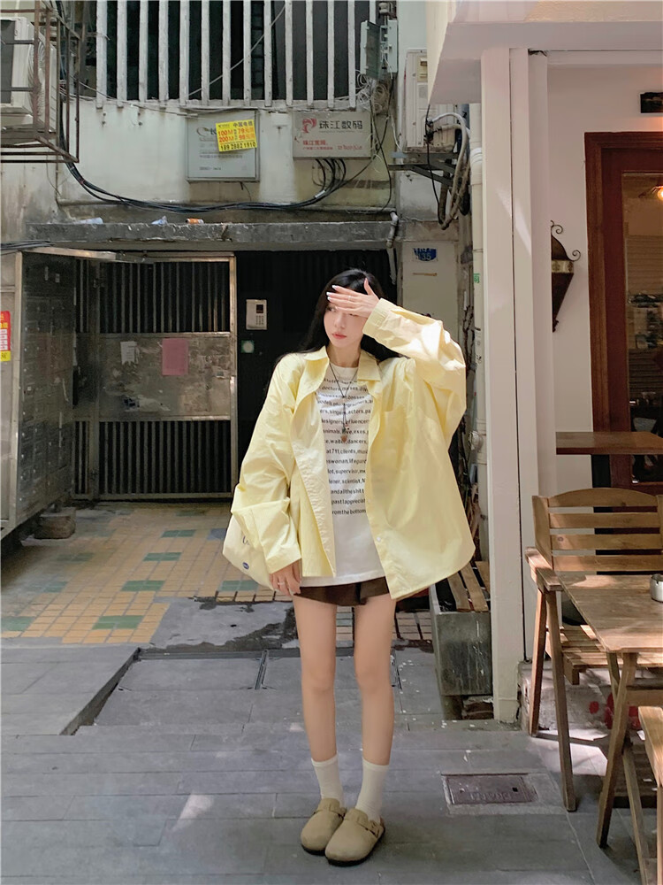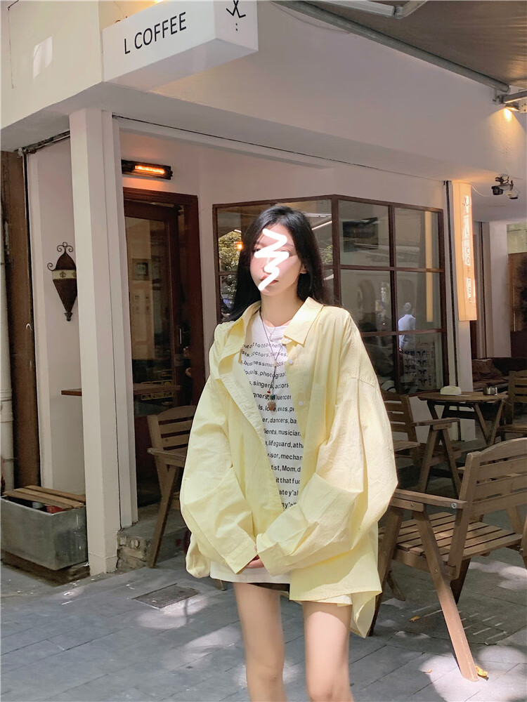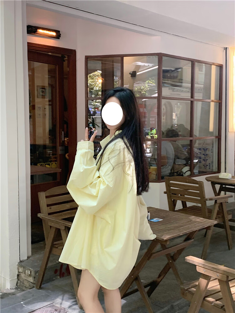 Jin Jin is equal to 0.5kg. Mu cream yellow striped shirt for women Korean style ins casual style early autumn wear loose design sun protection jacket light yellow-one size