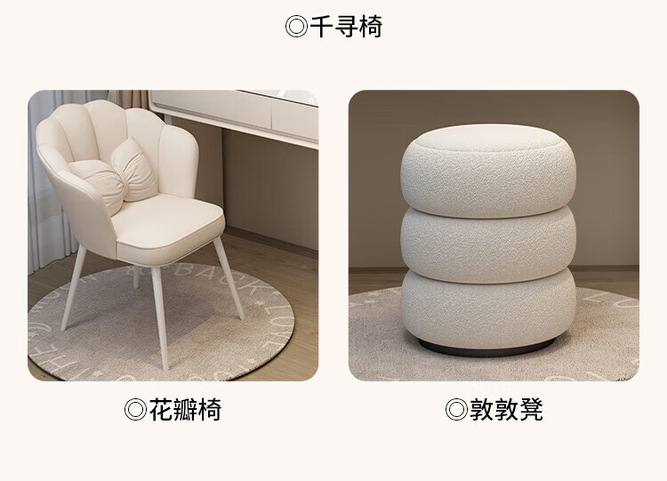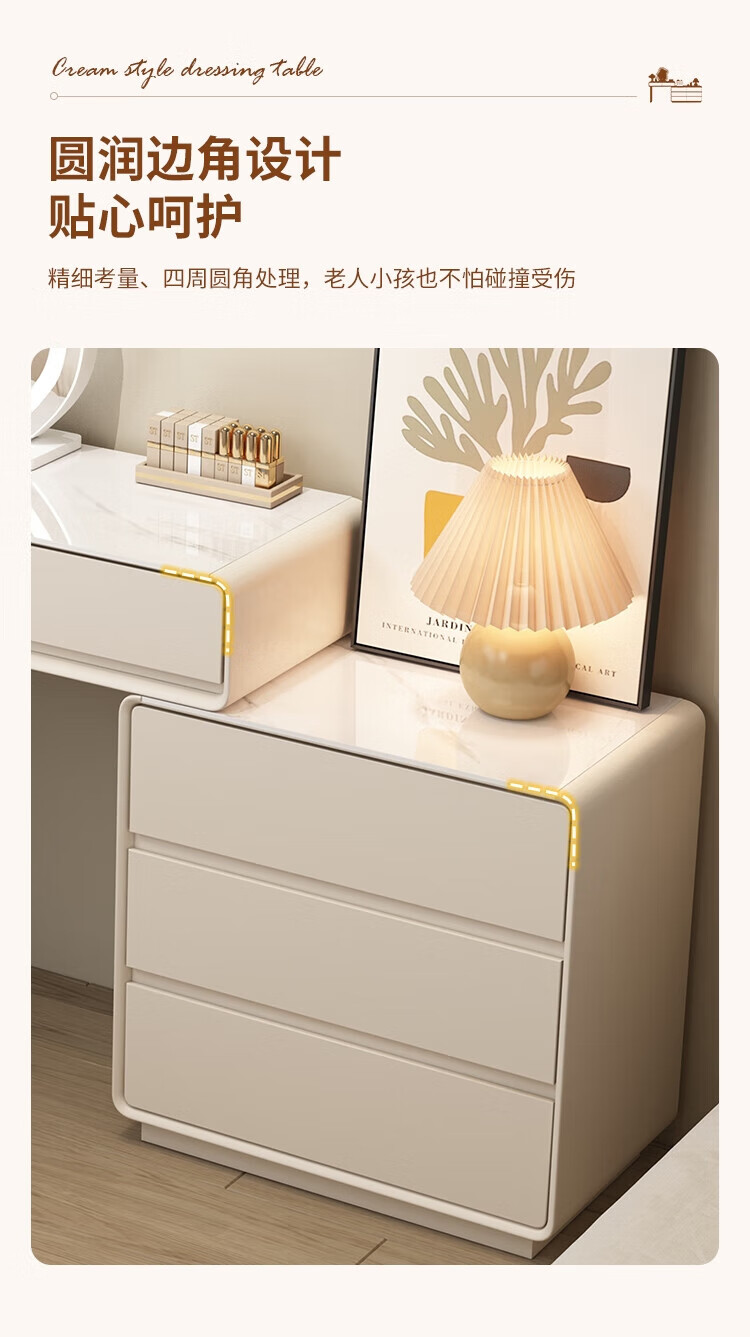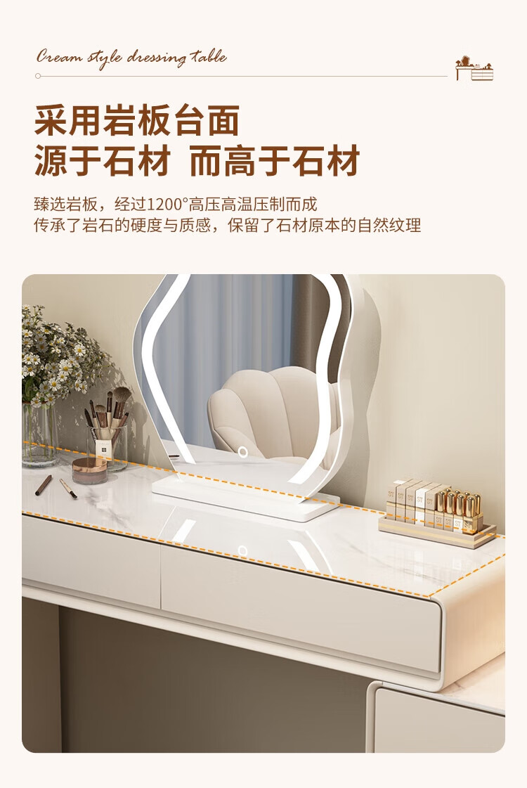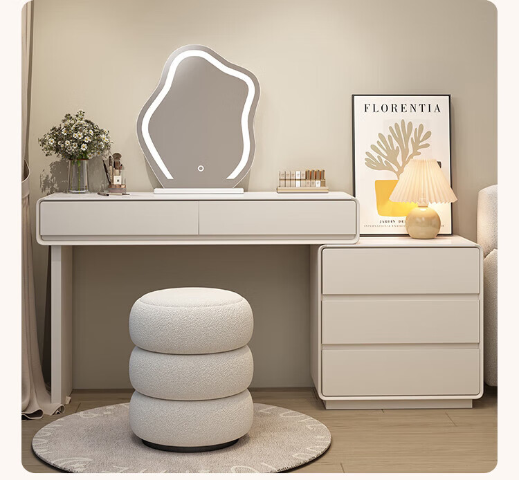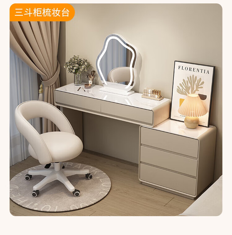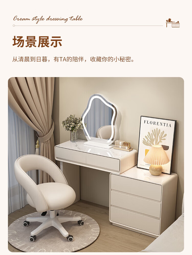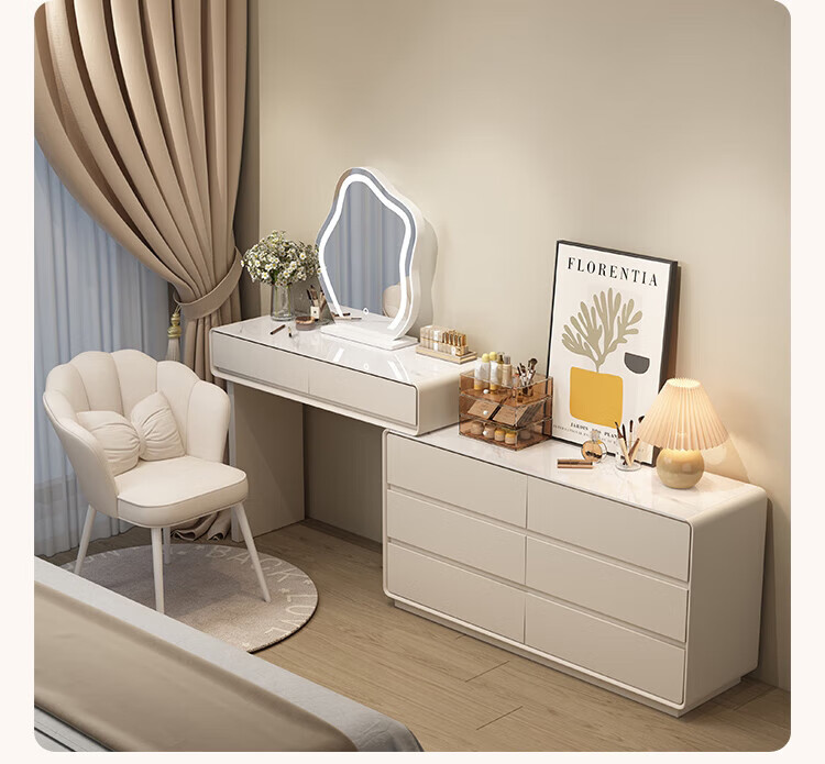 Xinang Dressing Table Modern 2025 Cream Style Slate Bedroom Simple New Light Luxurious Style Solid Wood Dressing Table and Cabinet In One 80cm White + Three Drawer Cabinet + Cloud Mirror + Petal Chair